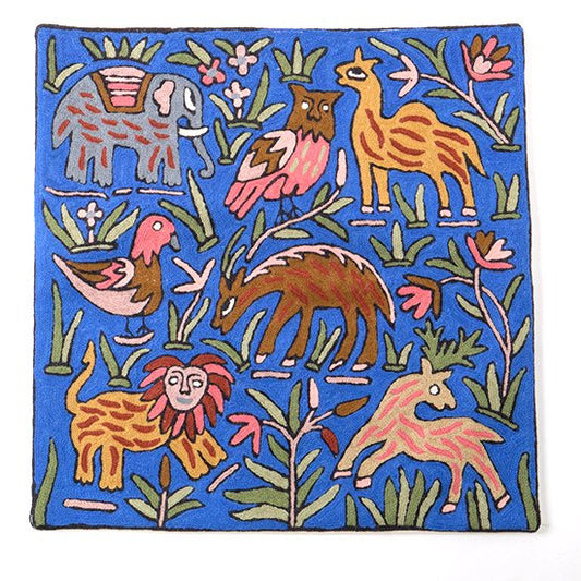 R-WA4545AN_0001アニマル 手刺繍クッションカバー 45cm×45cm (ブルー)