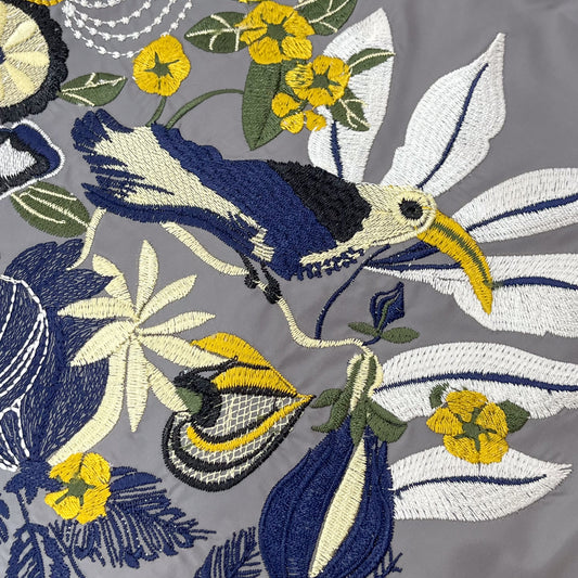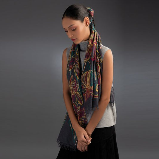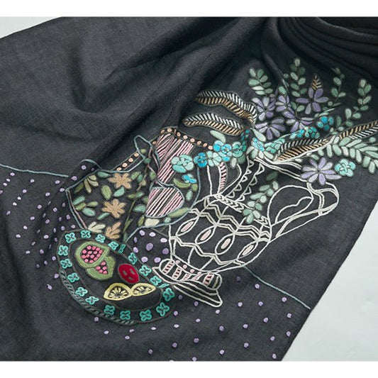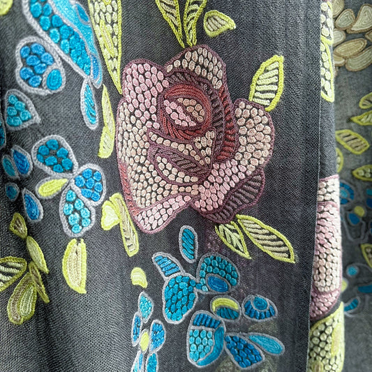 S-WTAN5000_0093FLOWERS IN GENOVA 薄手ウール&シルク アリー&ニードル手刺繍ストール(ダークグレー)