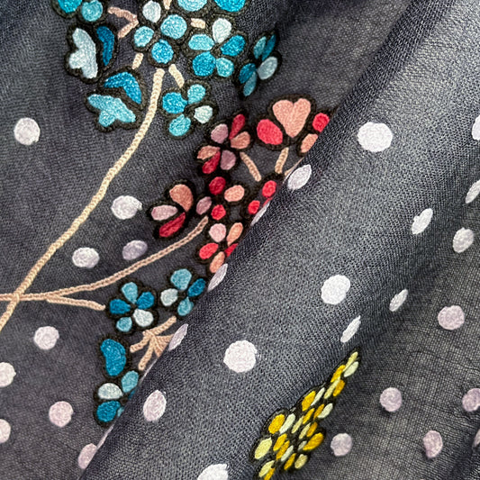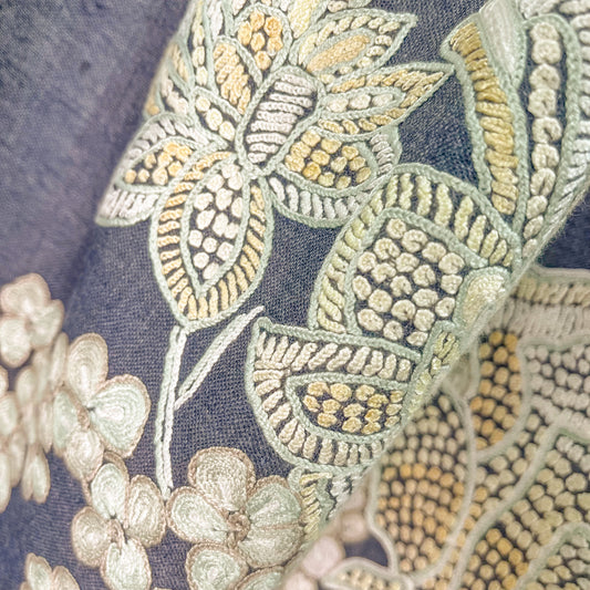 S-WTA2558_0093フラワーモチーフ 薄手ウール&シルク アリー手刺繍ストール (ダークグレー)
