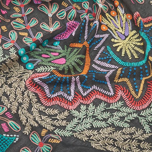 S-WTA9046_1535Flower Celebration 薄手ウール&シルク アリー手刺繍ストール(ブラック/マルチ)