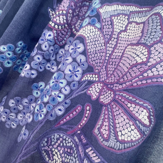 S-WTAN5000_0012FLOWERS IN GENOVA 薄手ウール&シルク アリー&ニードル手刺繍ストール(ネイビー)