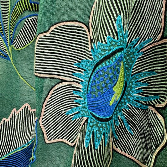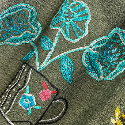 S-WTA9043_0063Fusion Flowers ウール&シルク アリー手刺繍ストール (ダークグリーン)