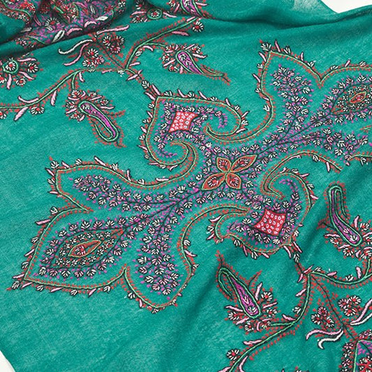 S-WTN2509_0513ウール&シルク ニードル手刺繍ストール (グリーン/ターコイズ)