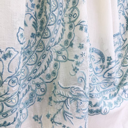 S-WTA3006_1300Lace 薄手ウール&シルク アリー手刺繍ストール (ホワイト/ライトブルー)