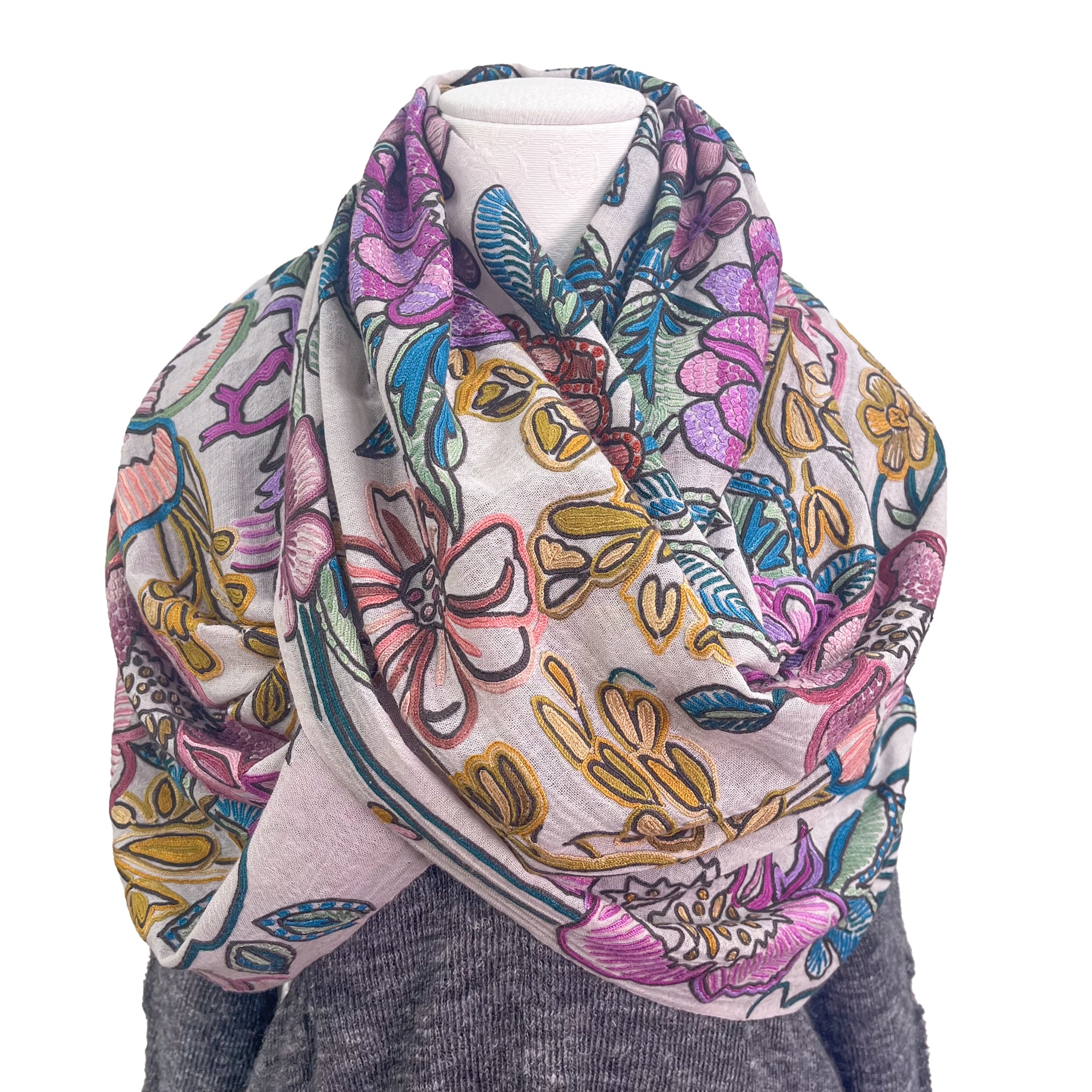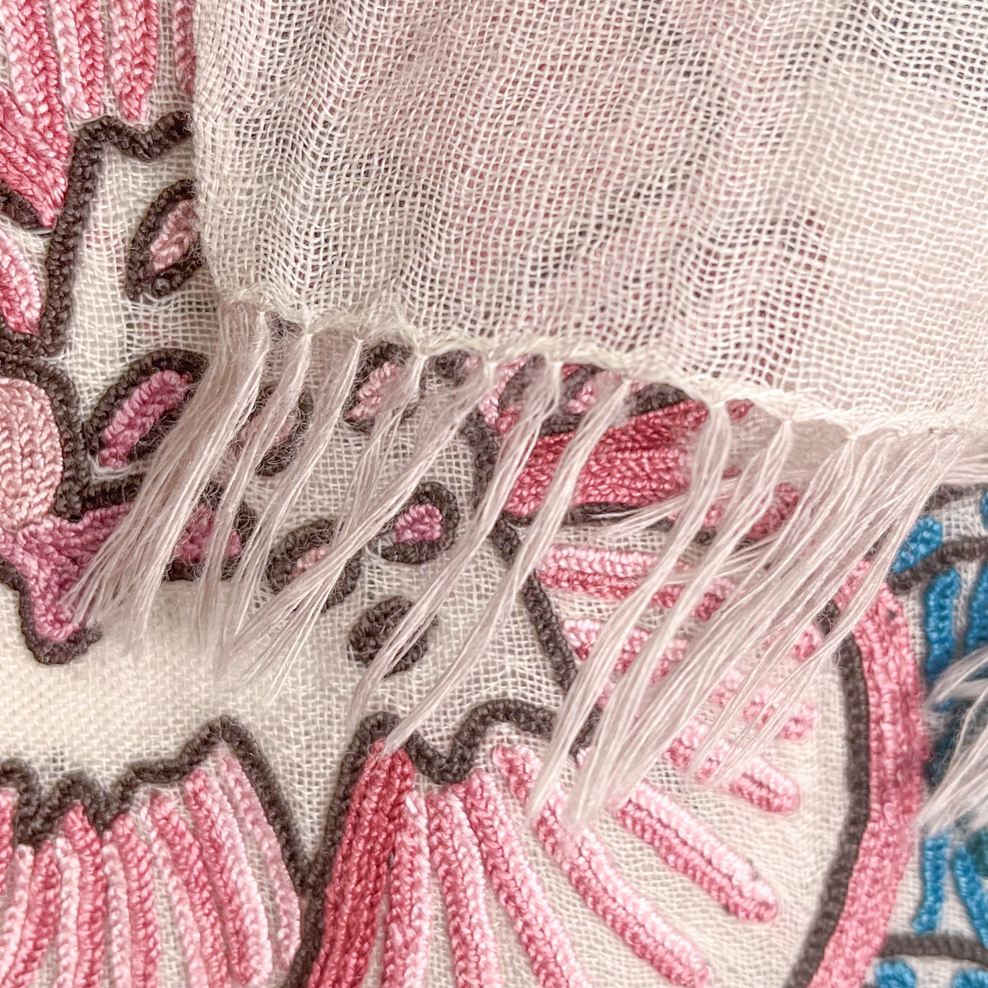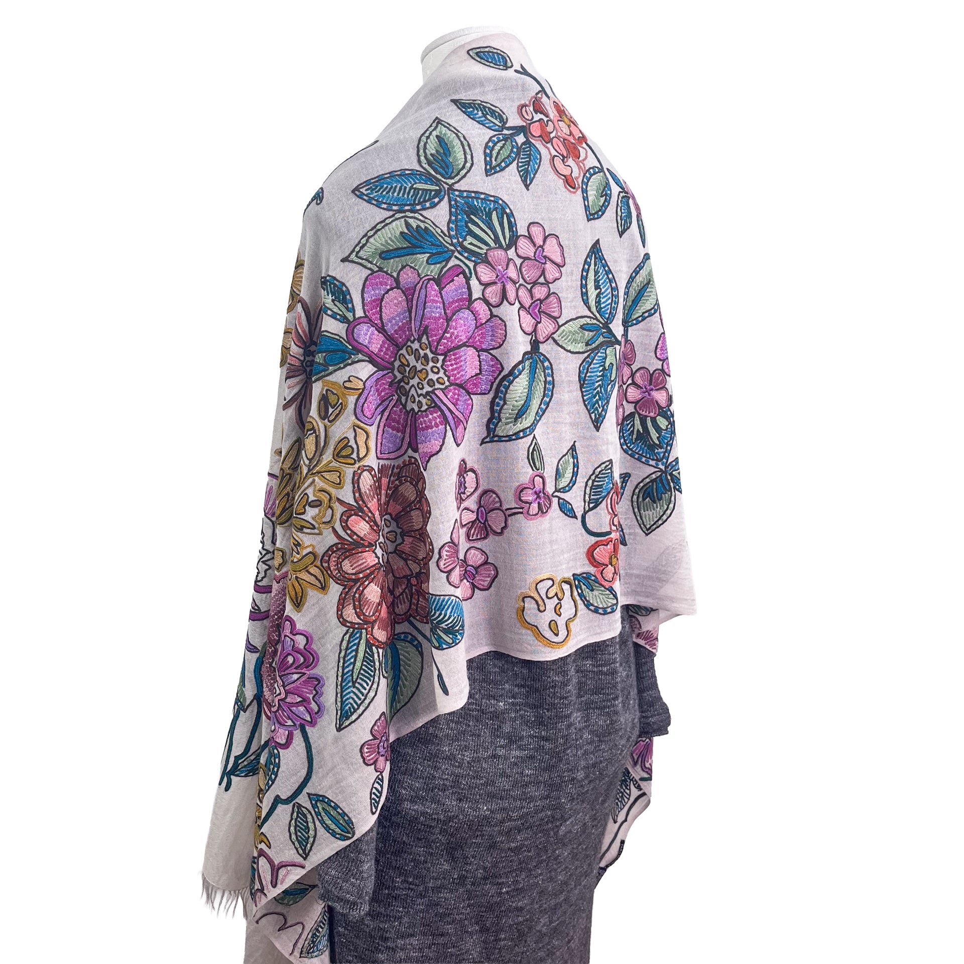 The entire piece is decorated with large flowers, with intricate patterns and curves, created using the artisan's outstanding skills. The artistic and dynamic design has been cultivated as a traditional craft, and the detailed handwork, which can be called artisanal skill, makes it even more beautiful and valuable. The wool/silk material is sheer, so it can be used all year round in any season. The smoky light pink color is very elegant, and the all-over hand-embroidered pattern has a strong presence, so you can wear it with confidence at parties and formal occasions. We recommend bringing it with you when you travel, as it can instantly change the look of your clothes with just one piece.