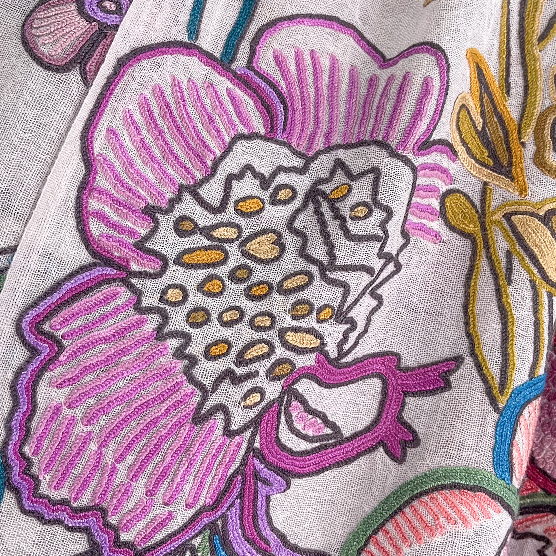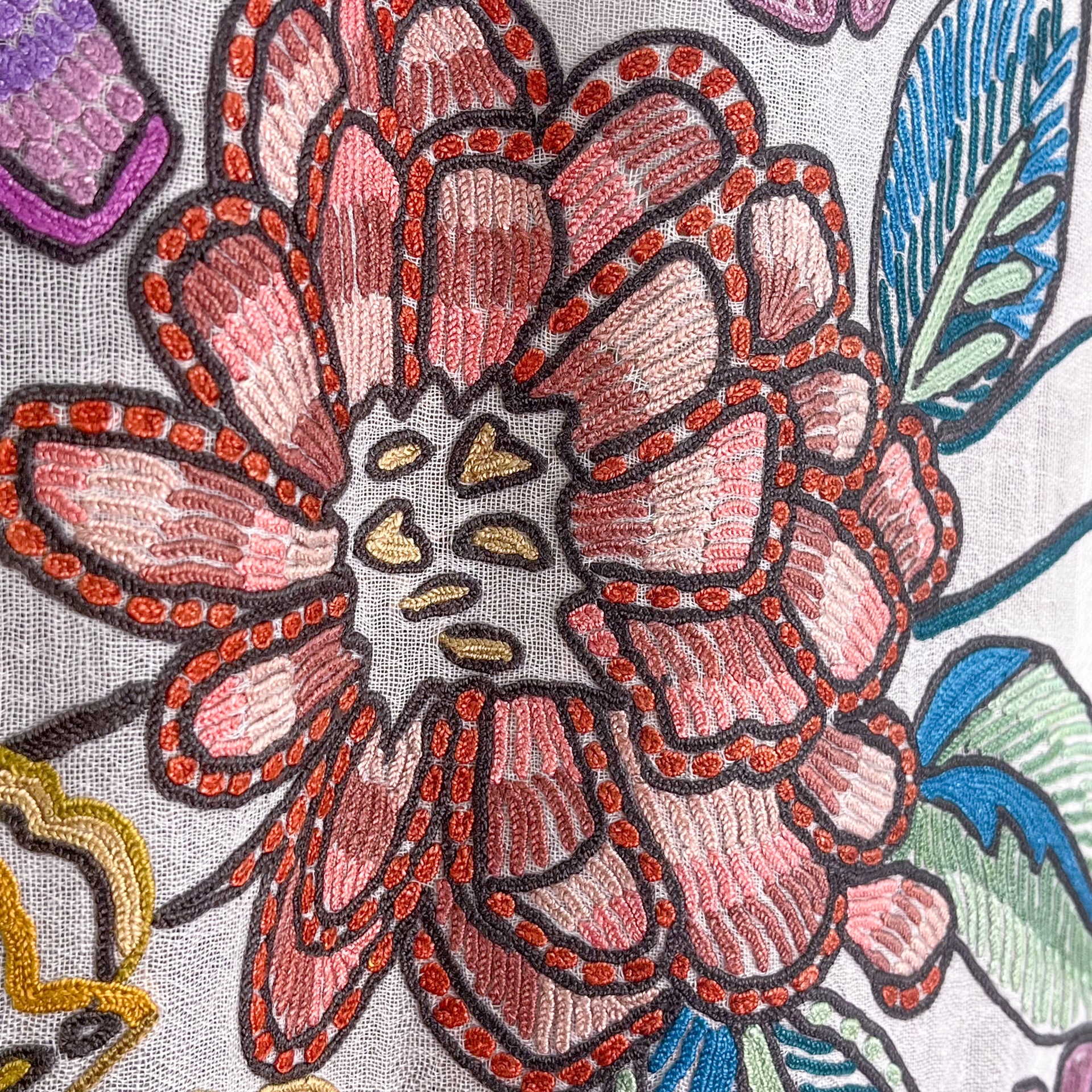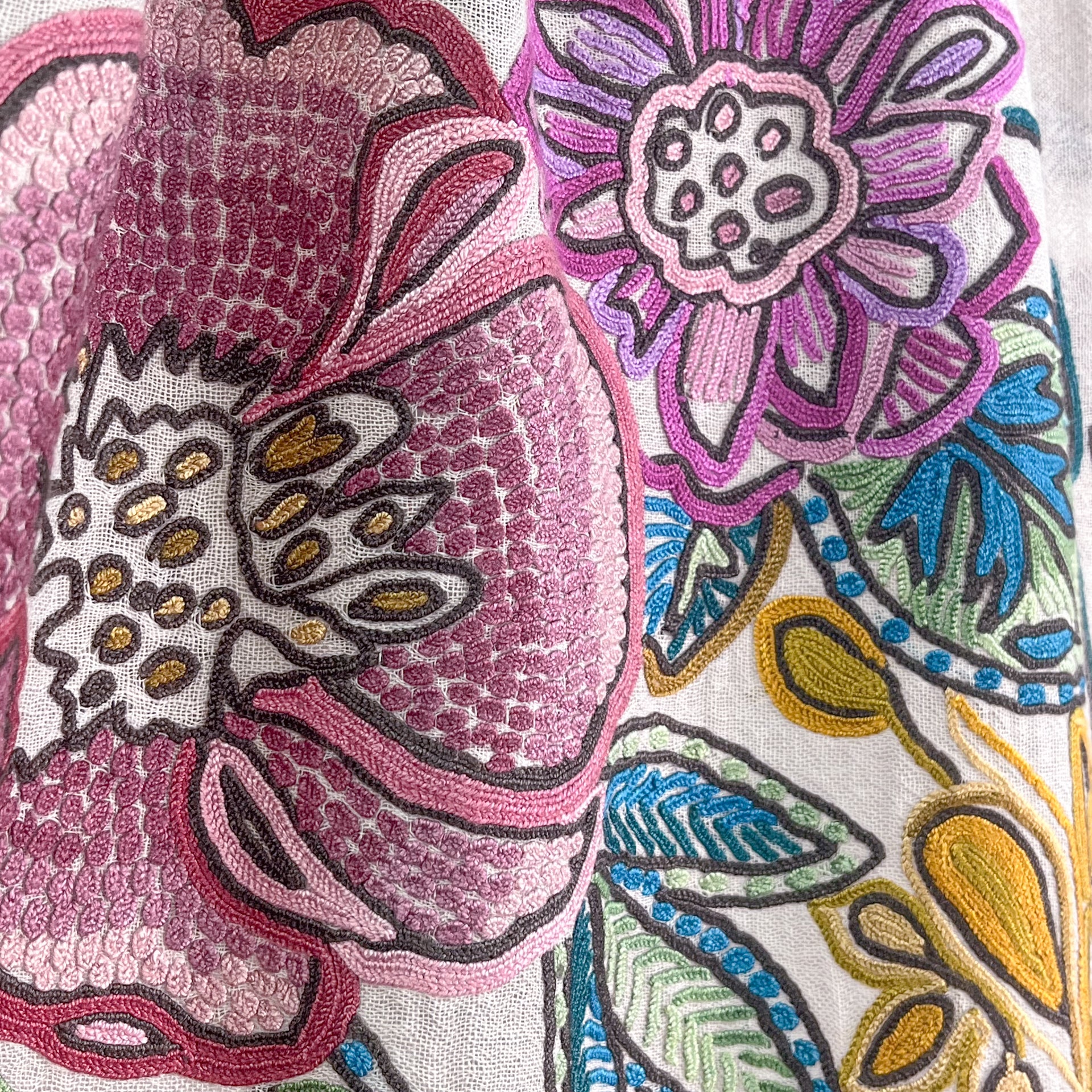 花、湖、山、美しいカシミールの大自然からのインスピレーションを受けたカシミール地方の伝統技術で、細い鉤針を使い下から糸をすくって刺繍します。