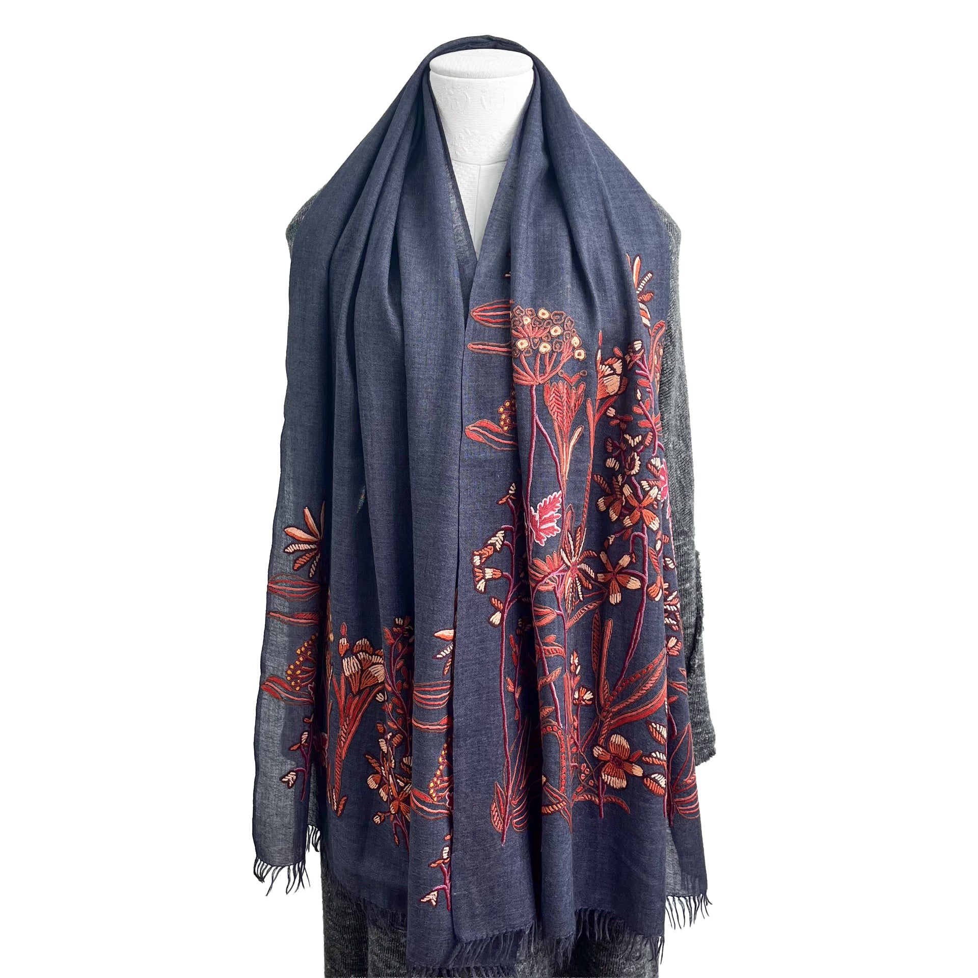 Botanical pattern, thin wool & silk, Ally hand embroidered stole, 60cm x 195cm (fuchsia pink), S-WTA3033_0034