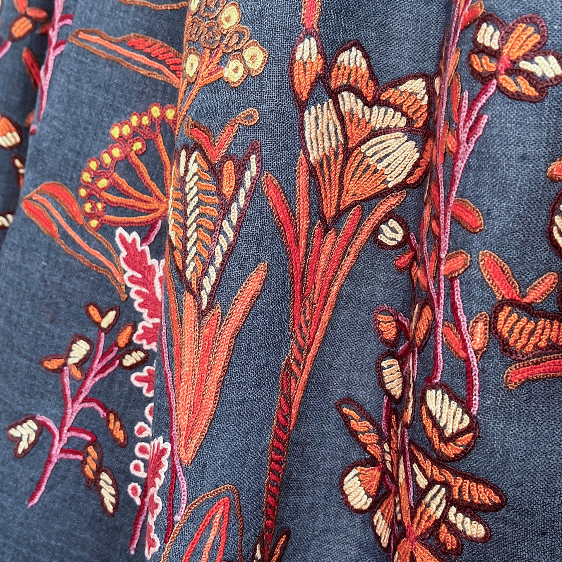 花、湖、山、美しいカシミールの大自然からのインスピレーションを受けたカシミール地方の伝統技術で、細い鉤針を使い下から糸をすくって刺繍します。