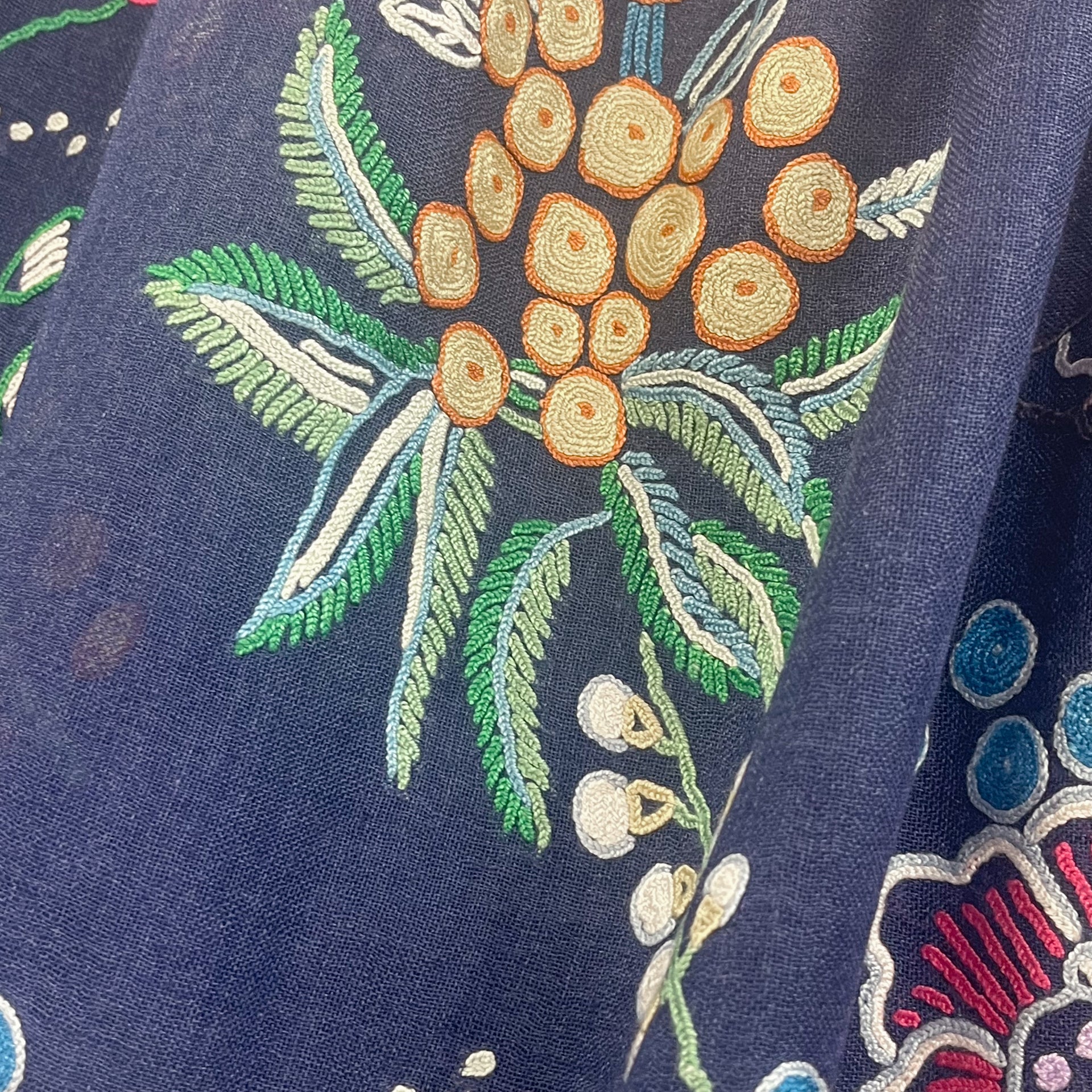 花、湖、山、美しいカシミールの大自然からのインスピレーションを受けたカシミール地方の伝統技術で、細い鉤針を使い下から糸をすくって刺繍します。