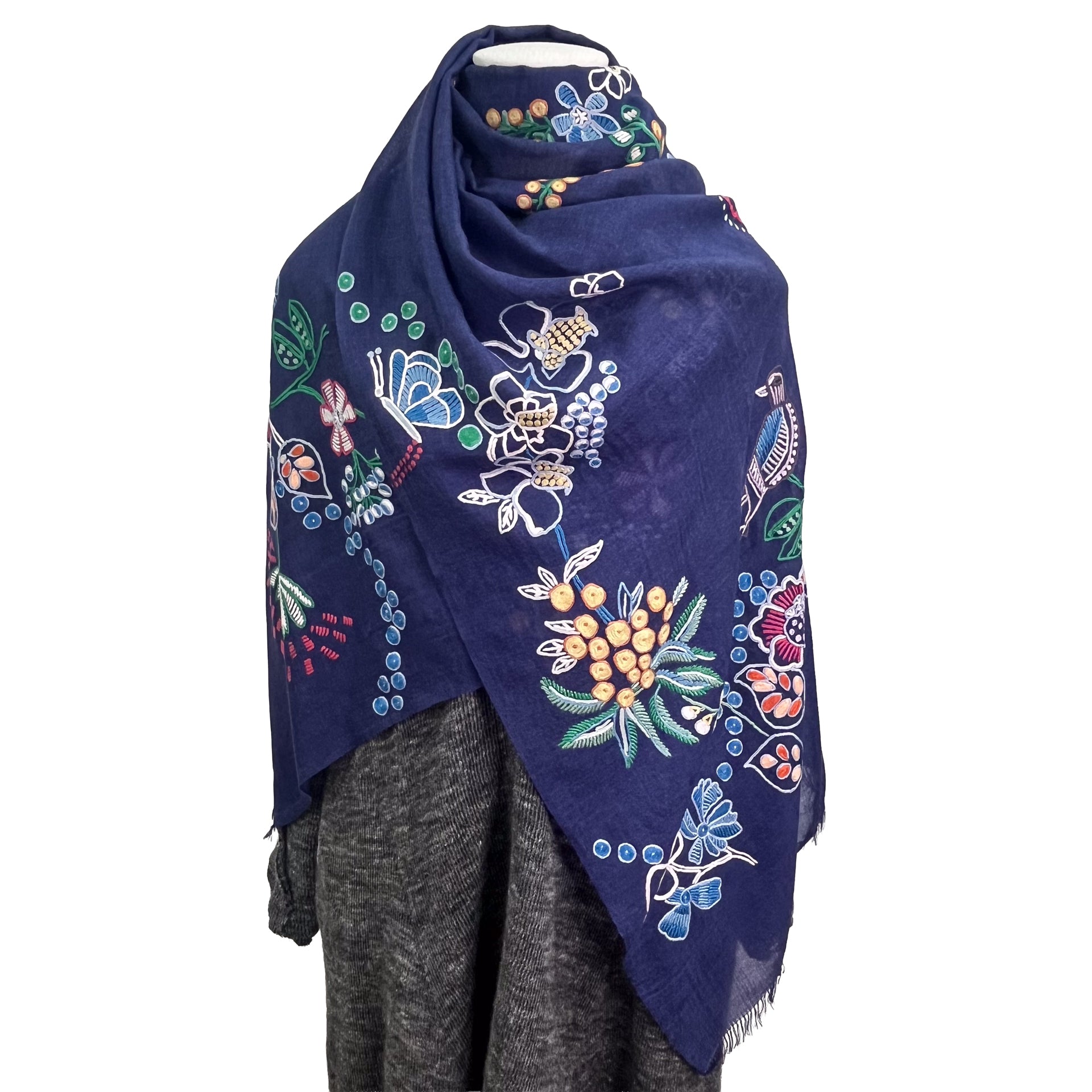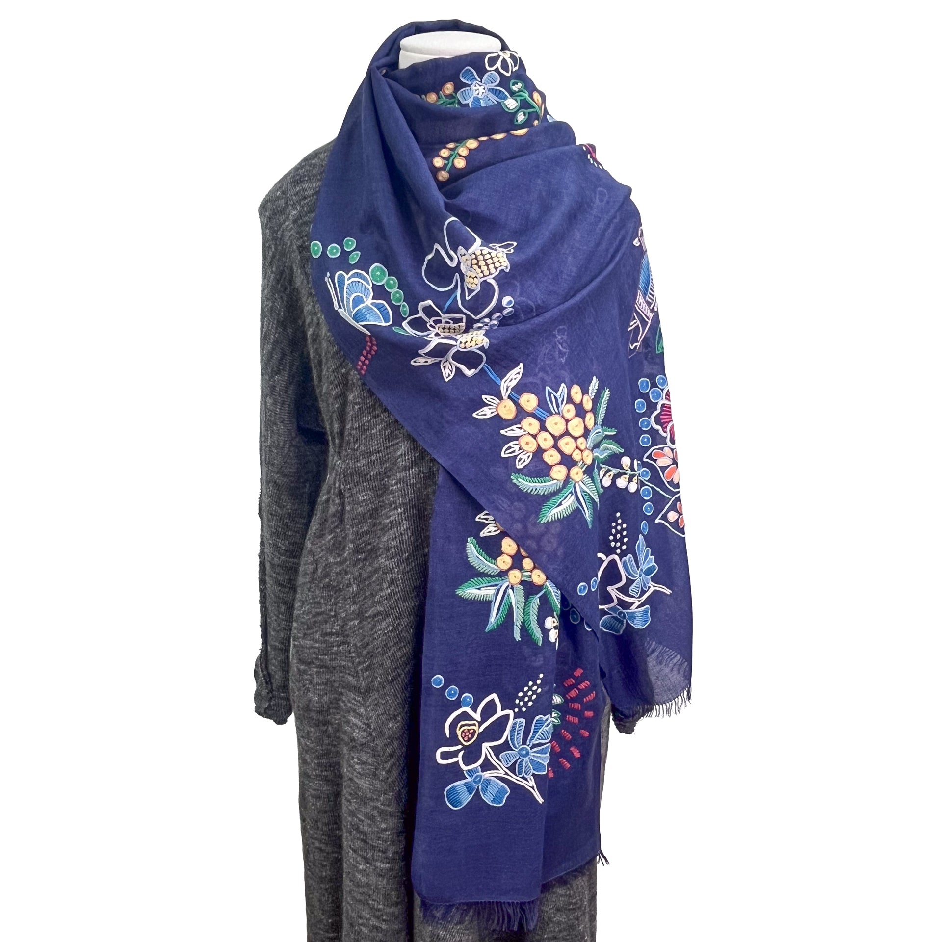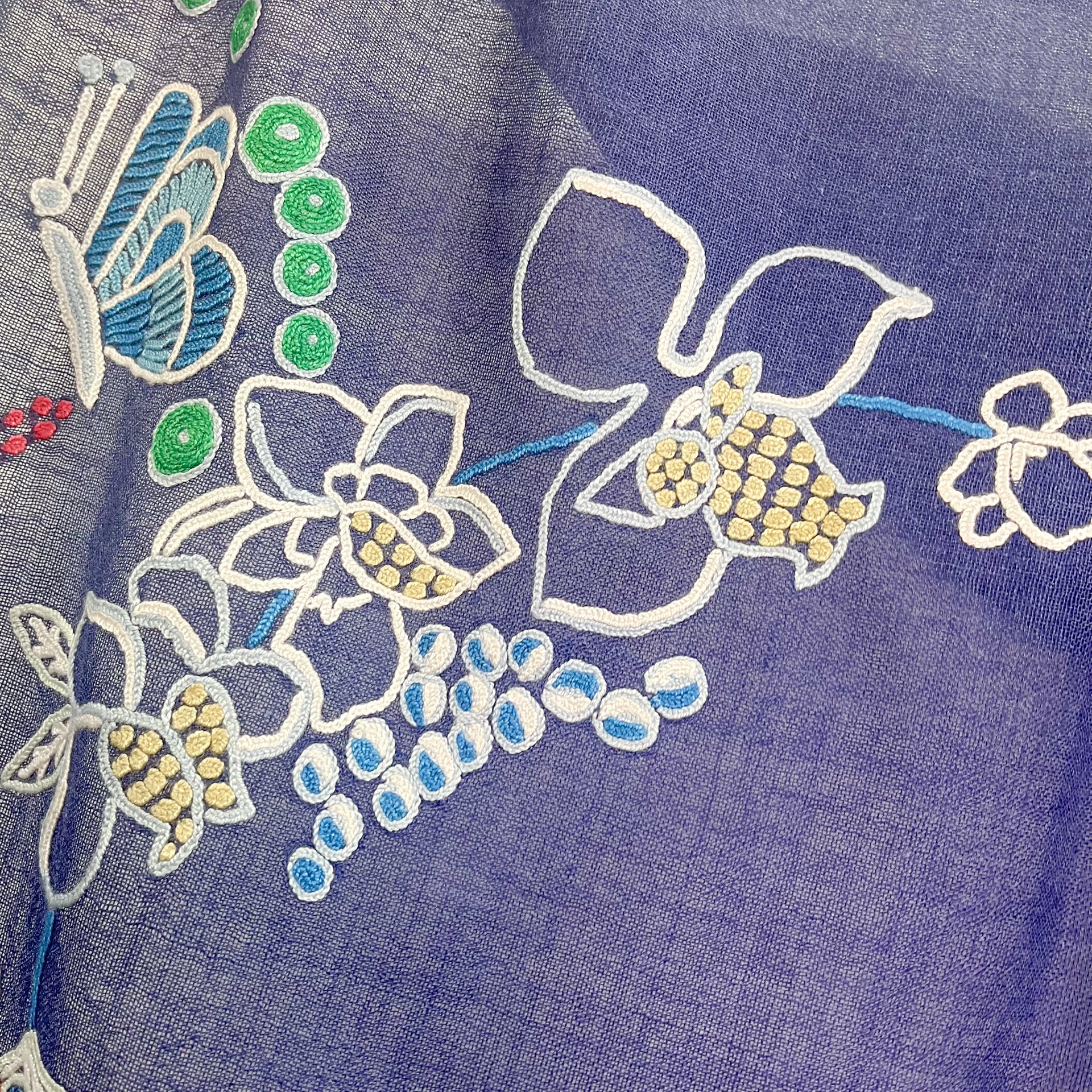 Wearing Image Worn by a staff member who is 161cm tall ◆Material◆ 80% wool, 20% silk Embroidery thread 100% rayon ◆Color◆ Fuchsia Pink ◆Size◆ 60cm x 195cm (excluding fringe) ◆Country of Origin◆ India ◆Product Description◆ A stole with an asymmetrical depiction of flowers blooming in the fields. A versatile piece with a botanical pattern in the same color scheme. Ali's hand embroidery appears to float in a three-dimensional way. The wool and silk material is a soft, sheer fabric that can be worn all year round. It can be enjoyed in a wide range of outfits, making it a great gift or for daily use. A scarf can be worn in any season, whether it's wrapped inside a jacket or coat to keep warm in the cold season, or as a cardigan or to protect against the air conditioning in the hot season. It is also convenient for traveling. [Ali embroidery] A traditional technique from the Kashmir region inspired by the flowers, lakes, mountains, and beautiful nature of Kashmir. It is embroidered by scooping up threads from below using a thin crochet needle. Each stitch is embroidered while changing colors in a circular motion. Each piece is individually handmade and features intricate hand embroidery. ・Dry cleaning -We try to make the product photos as close to the actual colors as possible, but the colors may differ from the actual product depending on the viewing environment, etc. ・You can also view this product in person at our main store.