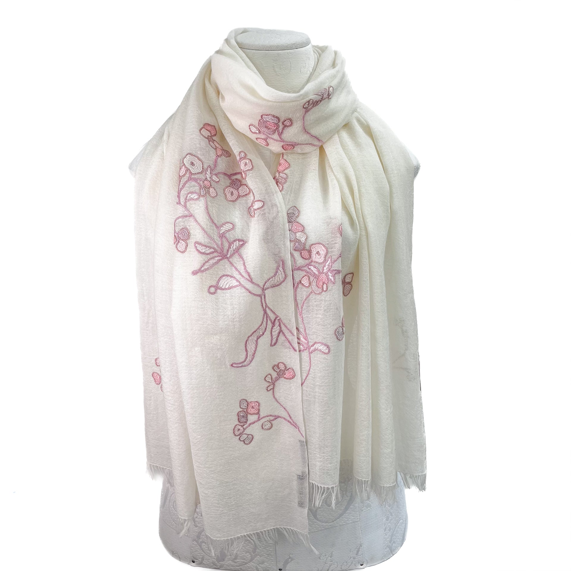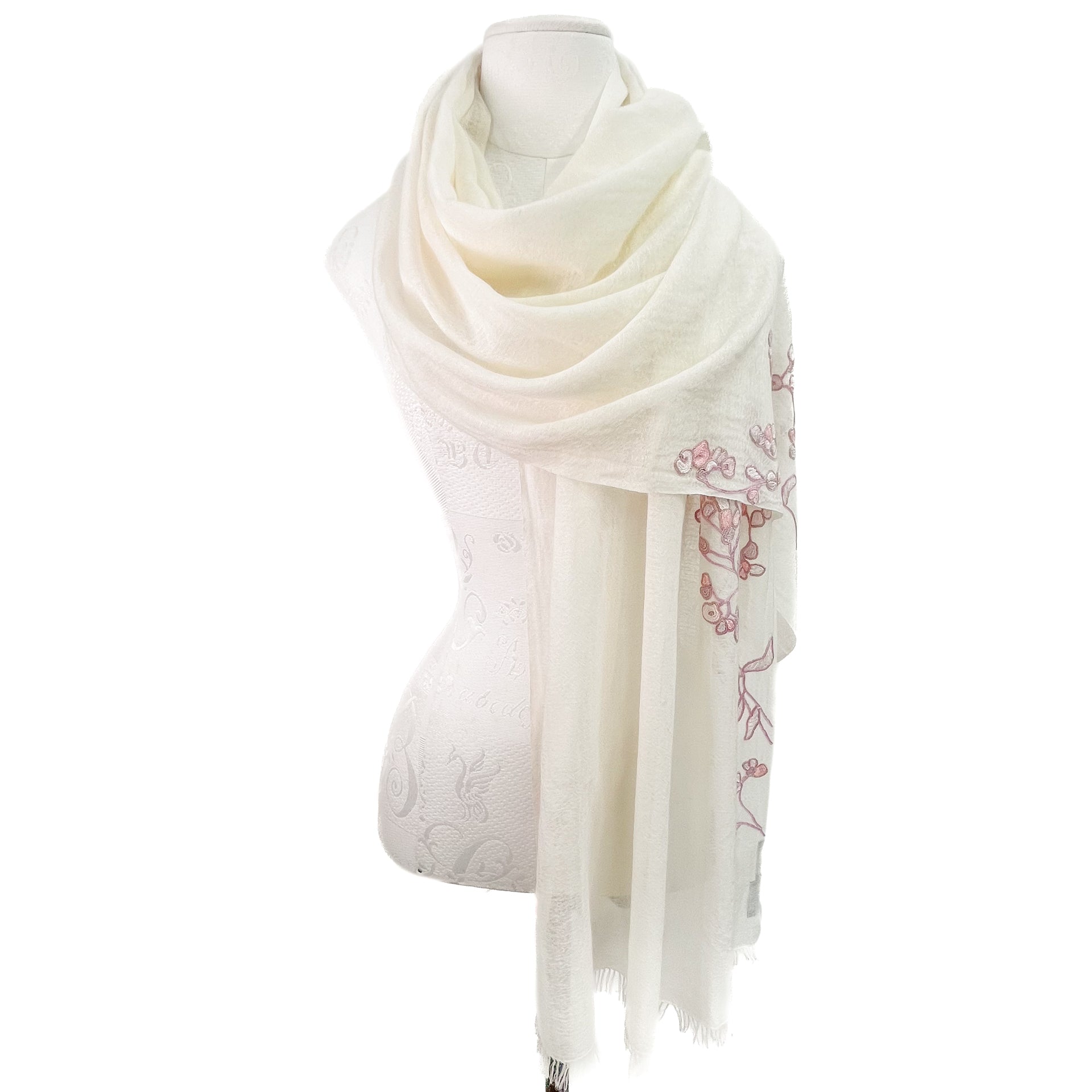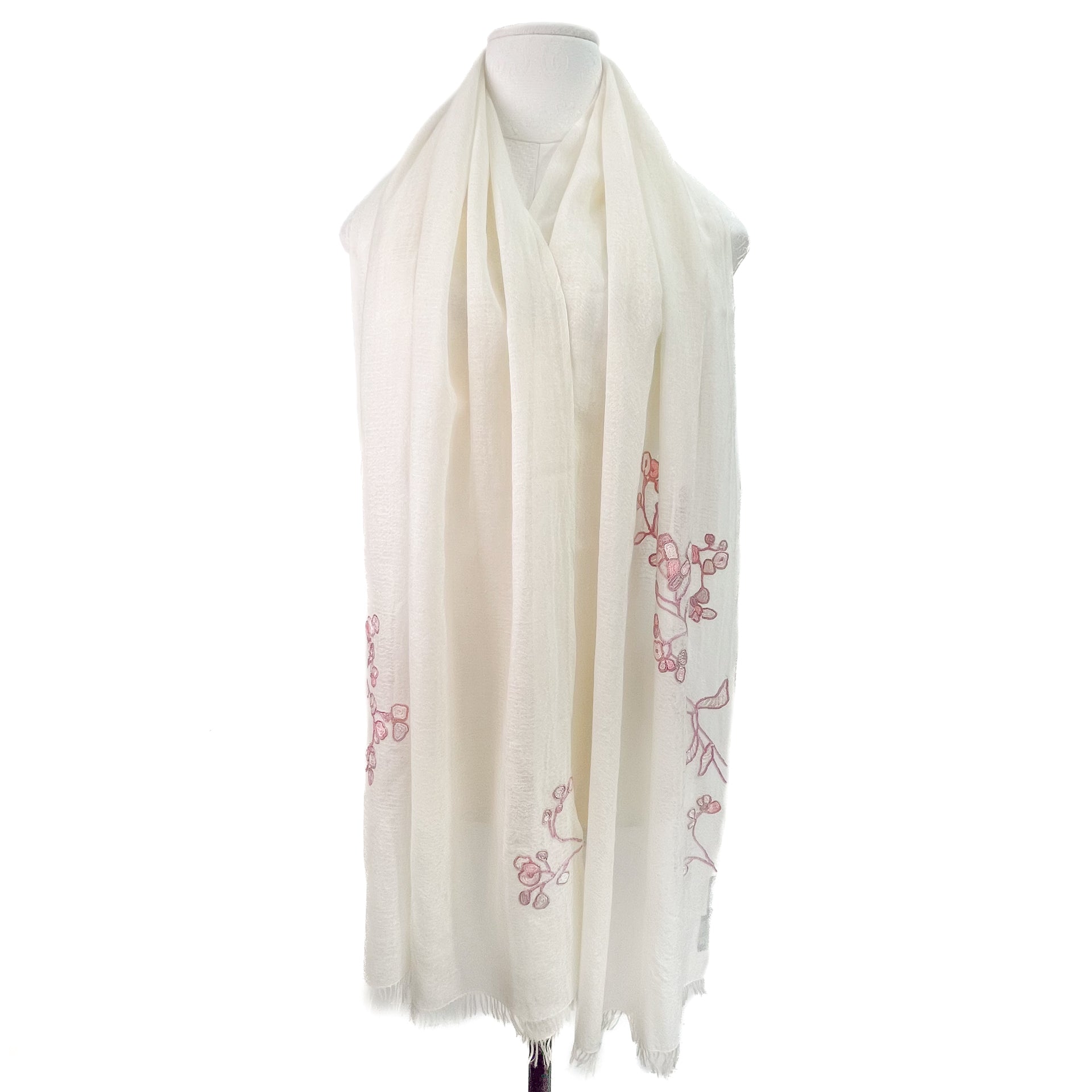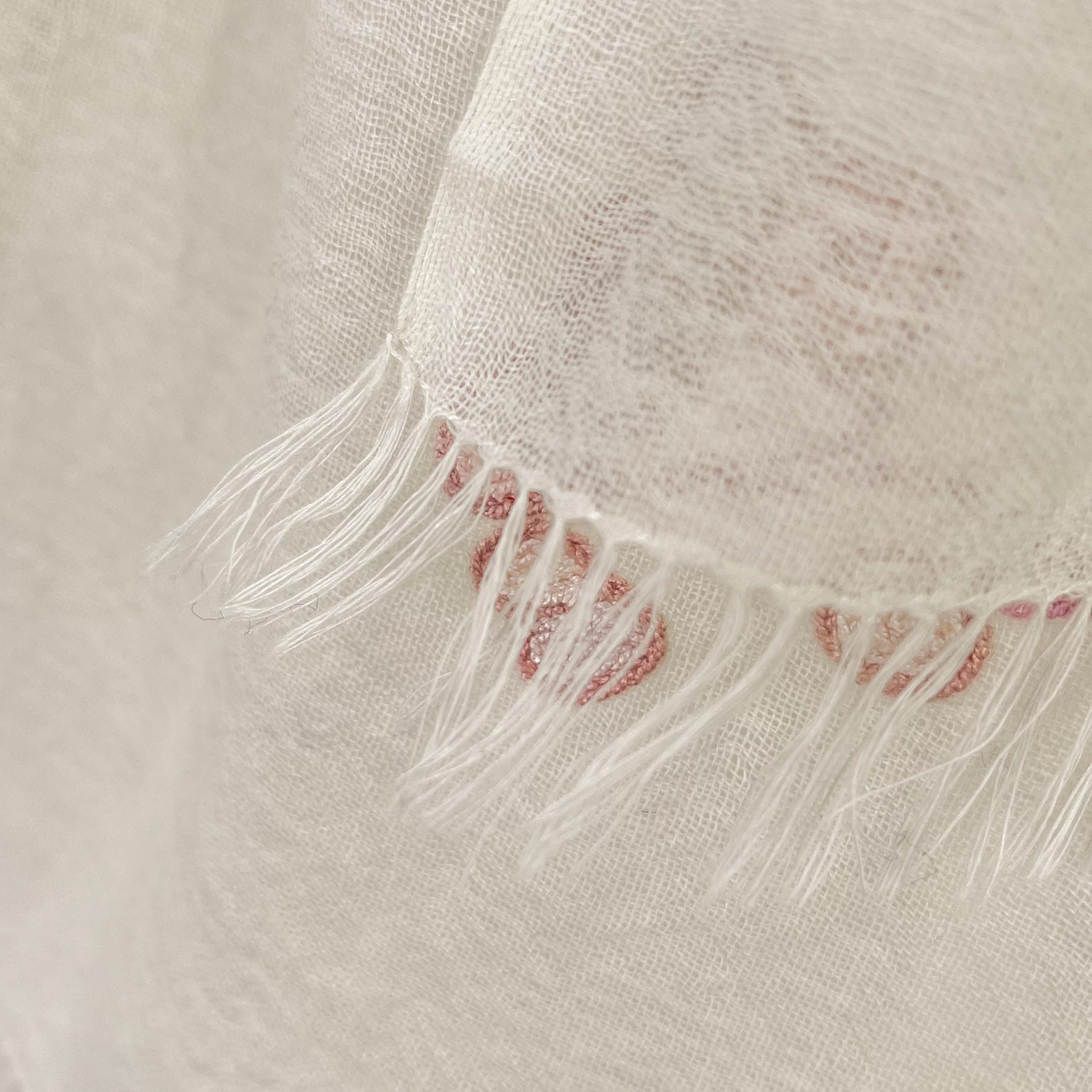 Lightweight wool & silk Allie hand embroidered stole (white/light pink)