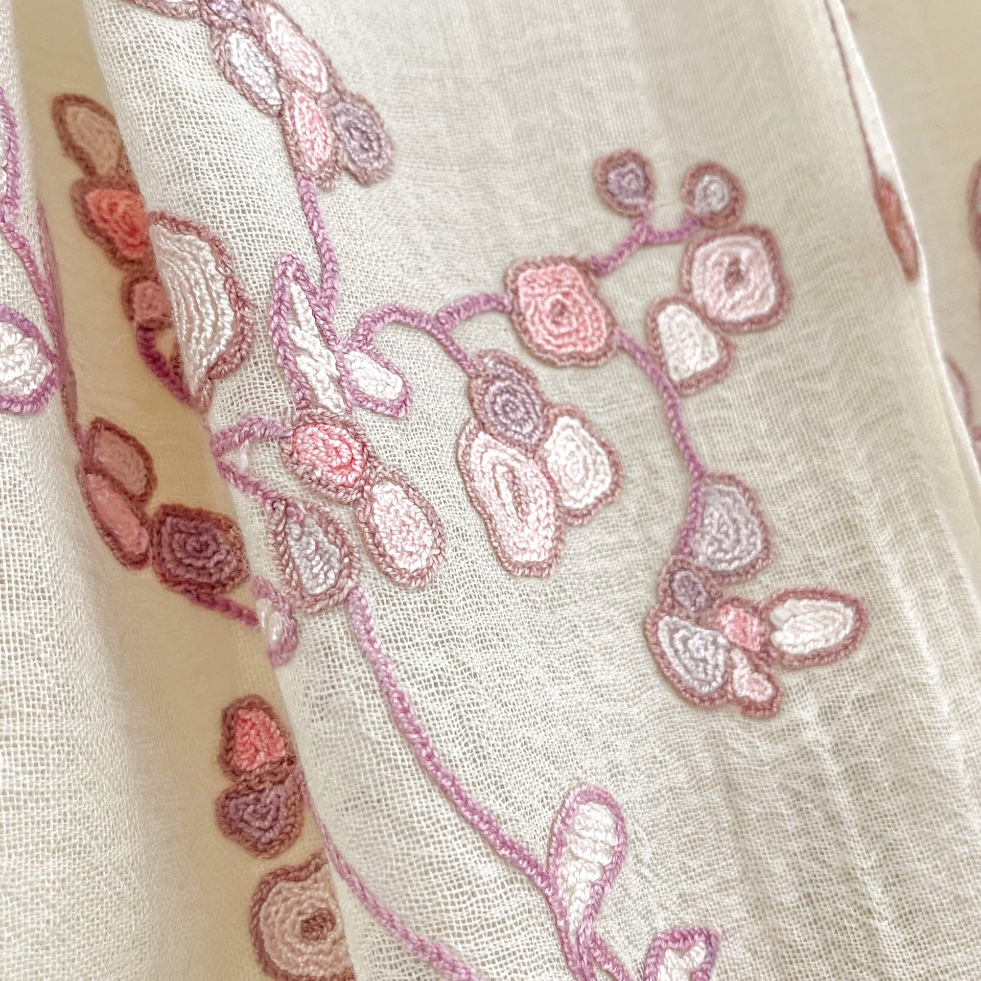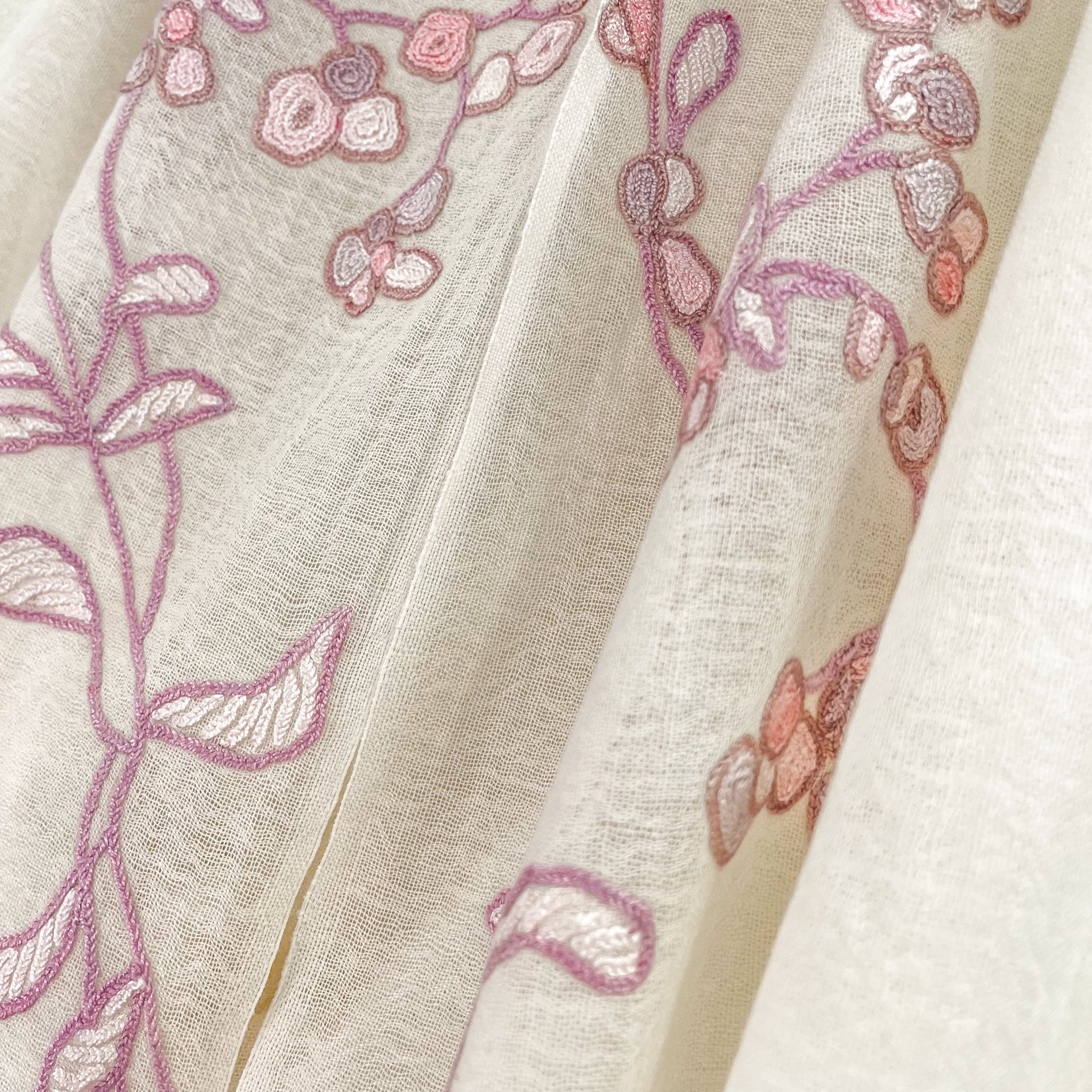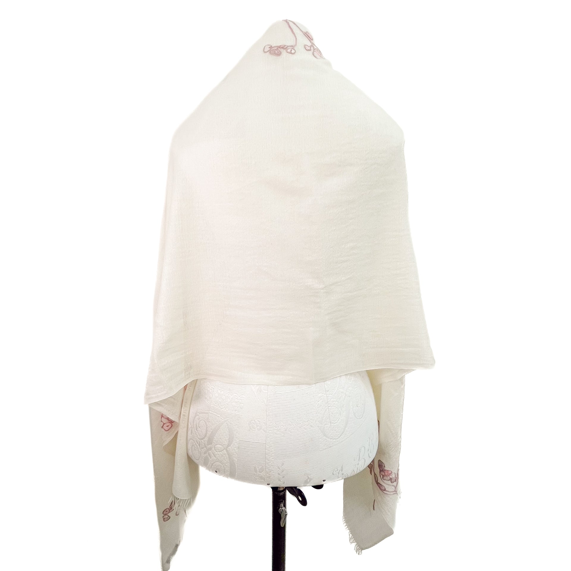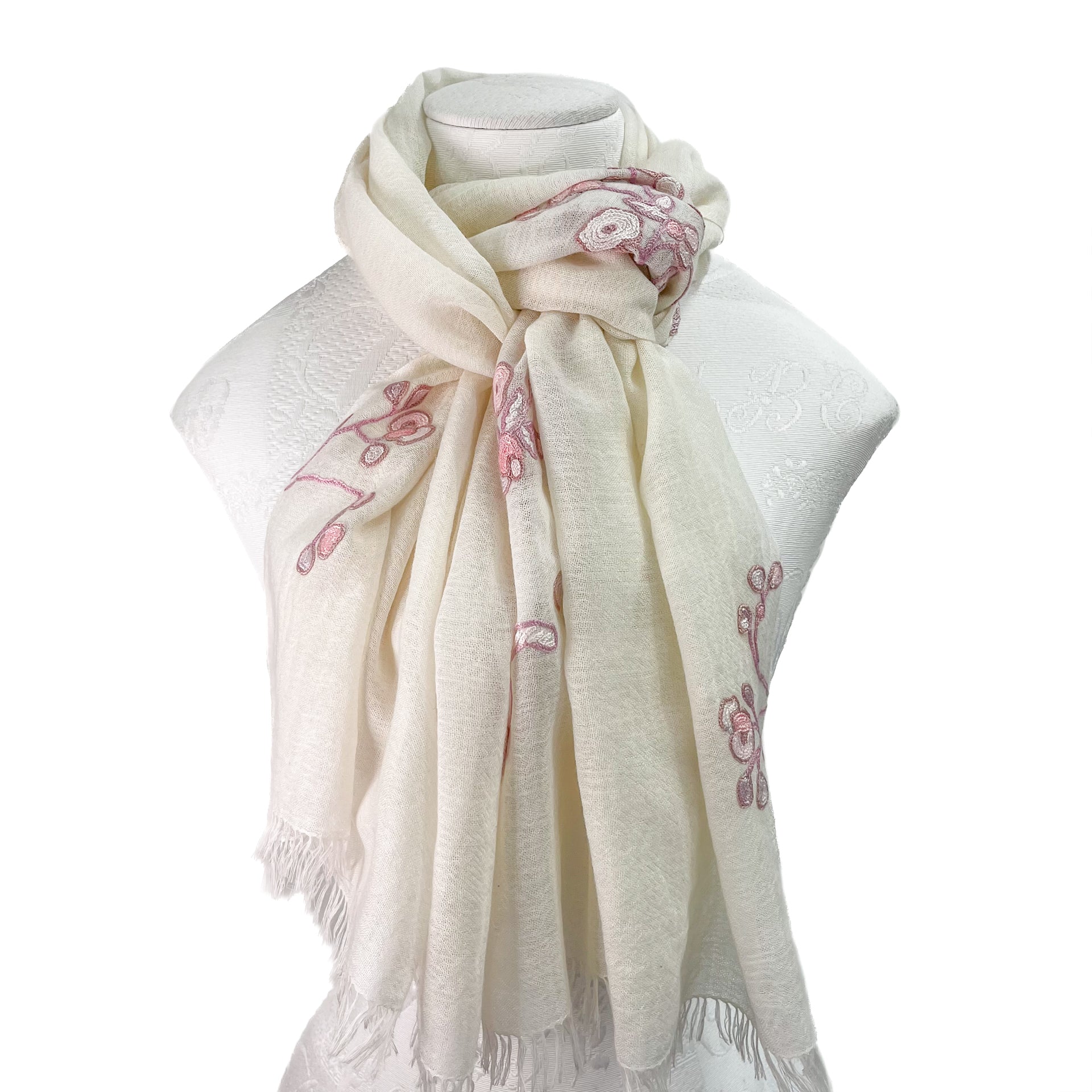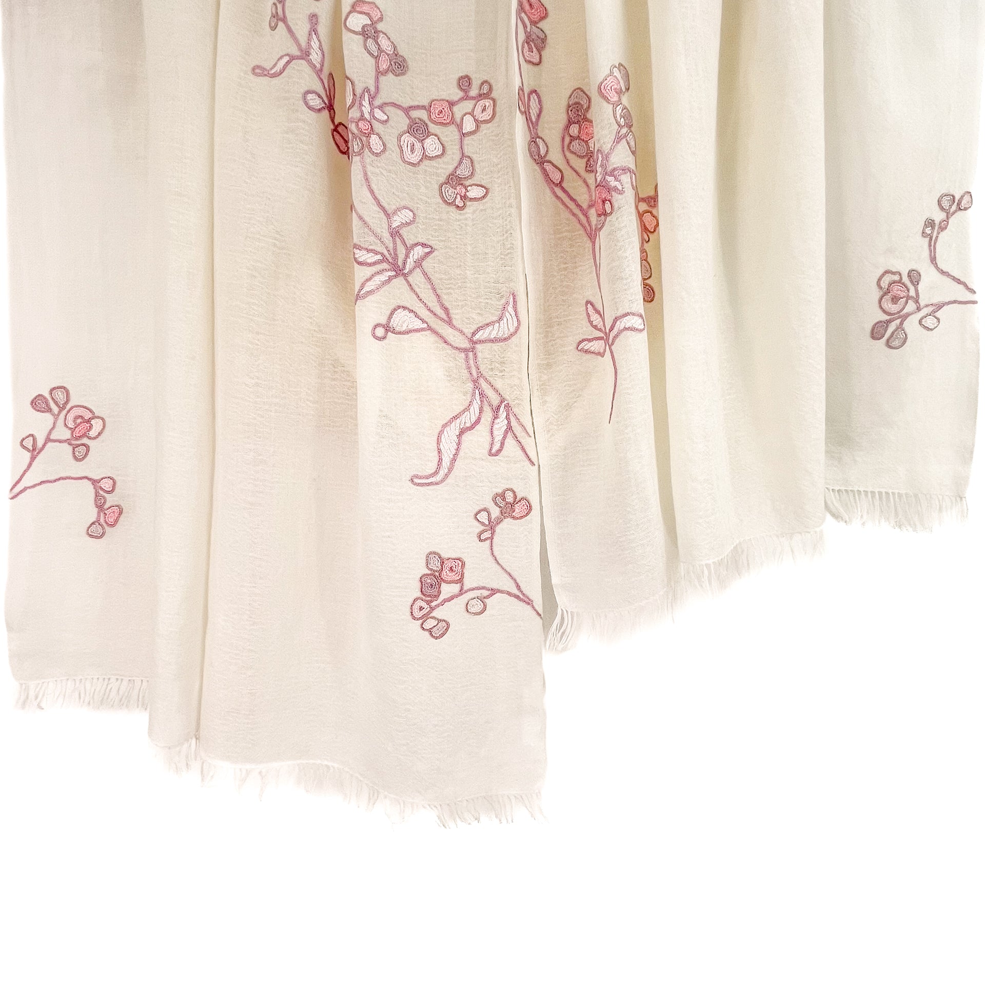 Lightweight wool & silk Allie hand embroidered stole (white/light pink)