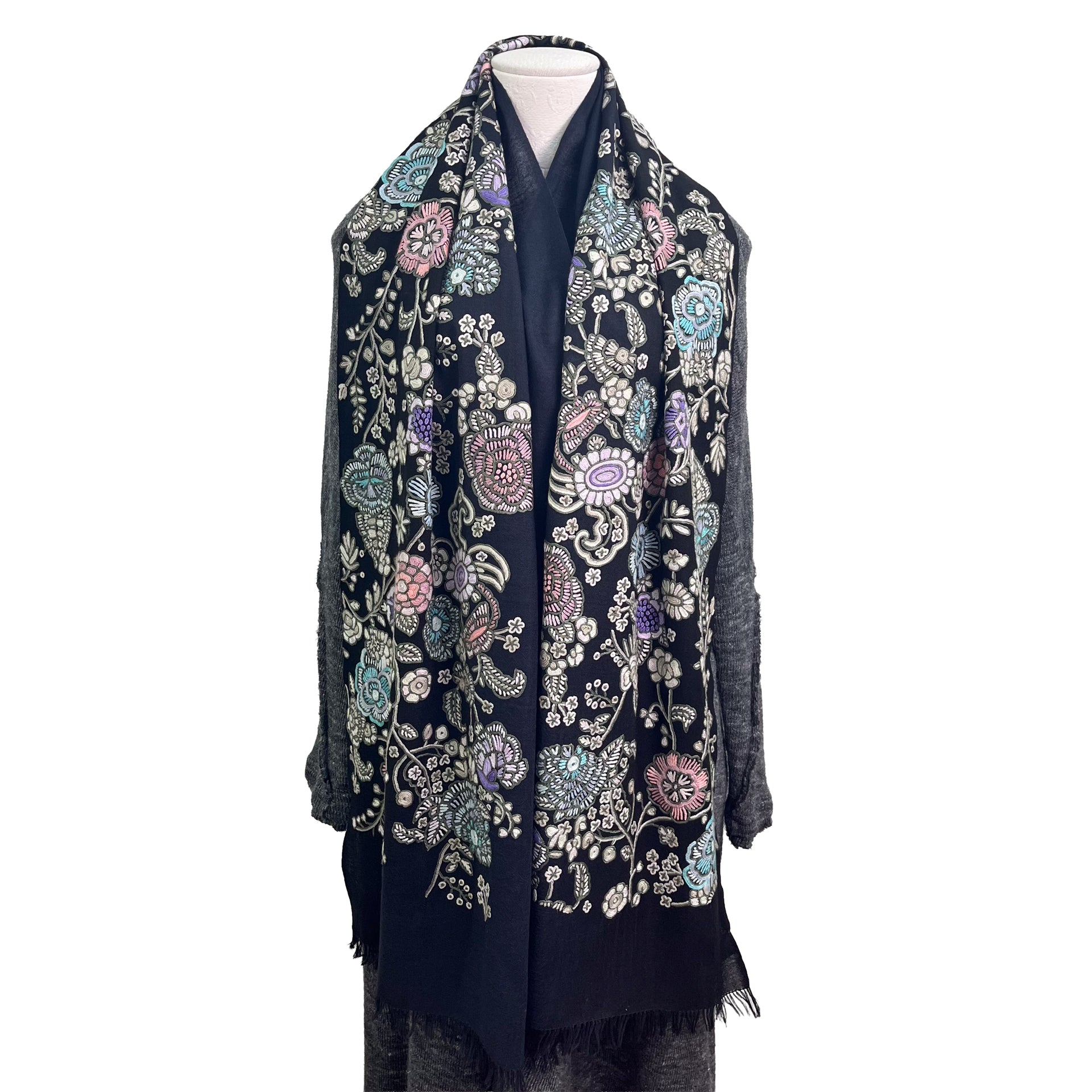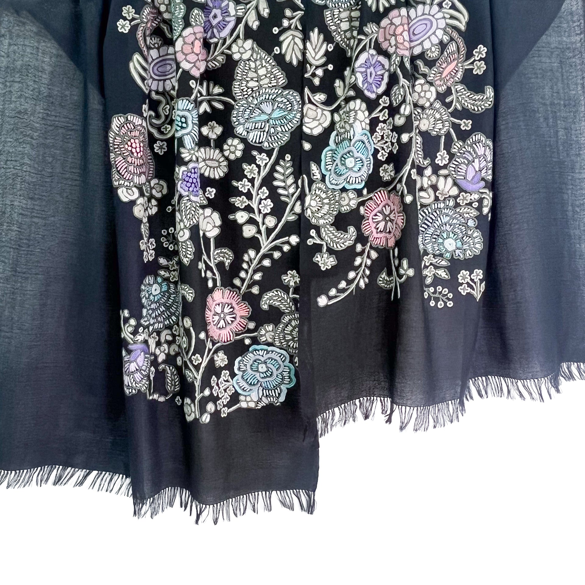 花、湖、山、美しいカシミールの大自然からのインスピレーションを受けたカシミール地方の伝統技術で、細い鉤針を使い下から糸をすくって刺繍します。