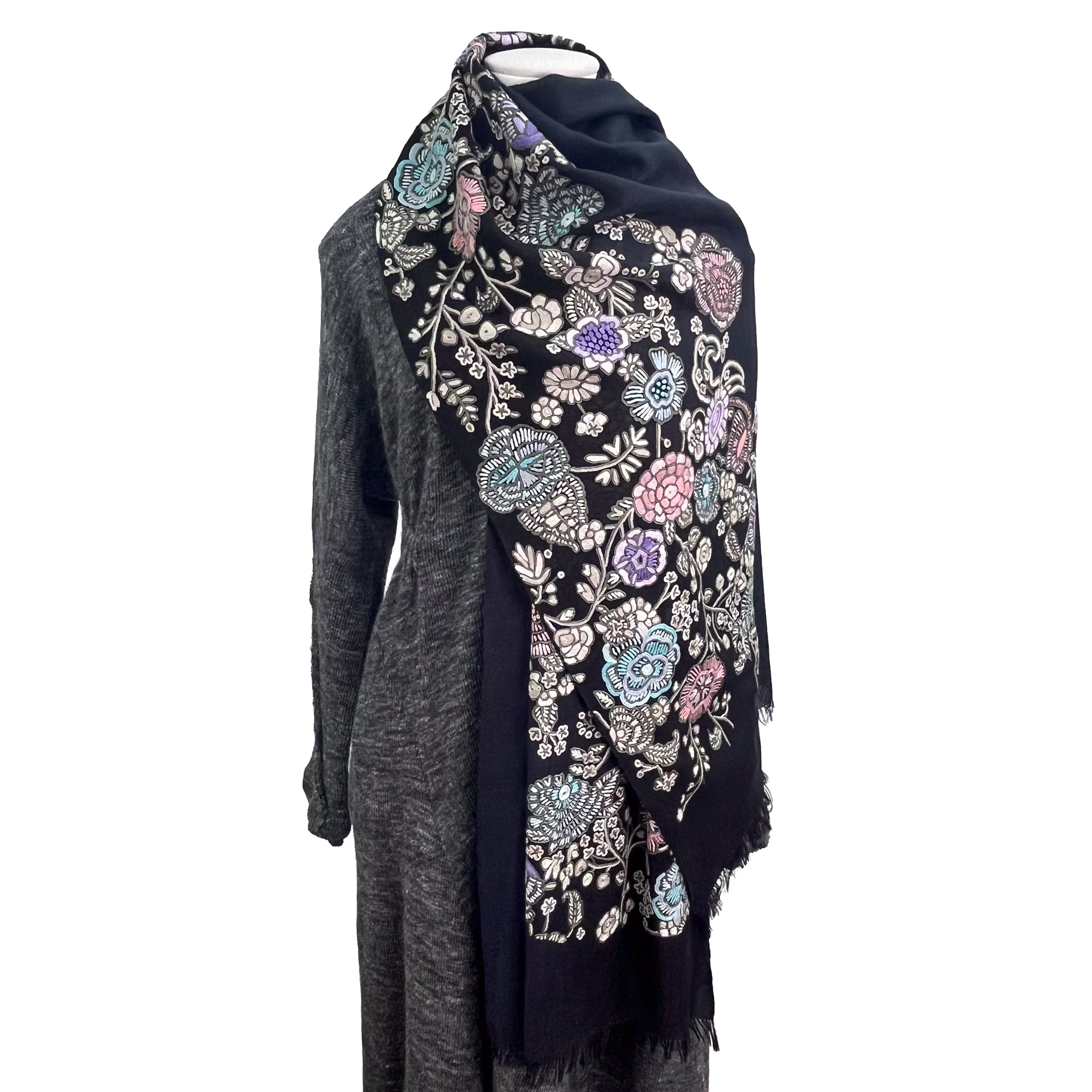 Lightweight wool & silk printed & Allie hand embroidered stole (fuchsia pink)