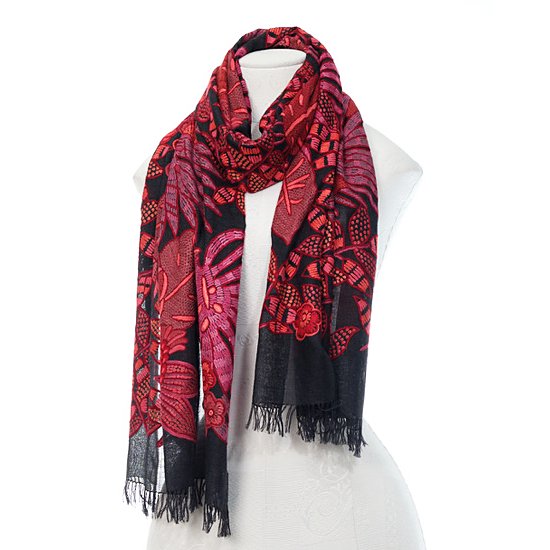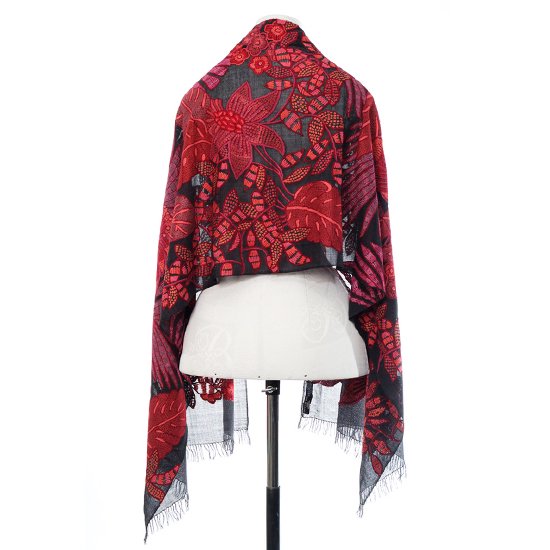 Red Dream Flower Motif Lightweight Wool & Silk Allie Hand Embroidered Stole (Off Black/Red)