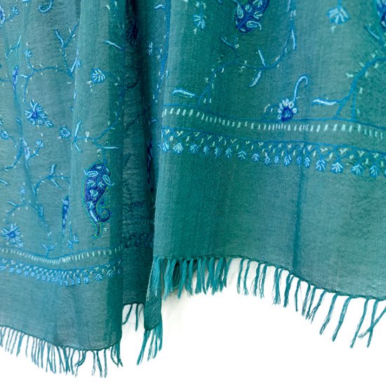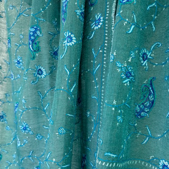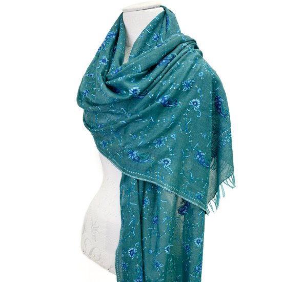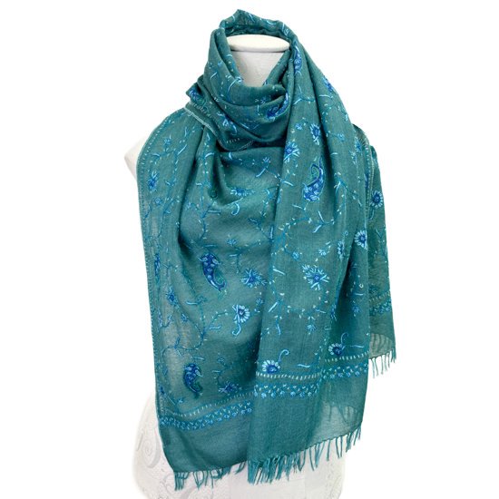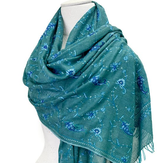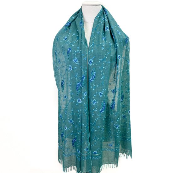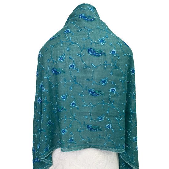 S-WTN2509_0513Wool & Silk Needle Embroidered Stole (Green/Turquoise)
