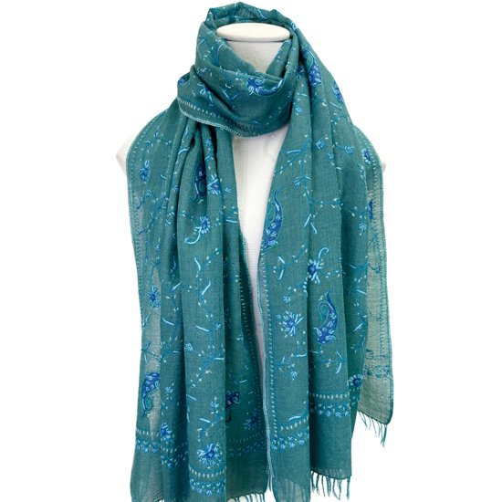 Wool & Silk Needle Embroidered Stole (Green/Turquoise)