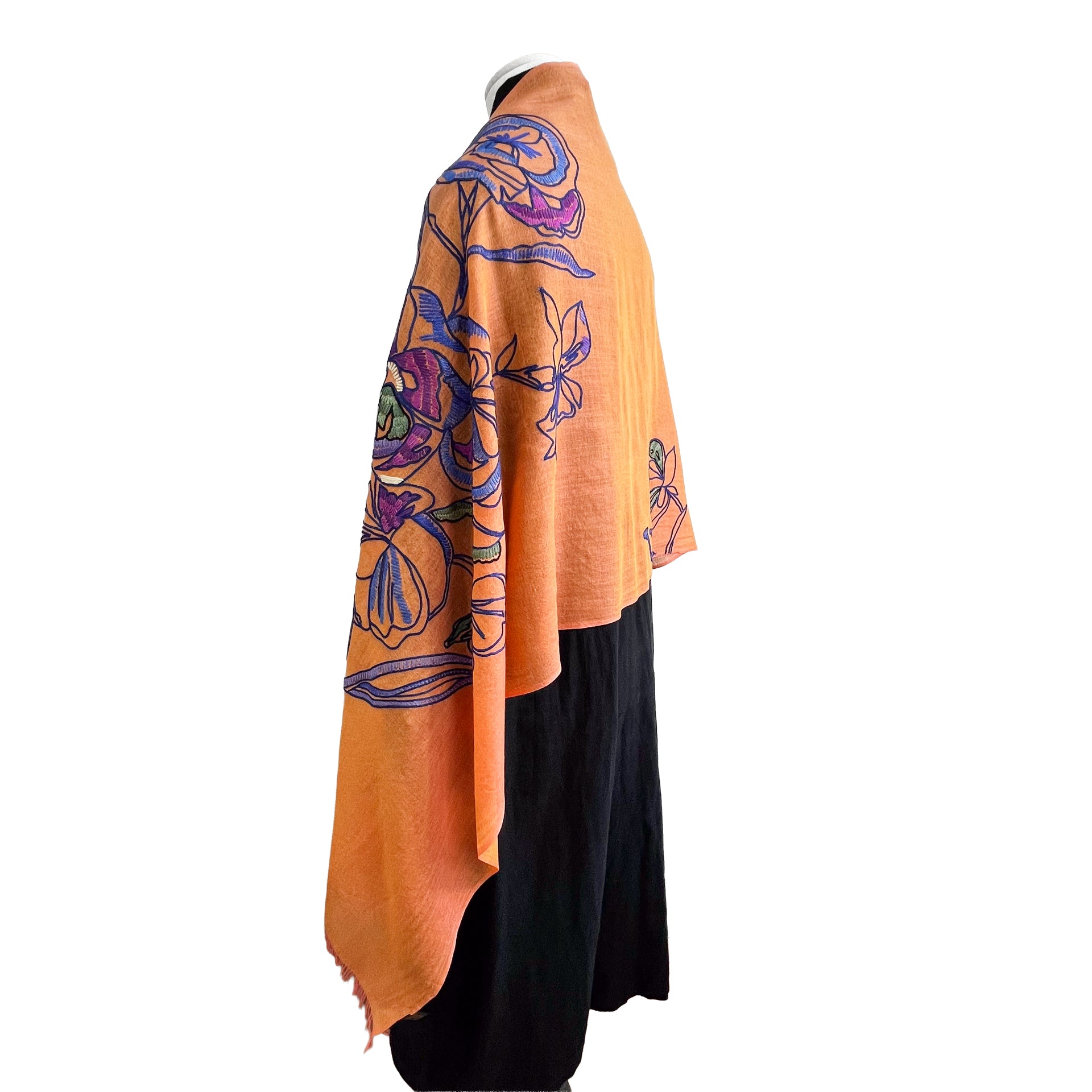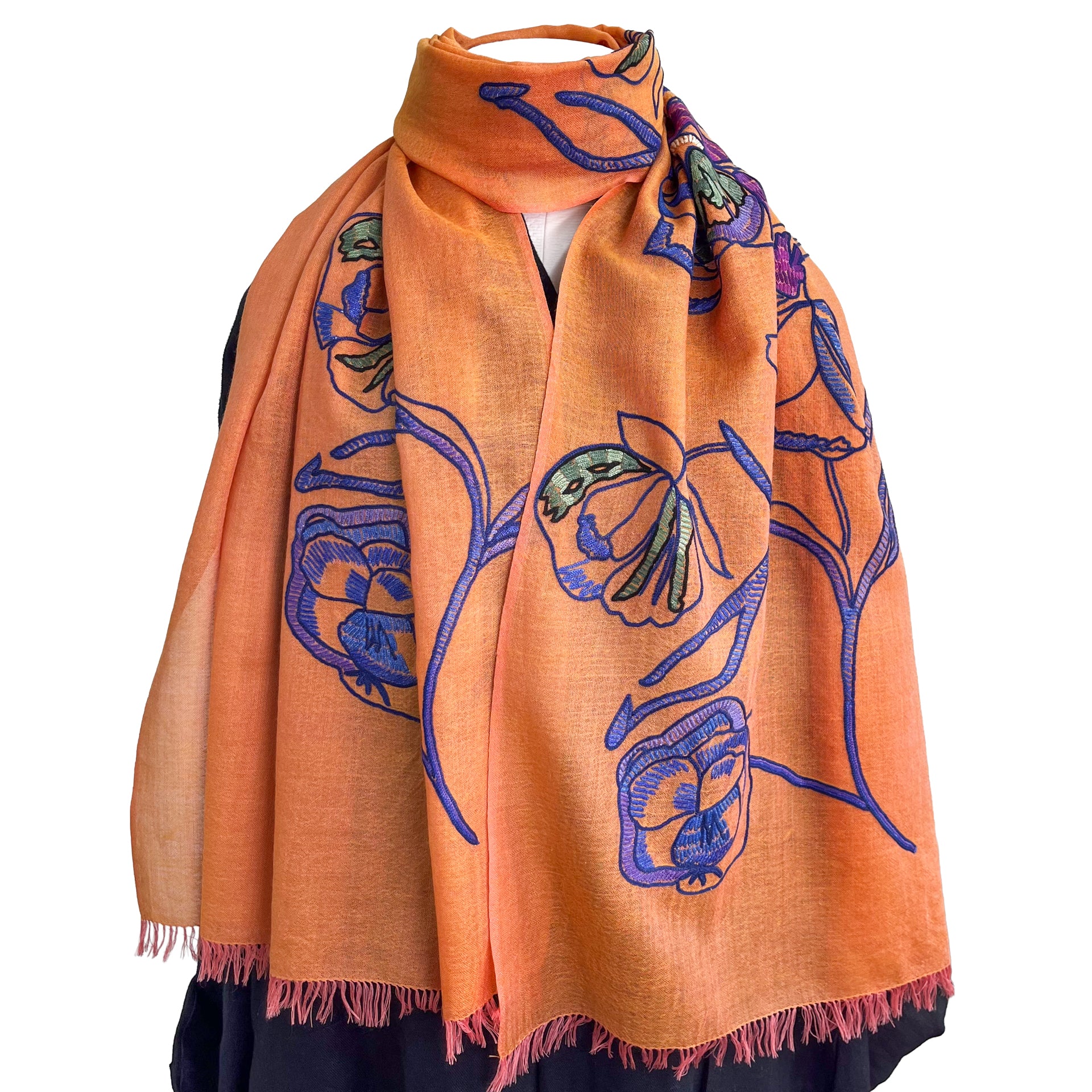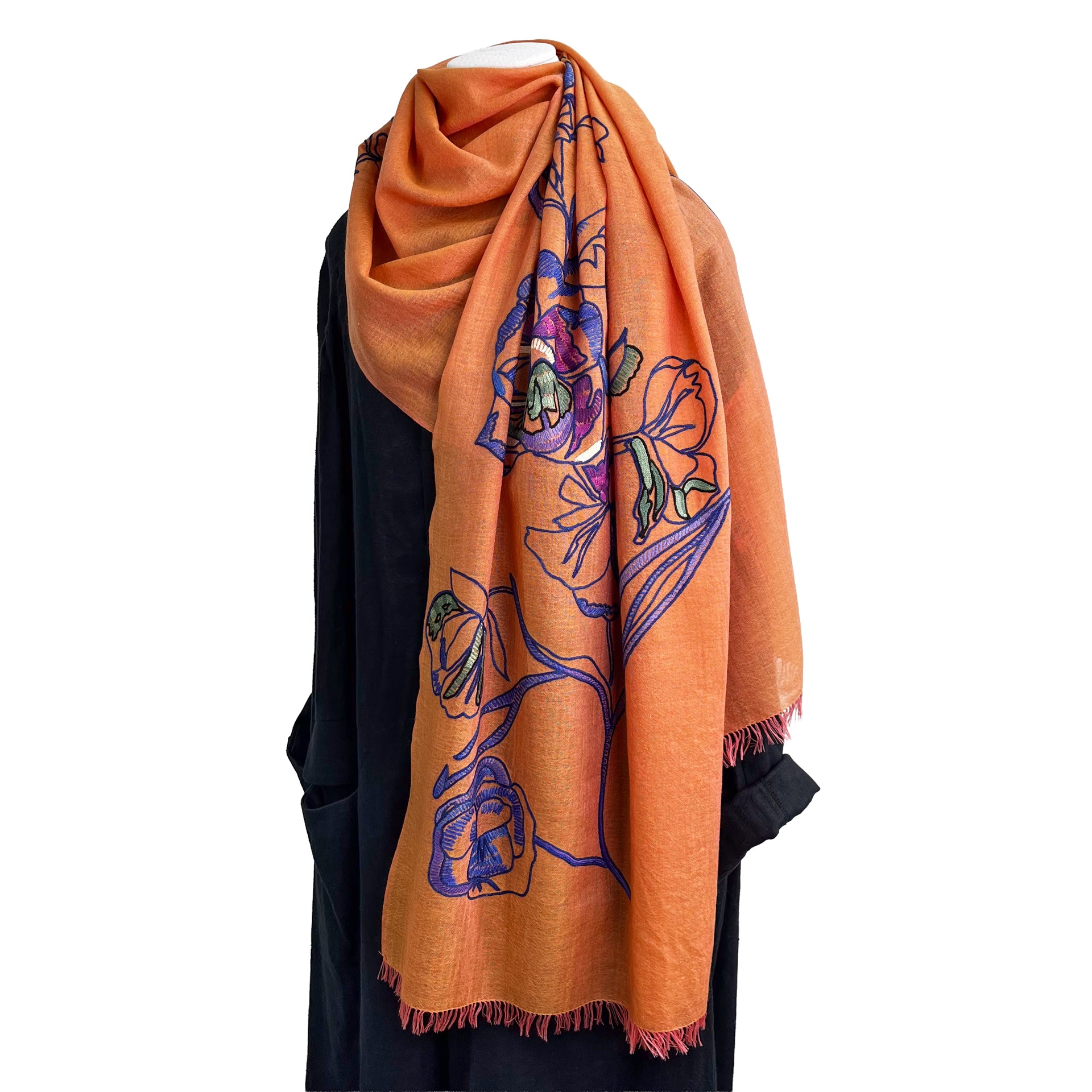 ウール&シルク アリー手刺繍ストール(オレンジ)
