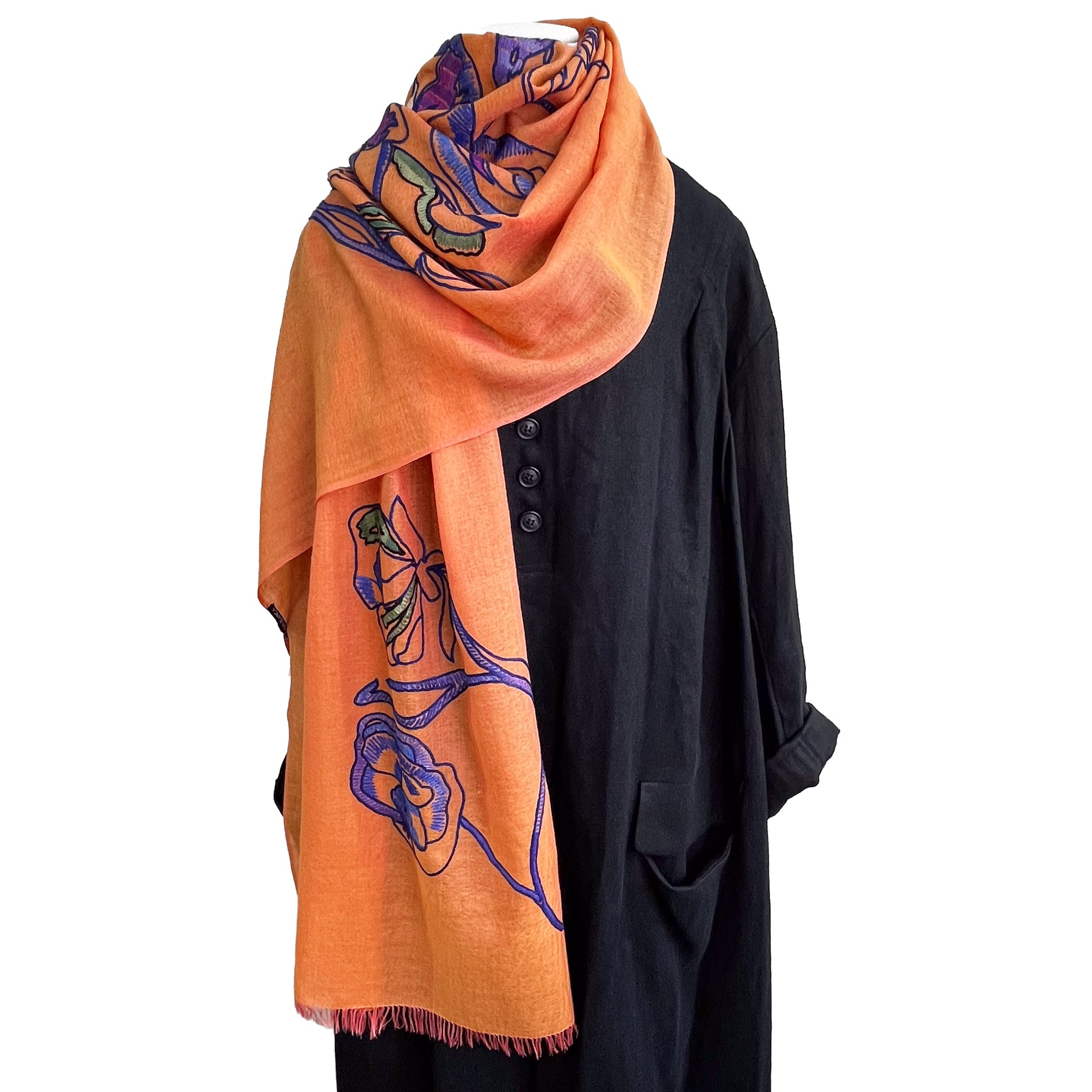 オレンジとピンクのシャンブレー生地に、ブルー、パープル、グリーンなどでストールに伸びやかに抽象的な花々を描いています。