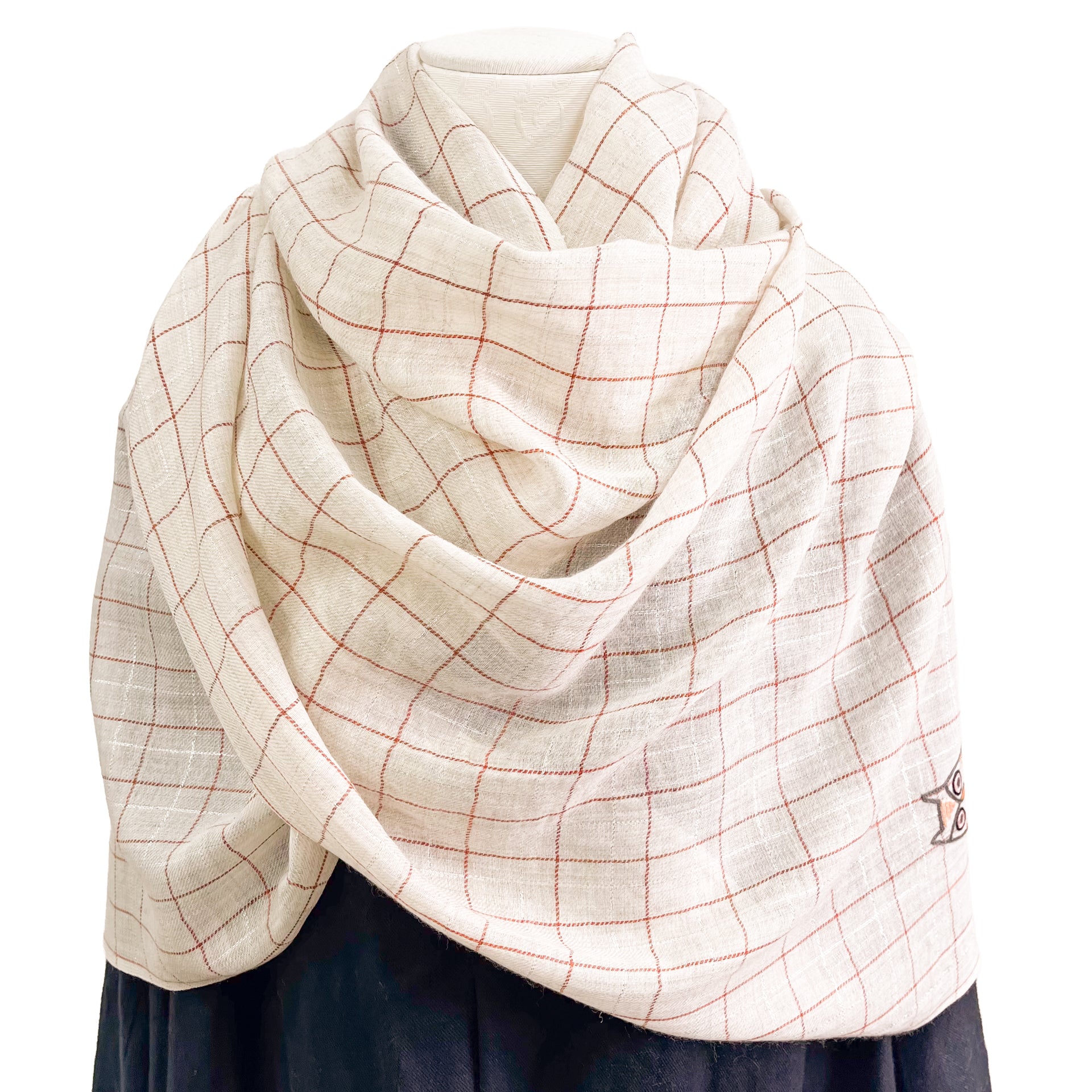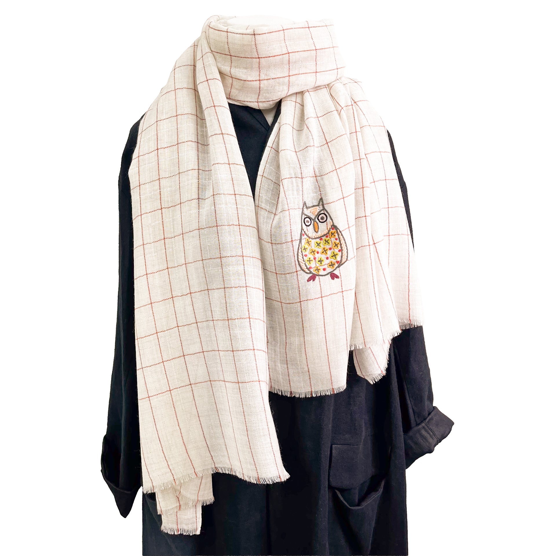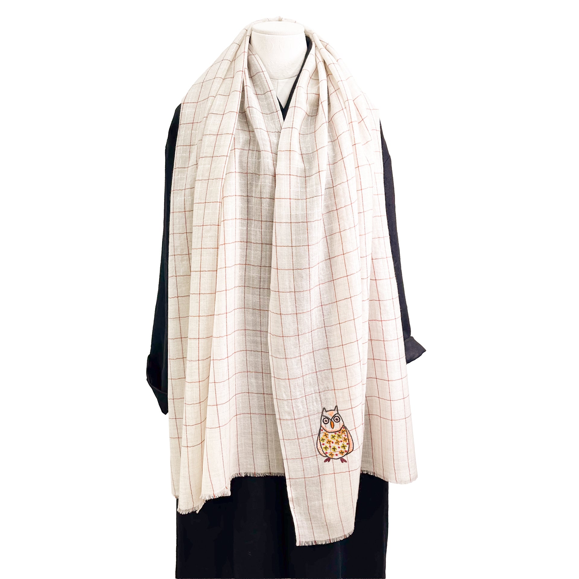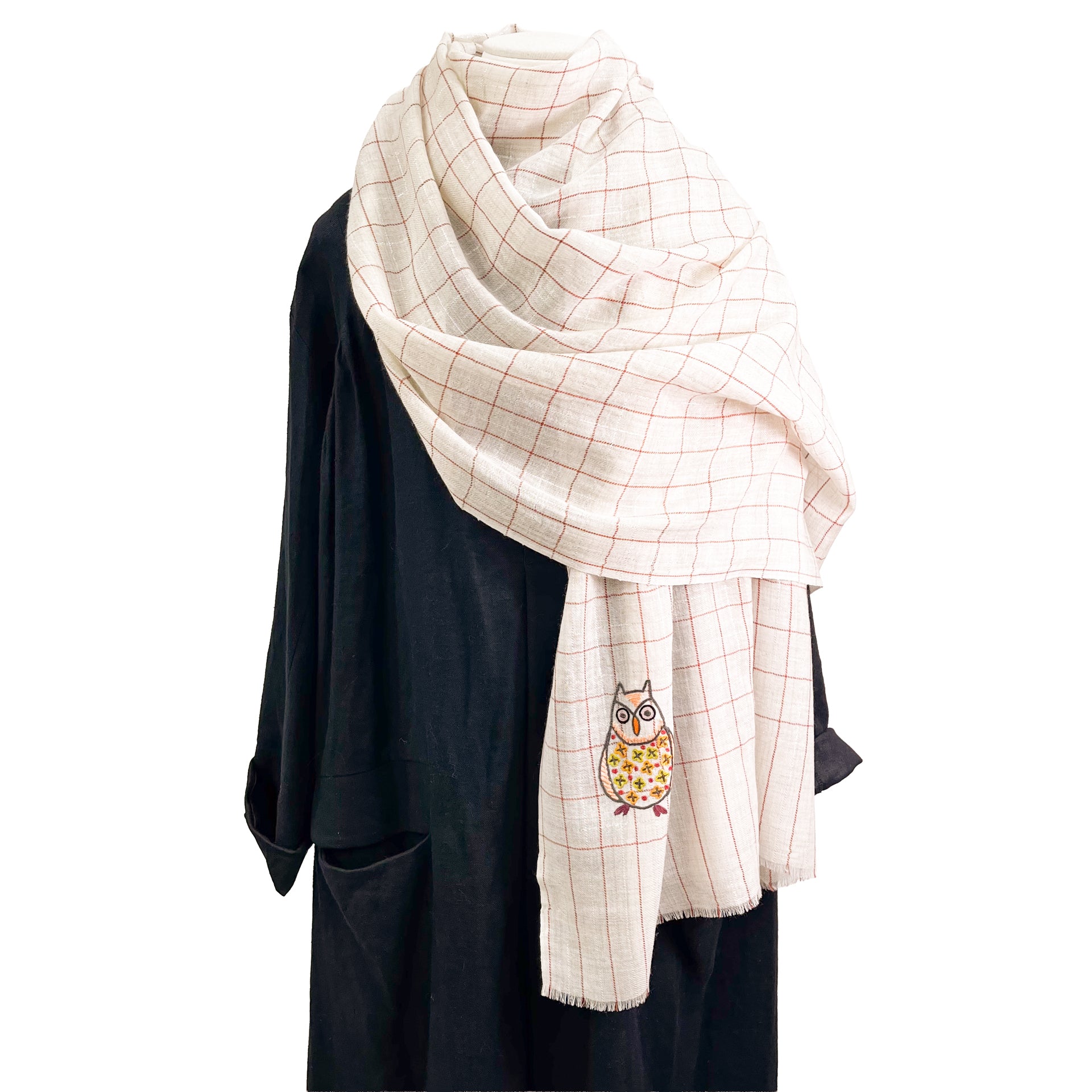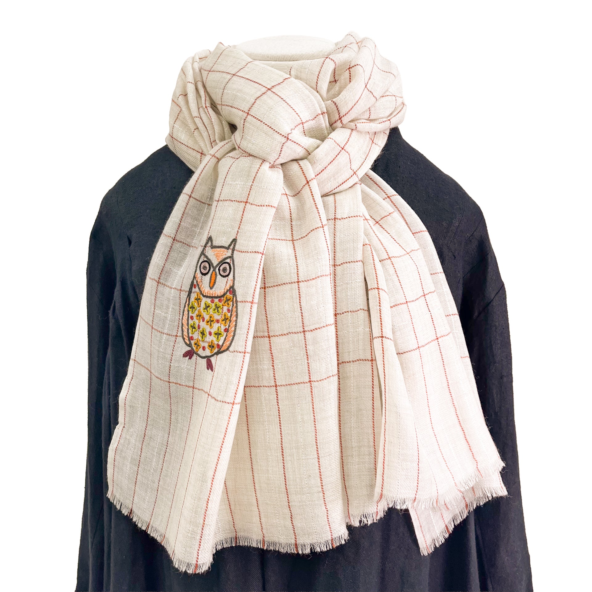 ウール&シルク アリー手刺繍ストール フクロウ (ホワイト)