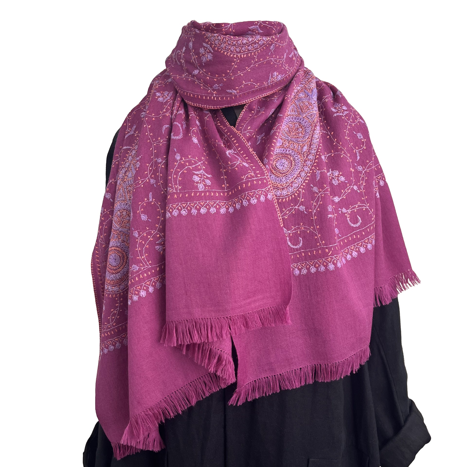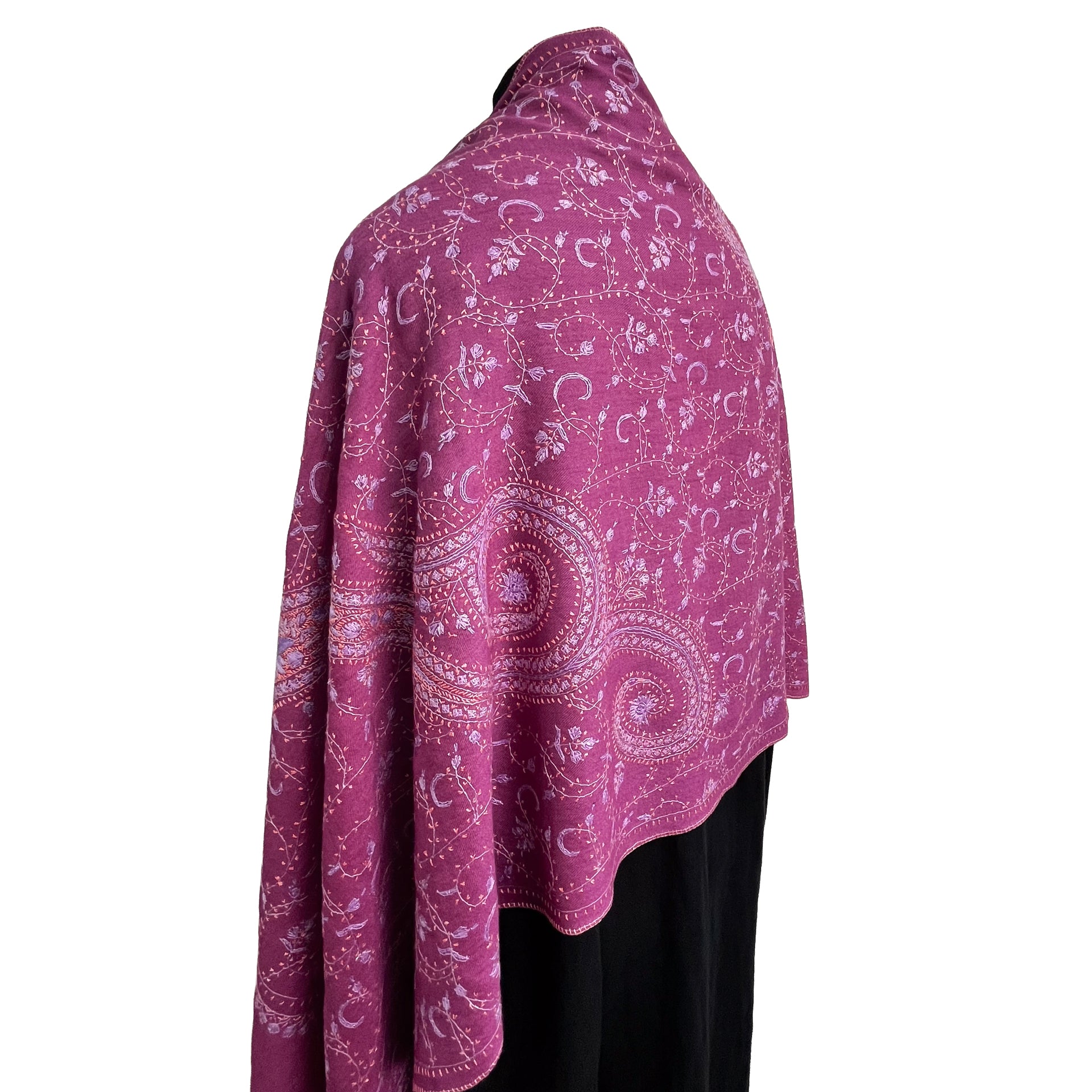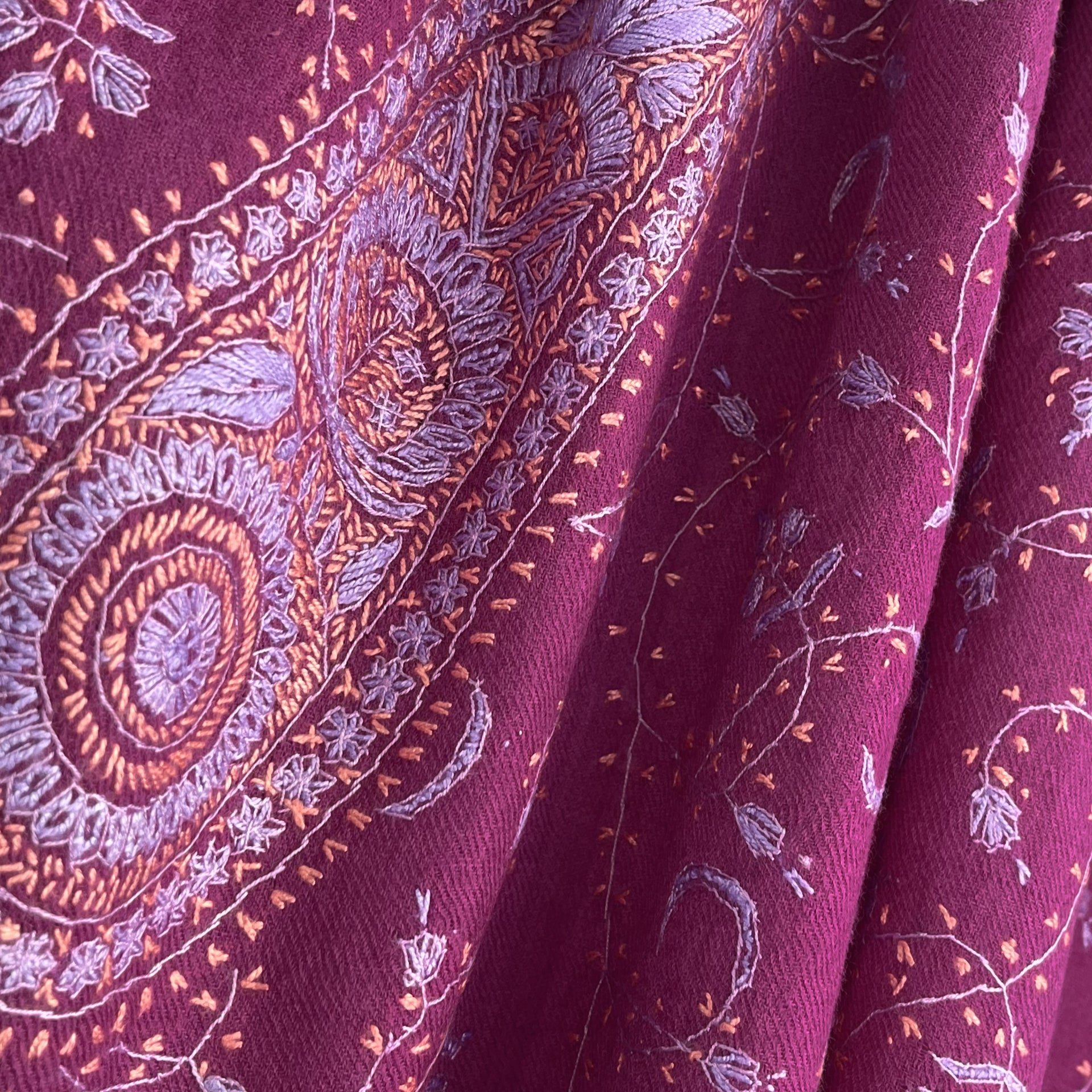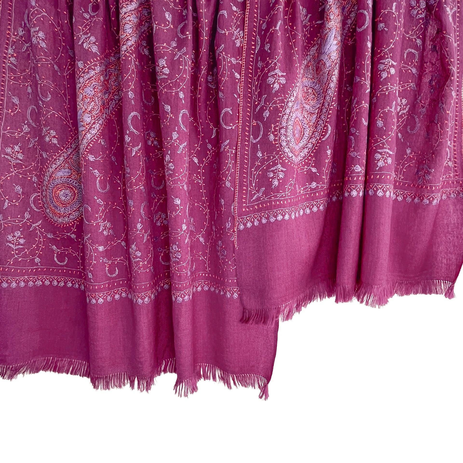 マゼンタの生地一面に、ライトパープルやサーモンピンクなどの色糸で大きなペイズリーや植物モチーフを描いた一枚。