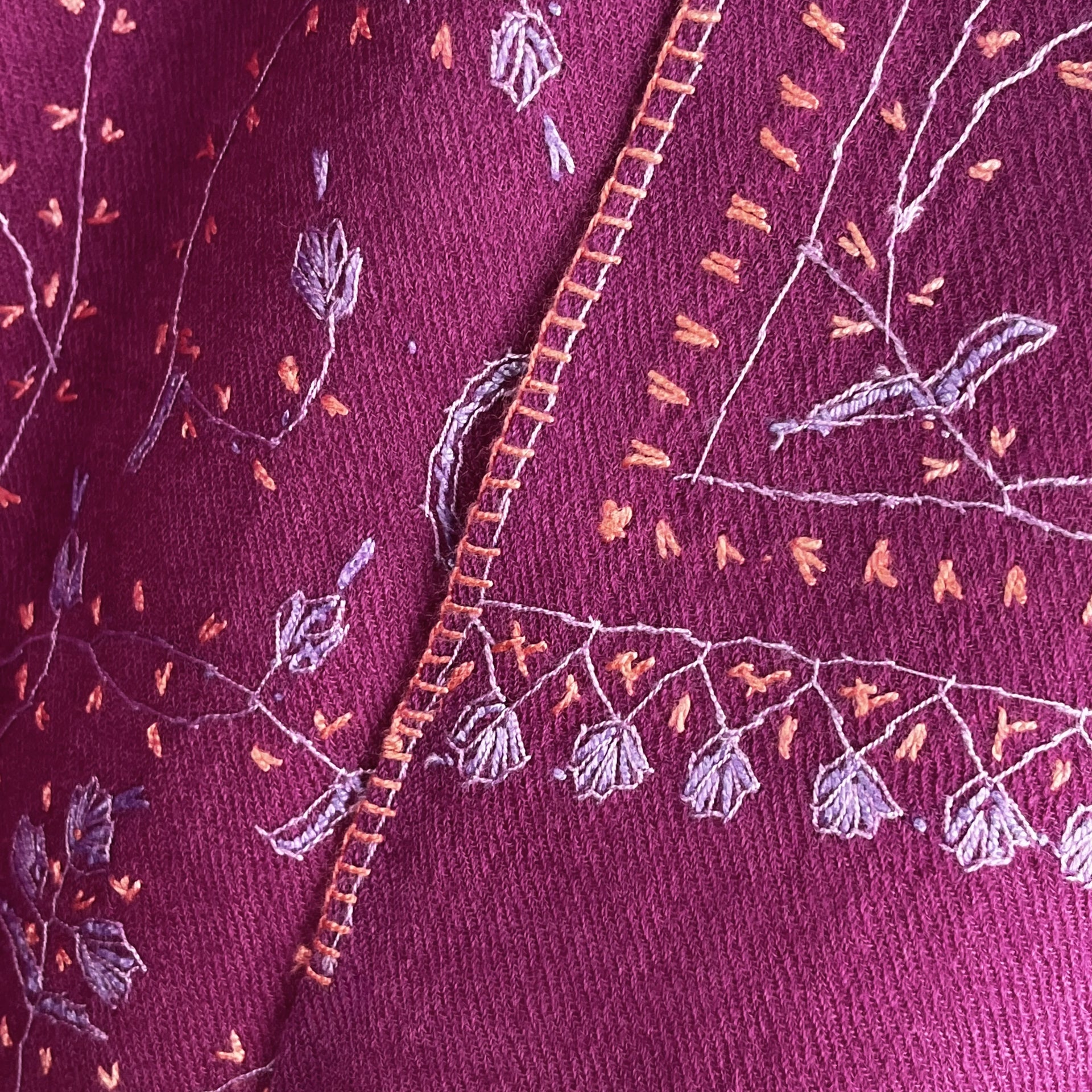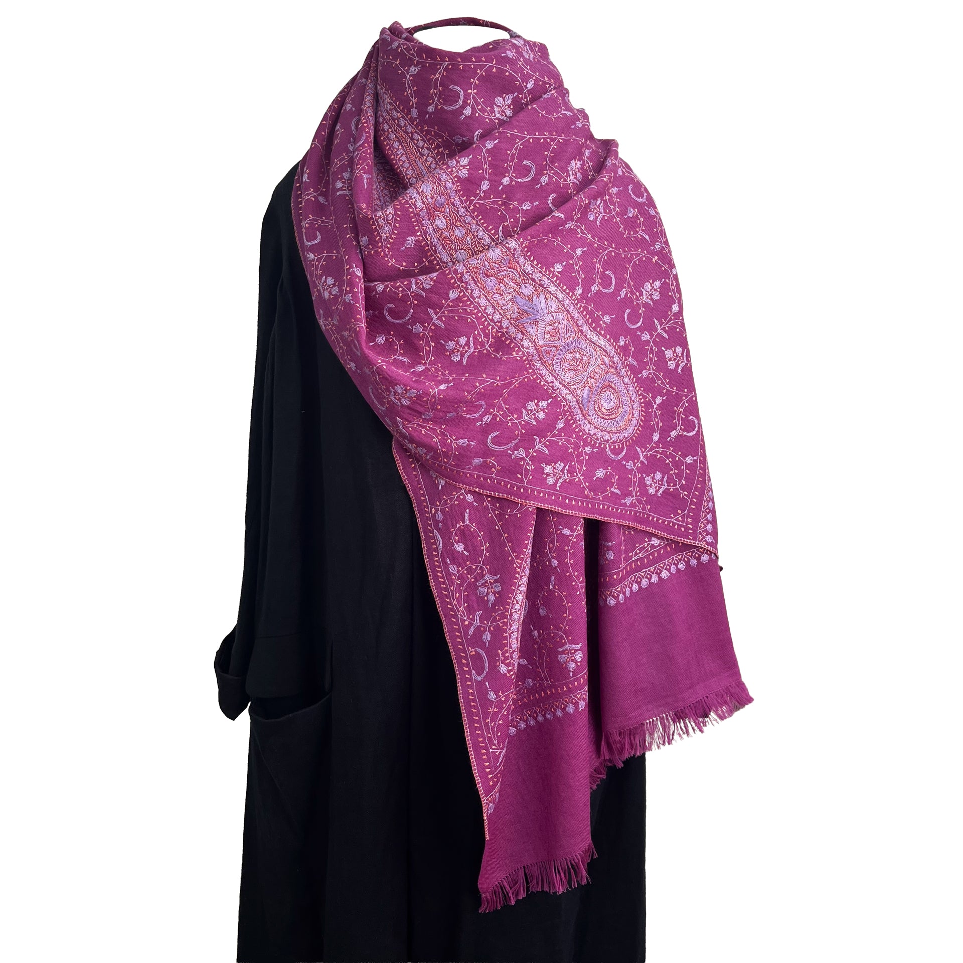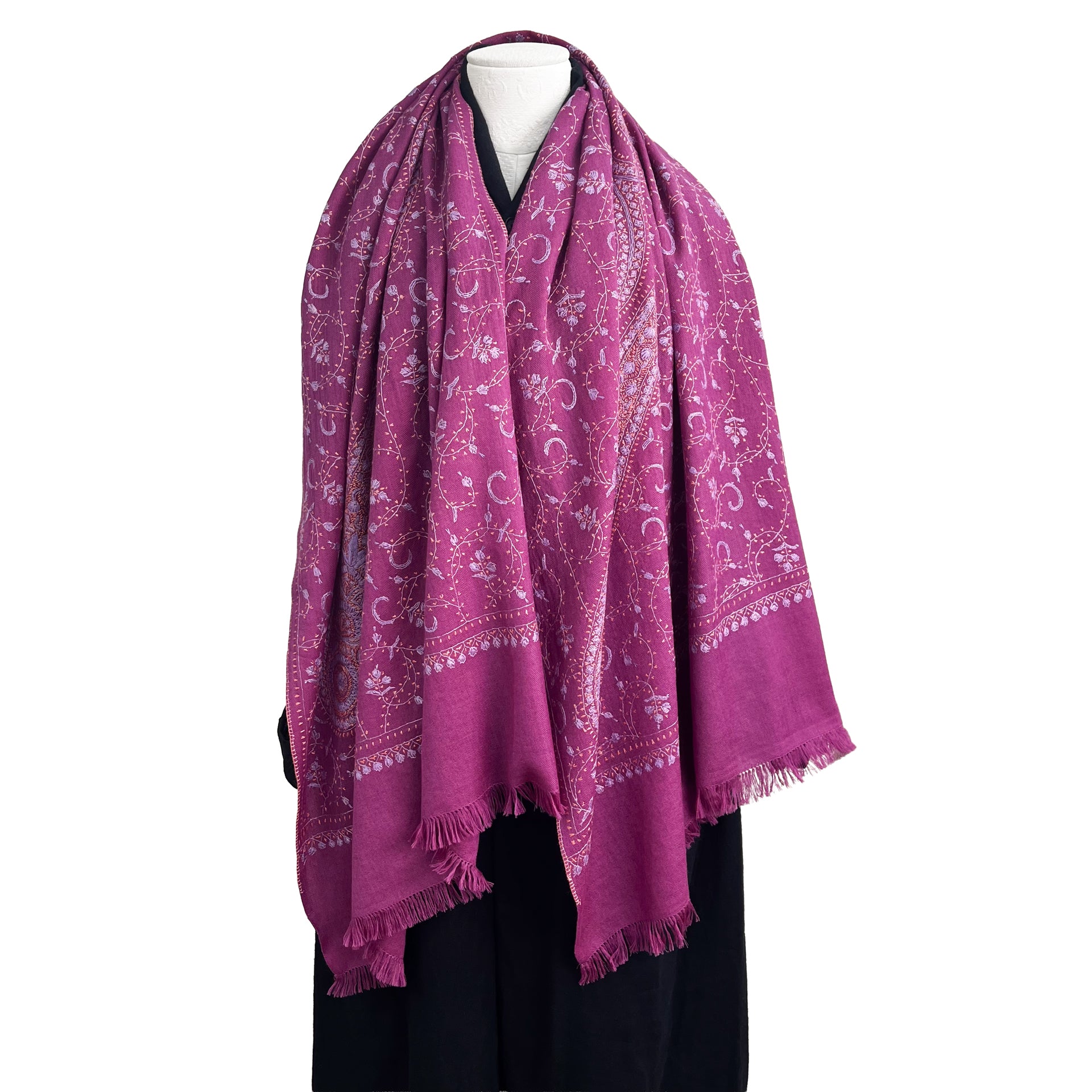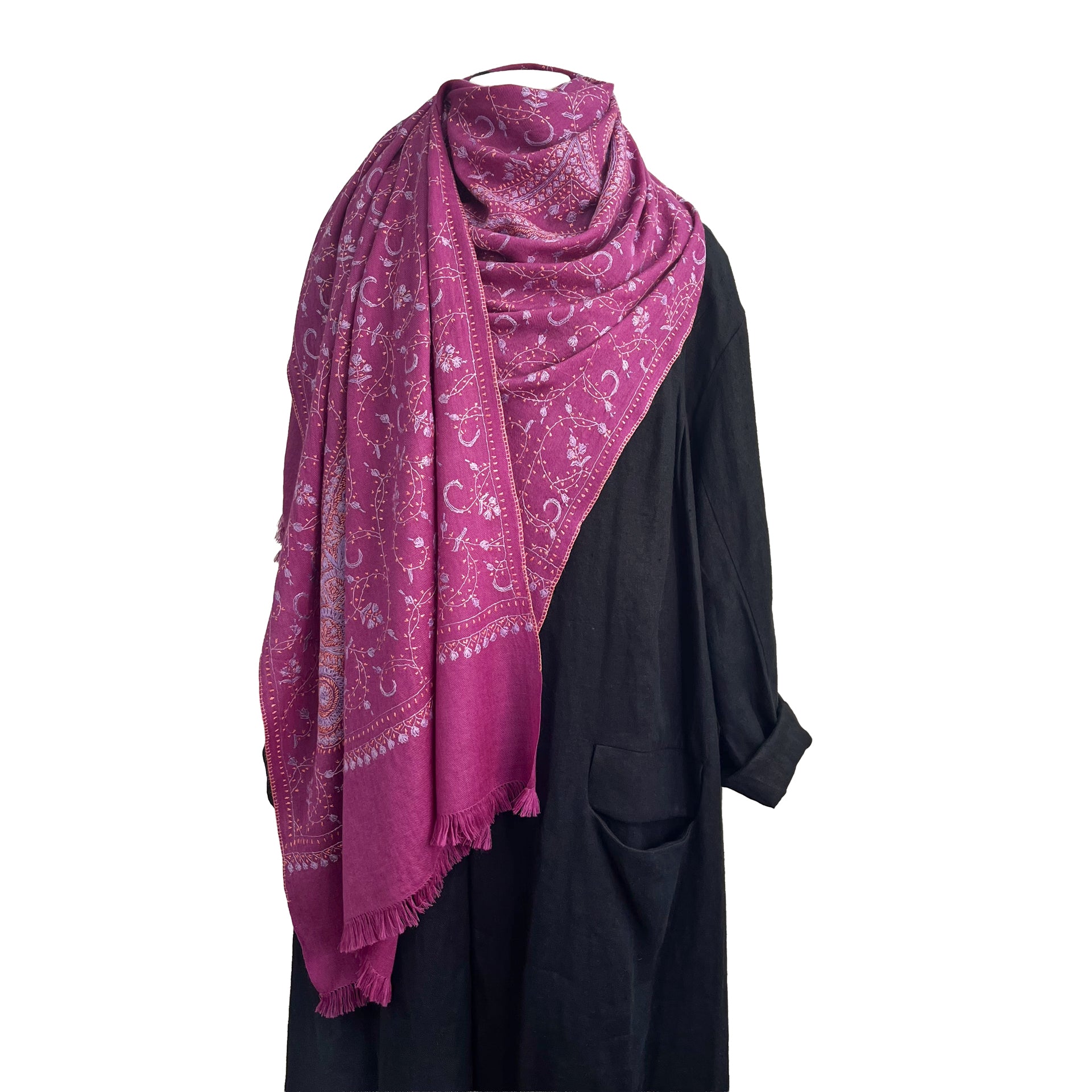 マゼンタの生地一面に、ライトパープルやサーモンピンクなどの色糸で大きなペイズリーや植物モチーフを描いた一枚。