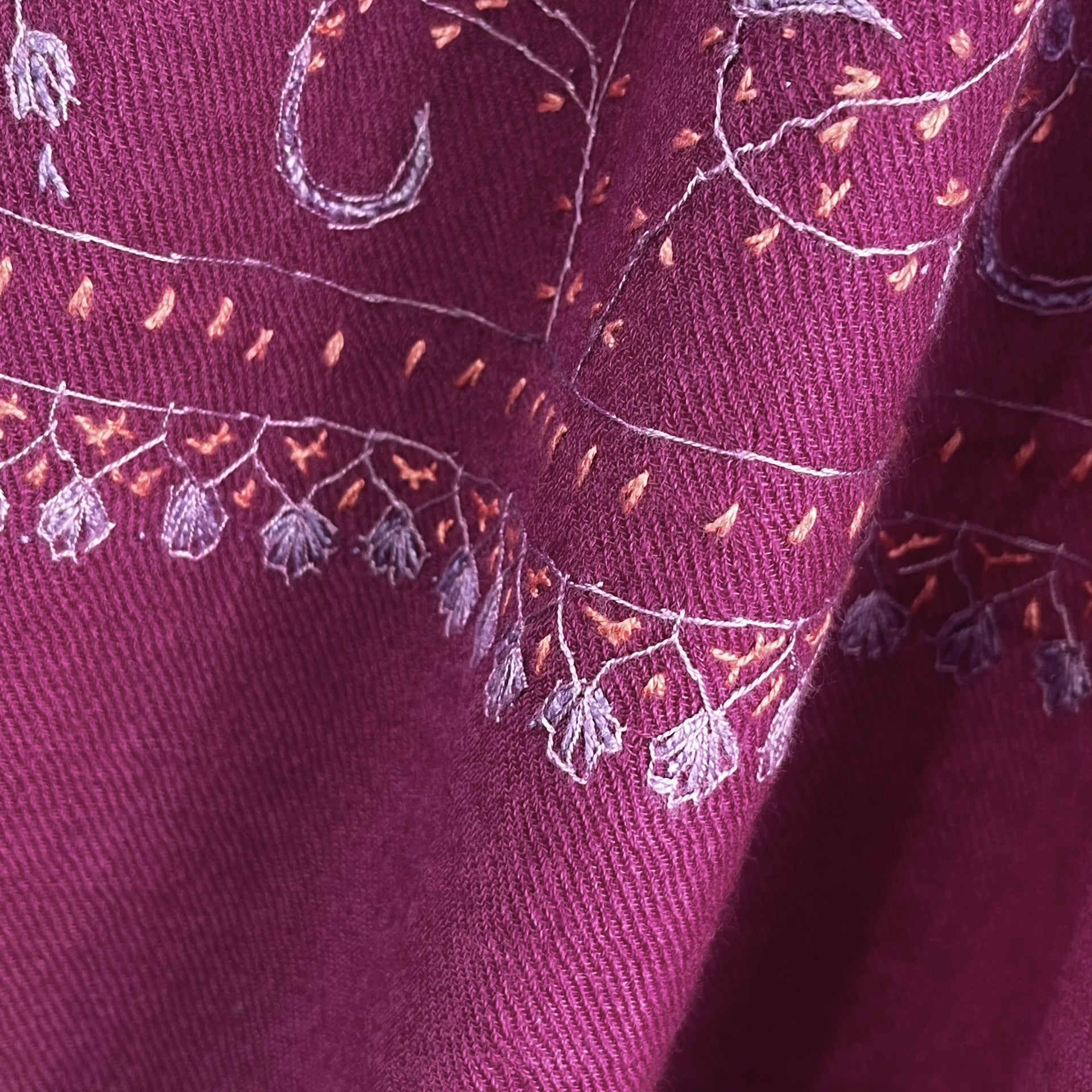 カシミアに刺繍する時はシルクの糸を使い、細かいものは一枚のショールに5年以上かかることもある職人技の光る刺繍技術です。