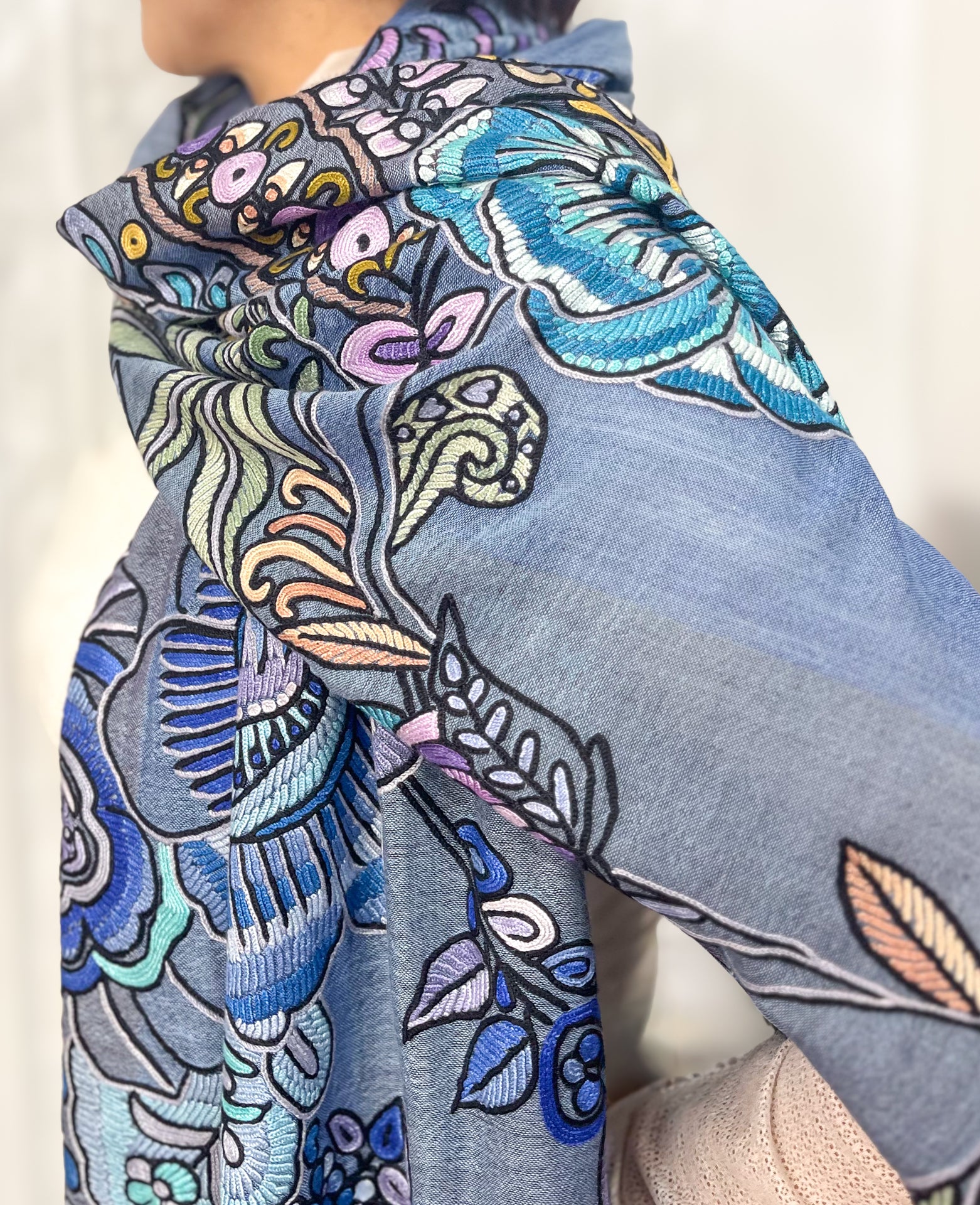 3色の縦糸を使ってパープル、ブルーブルーグレーの3色にブロッキングされた生地に、ダイナミックに印象的な大輪のお花が全面に施された手刺繍ストールです。