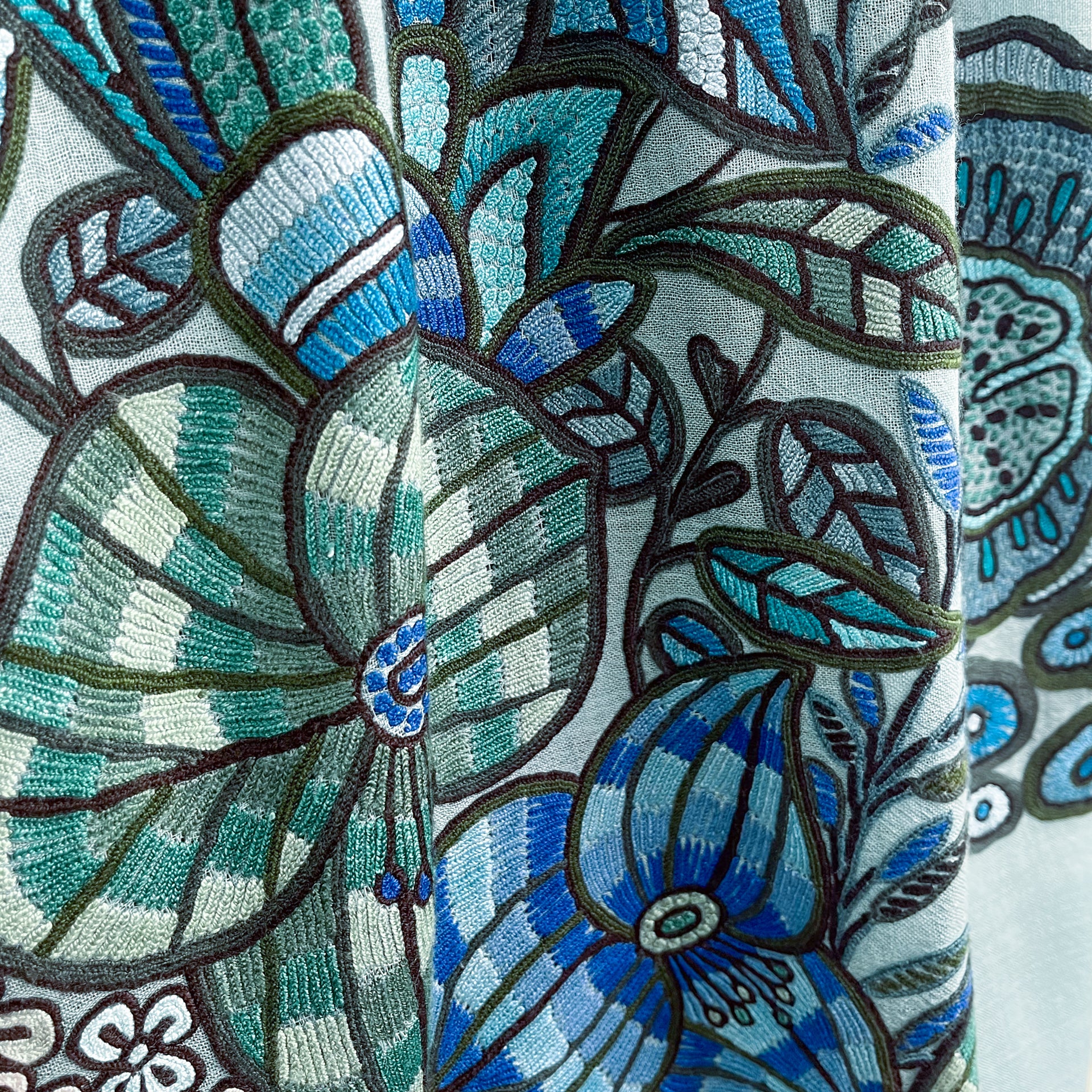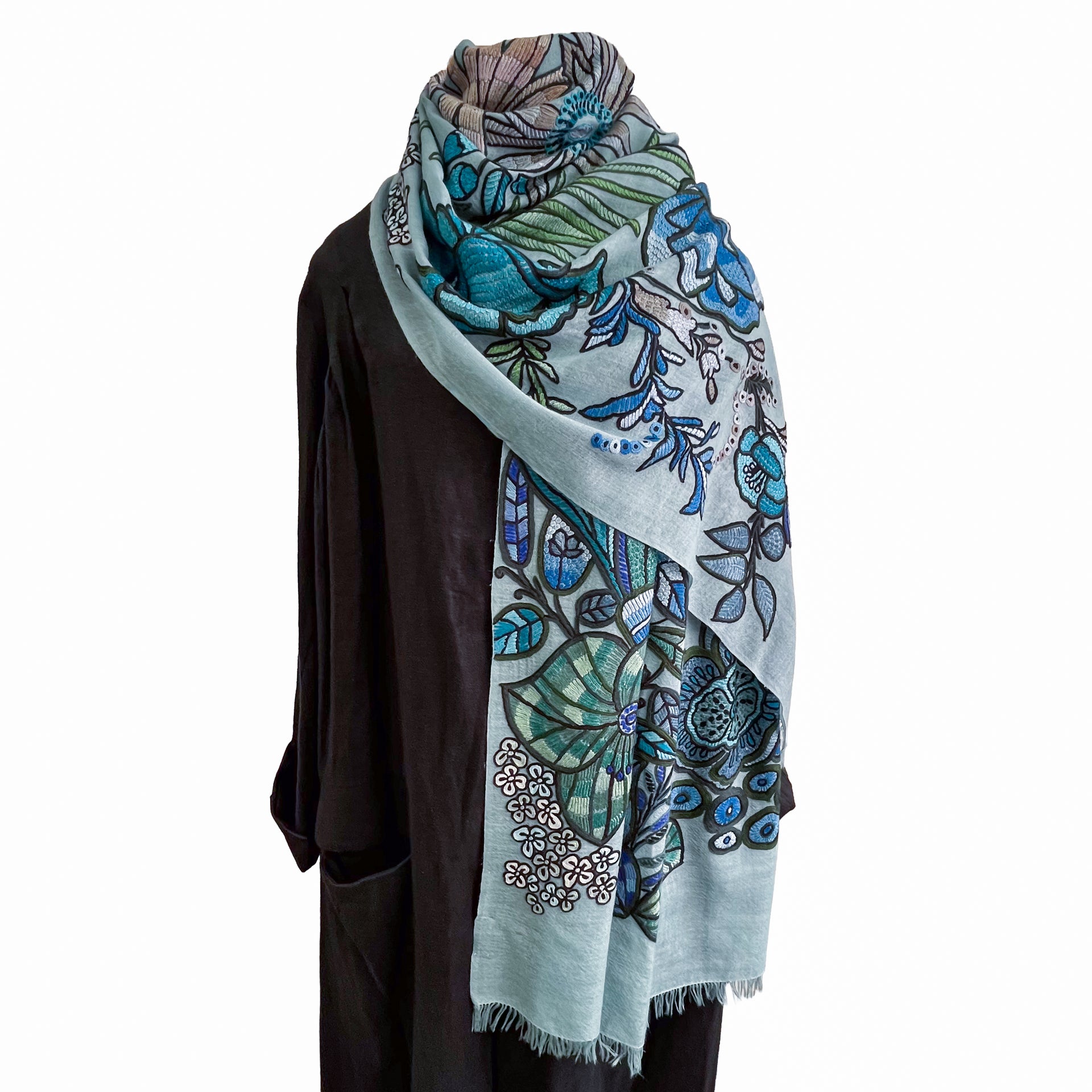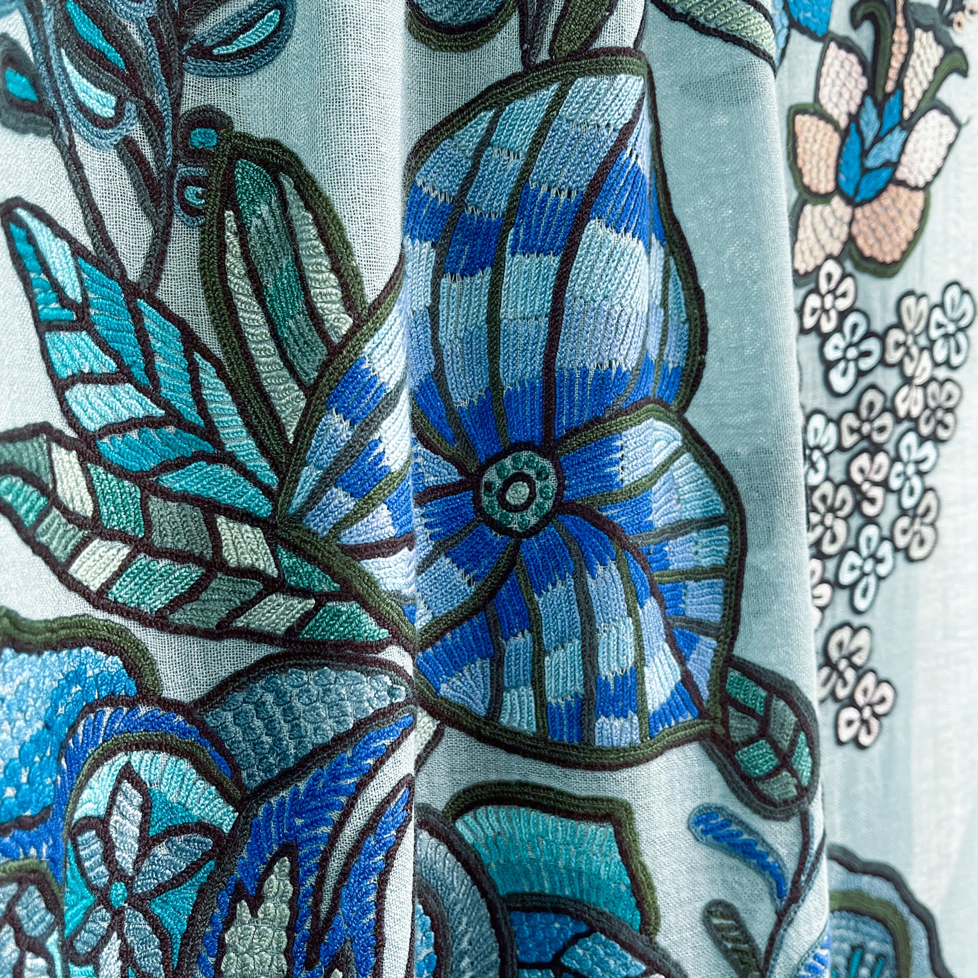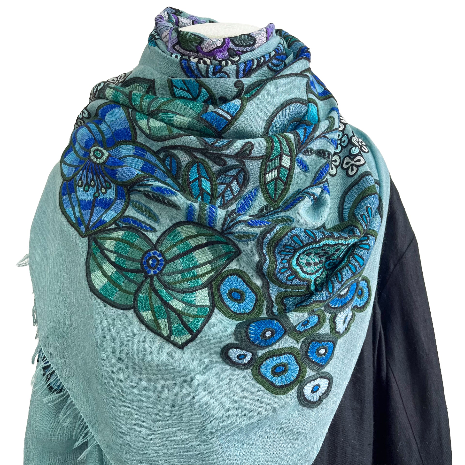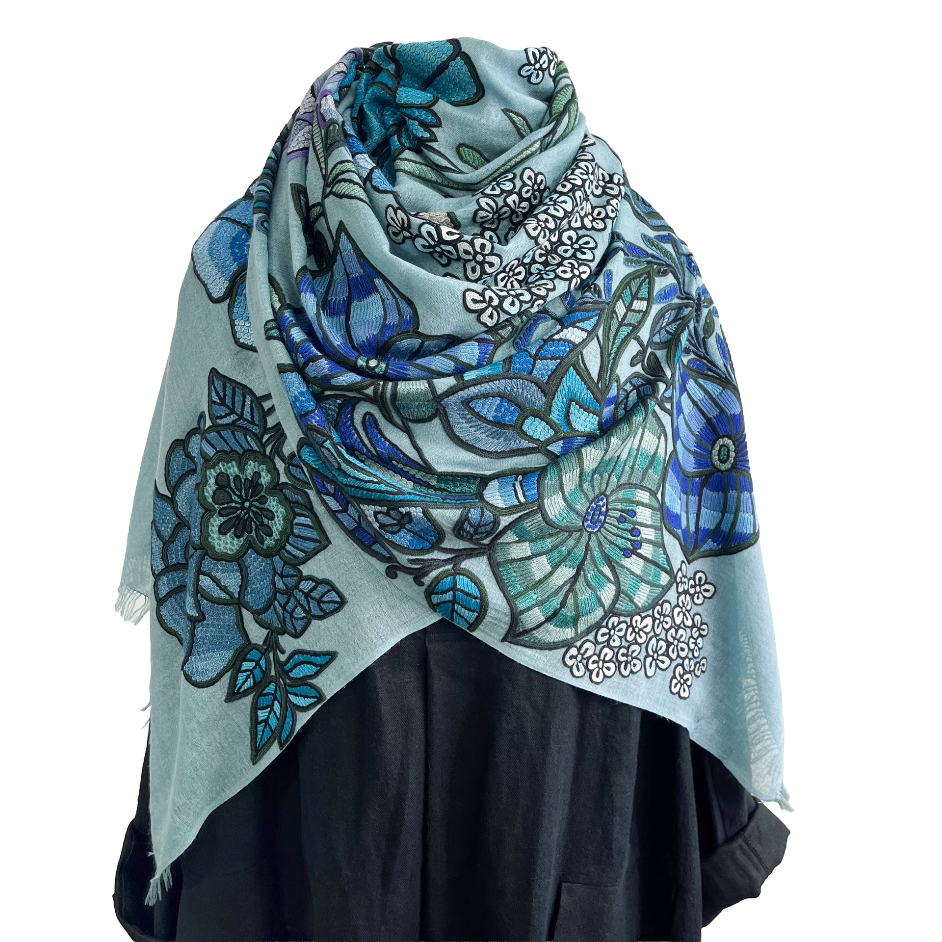 DREAM GARDEN 薄手ウール&シルク アリー手刺繍ストール (ダルターコイズ)