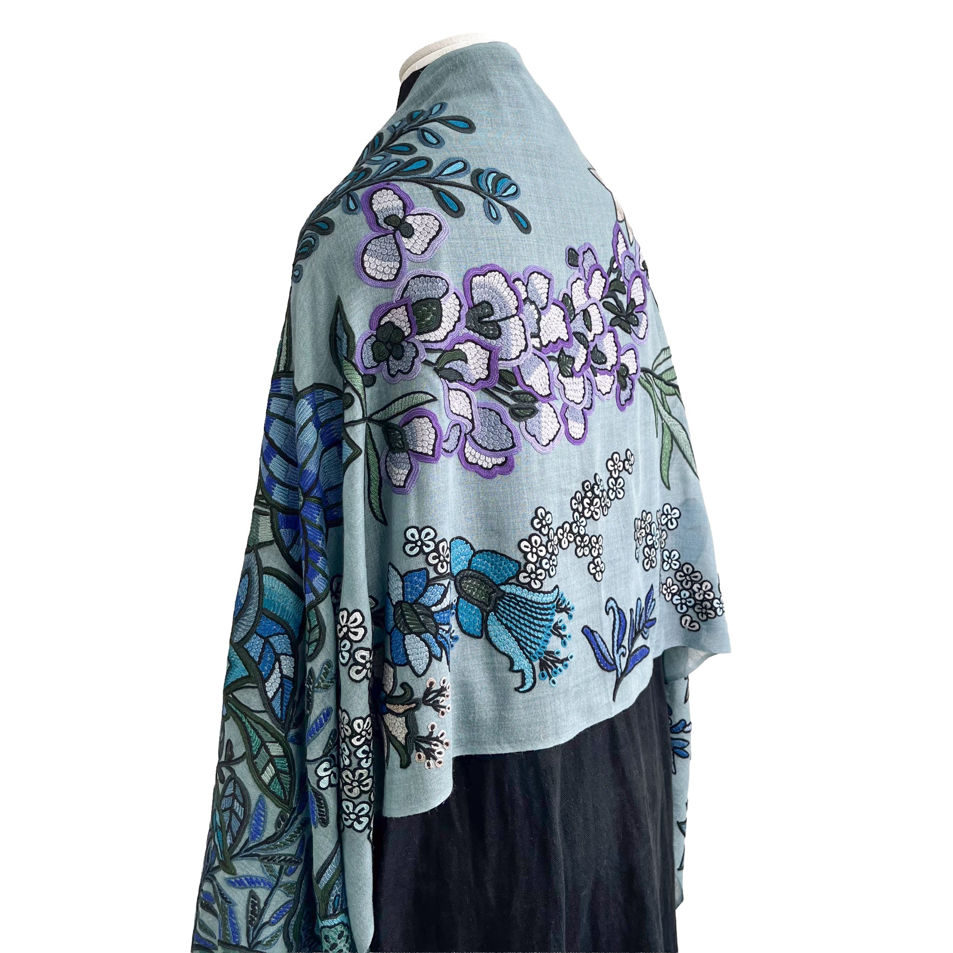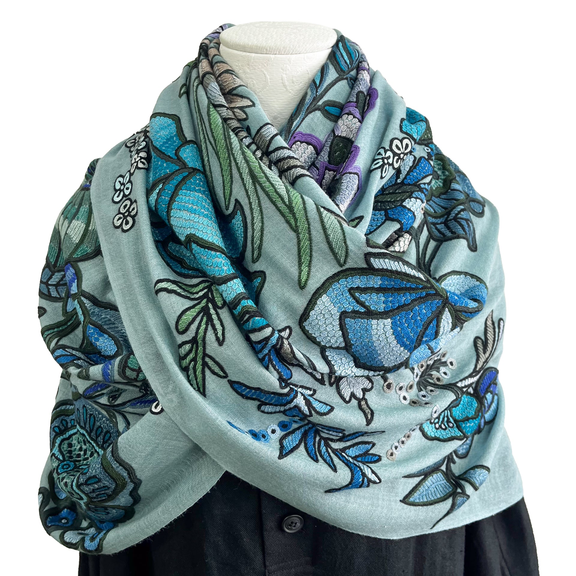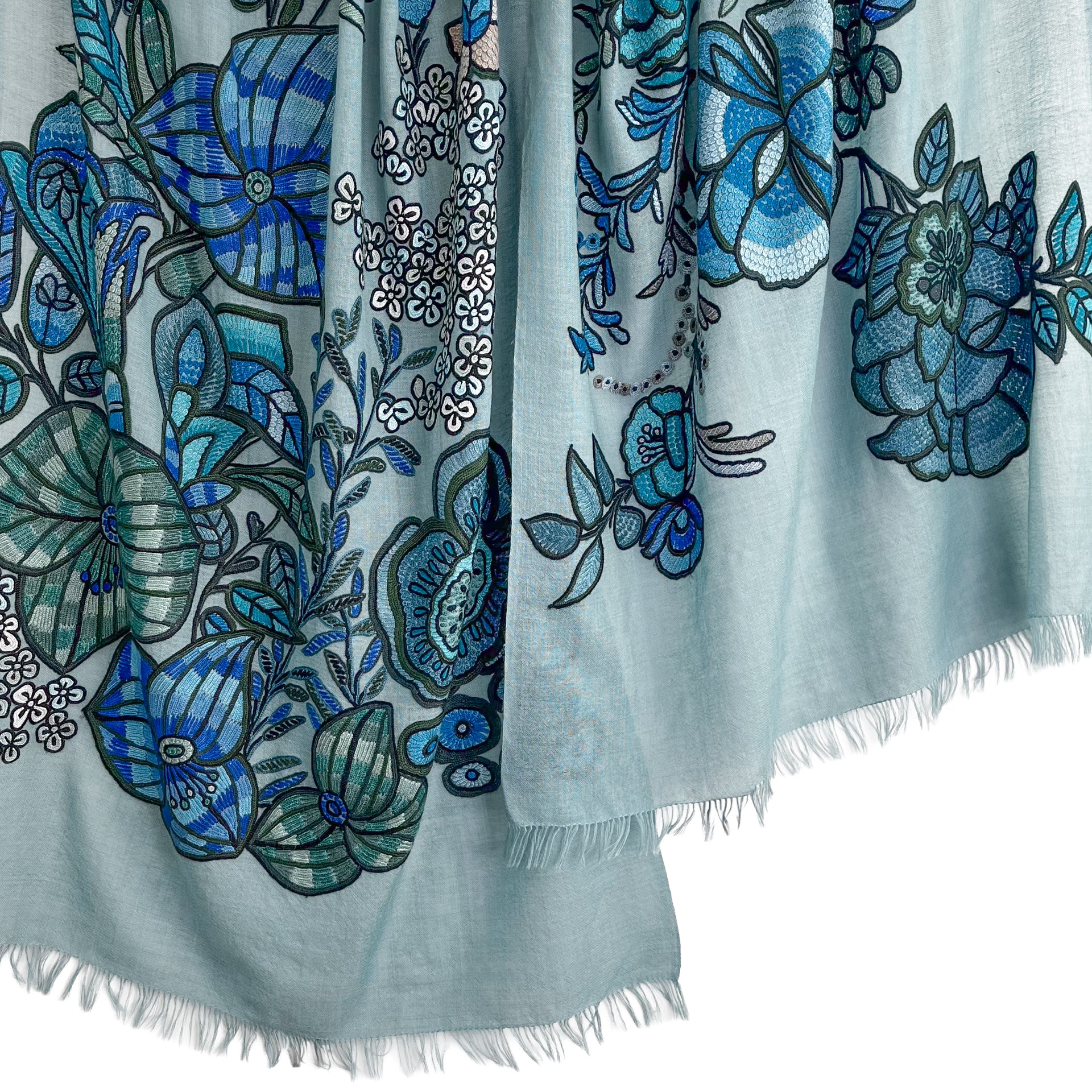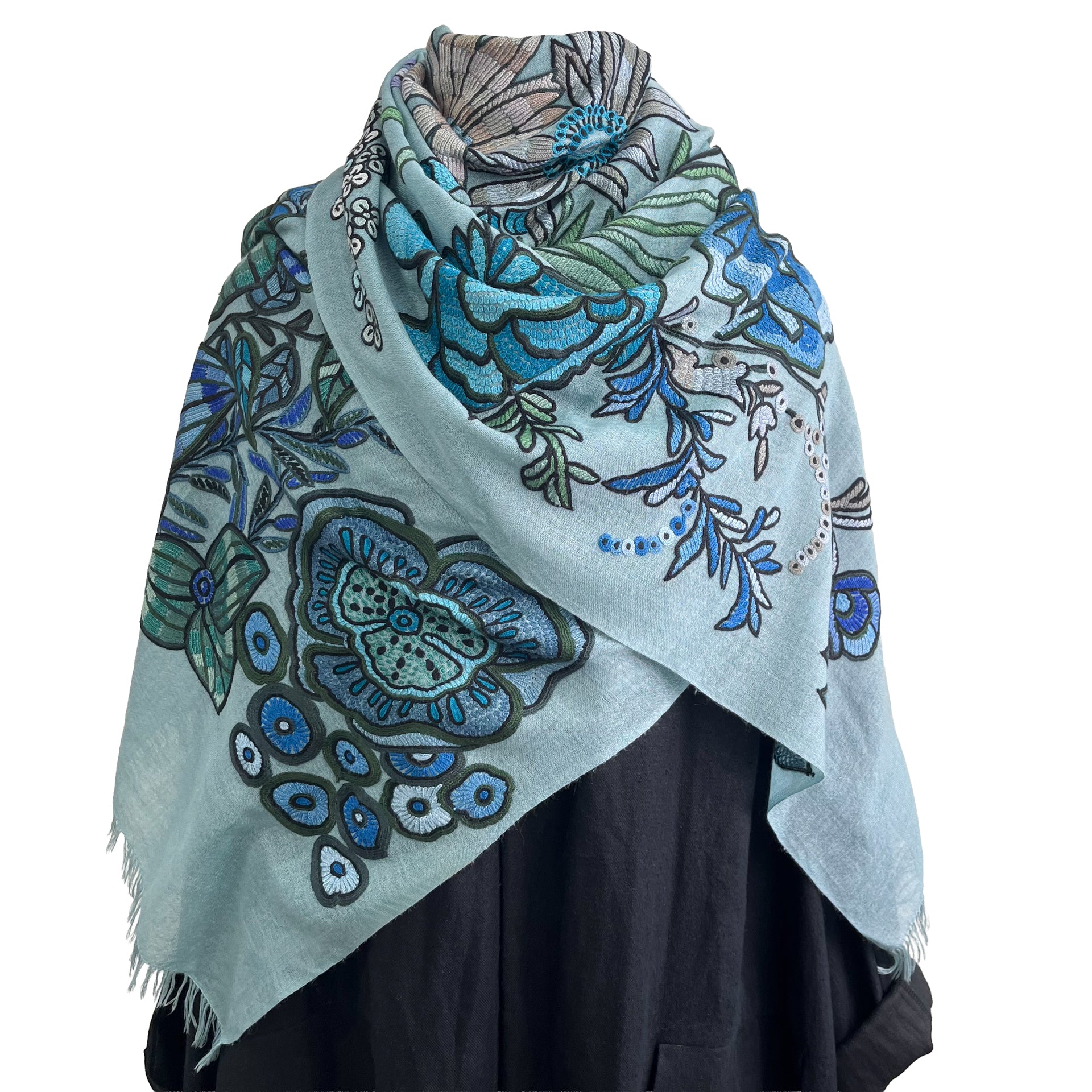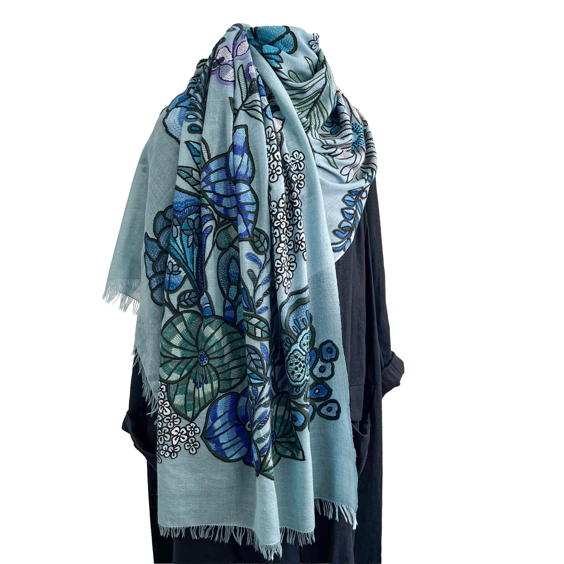 DREAM GARDEN 薄手ウール&シルク アリー手刺繍ストール (ダルターコイズ)