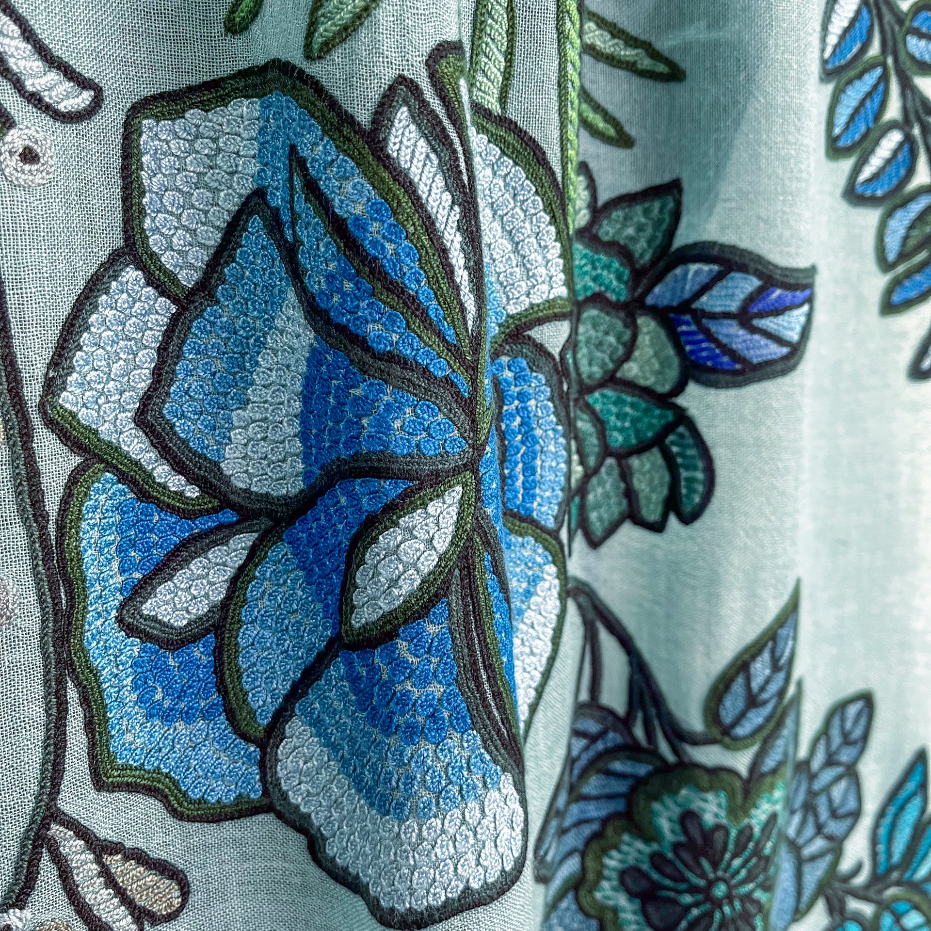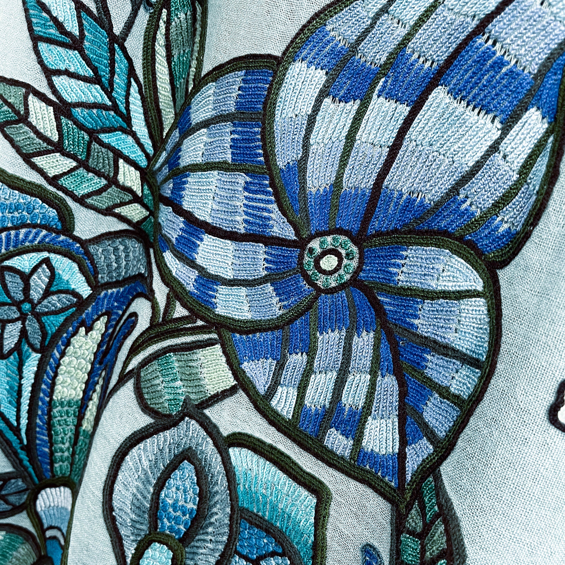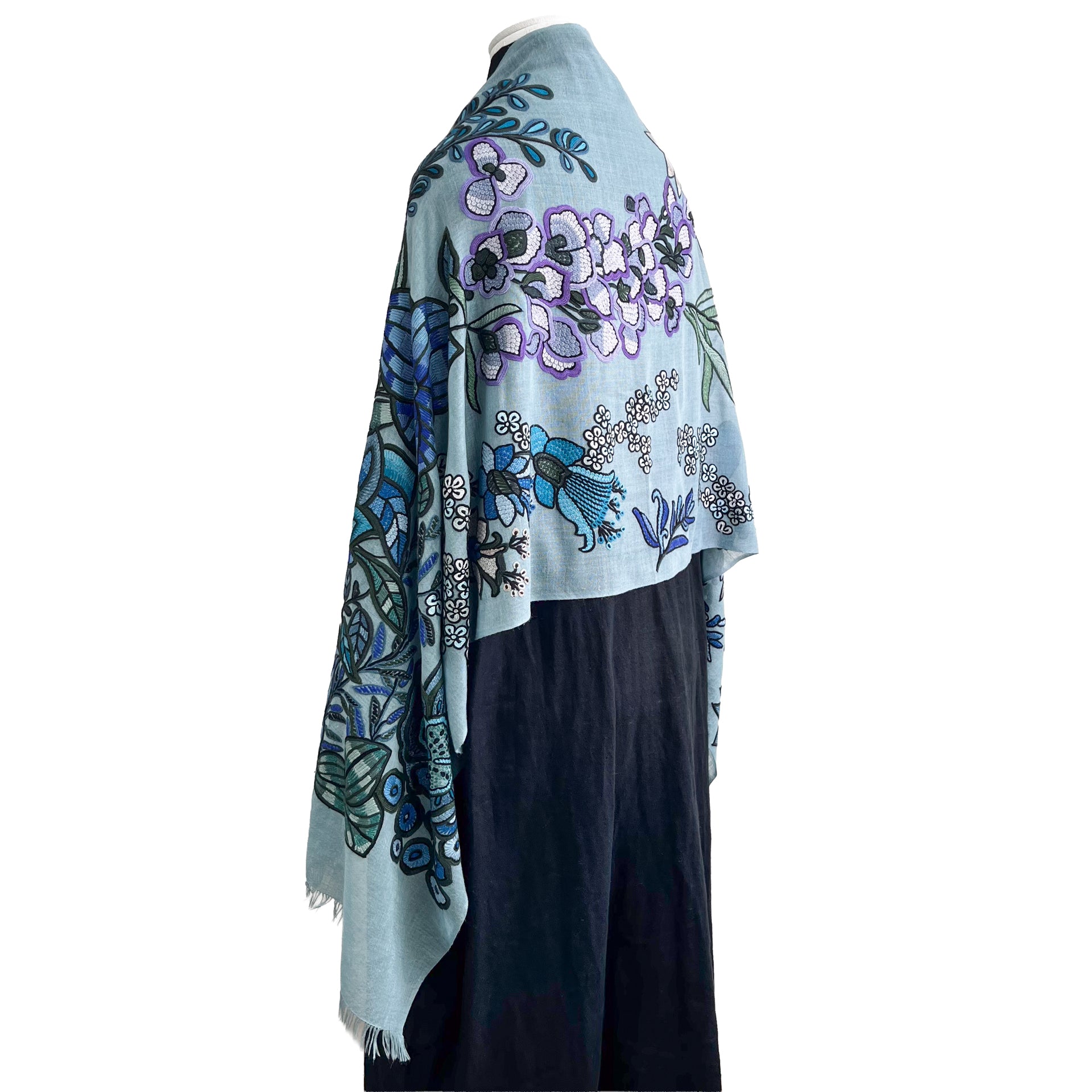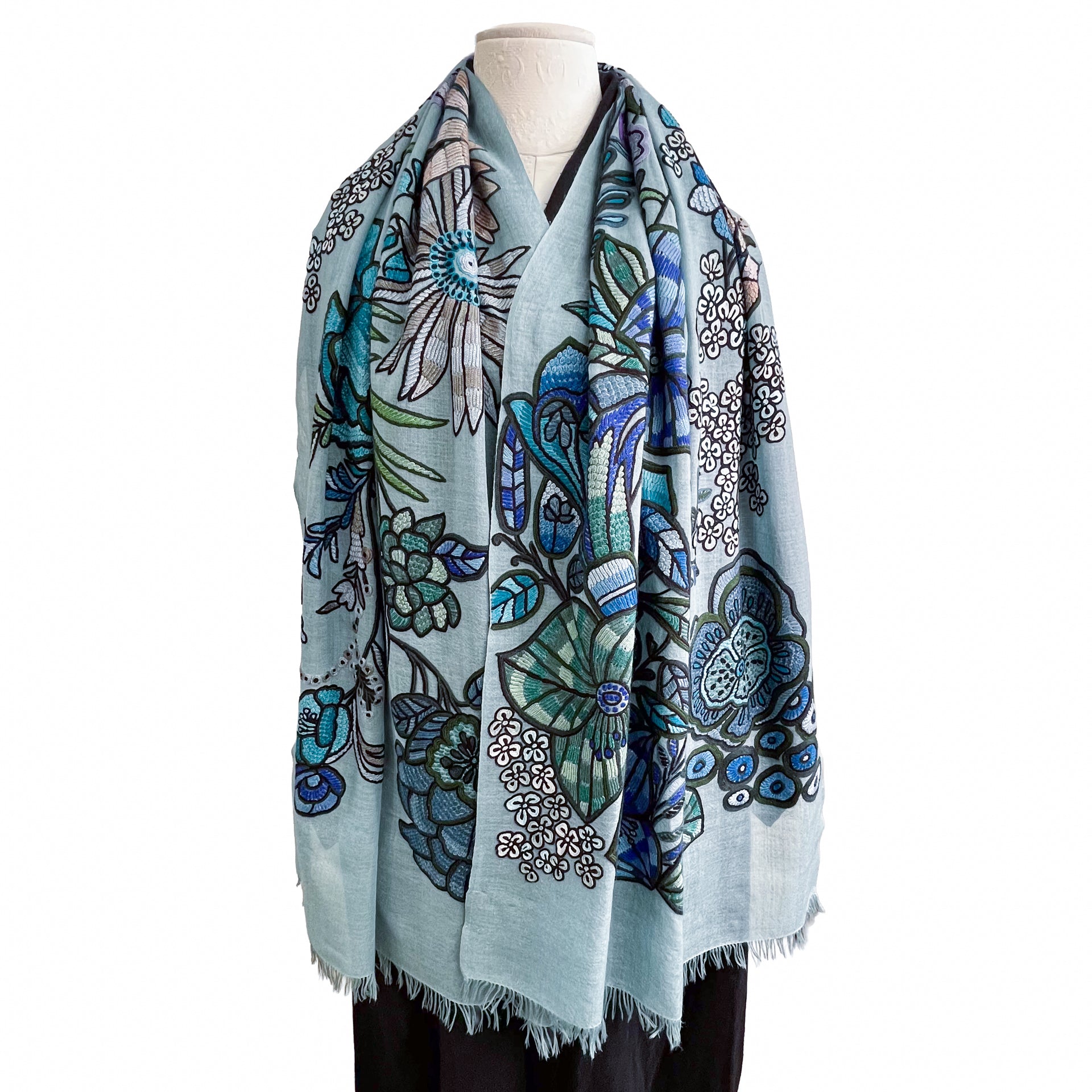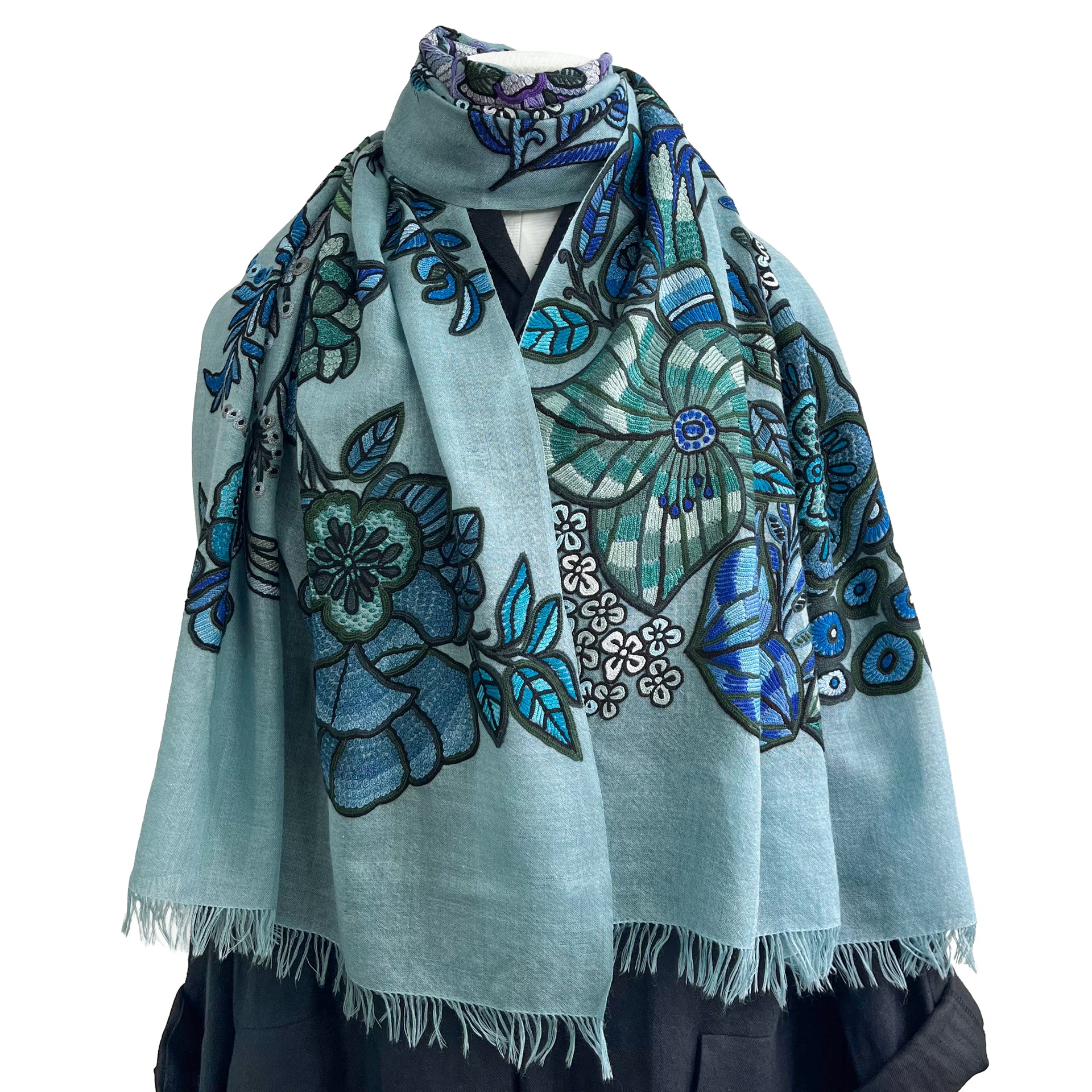 DREAM GARDEN 薄手ウール&シルク アリー手刺繍ストール (ダルターコイズ)