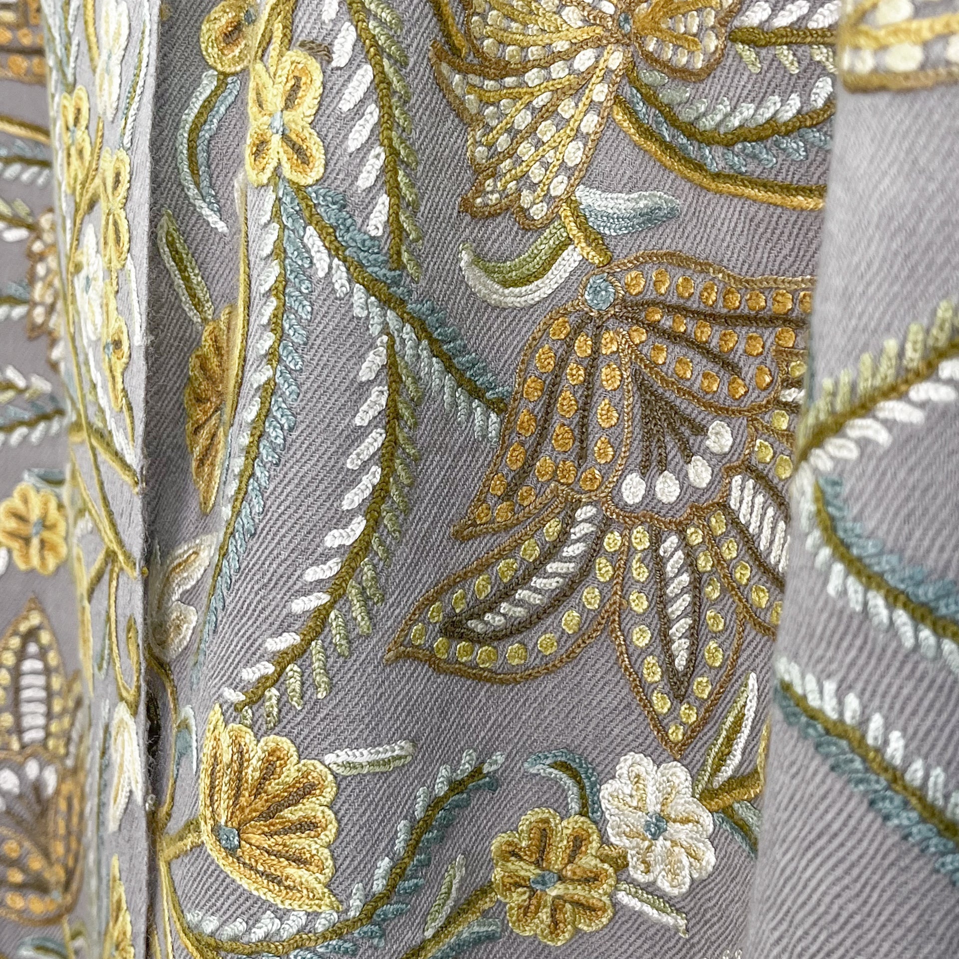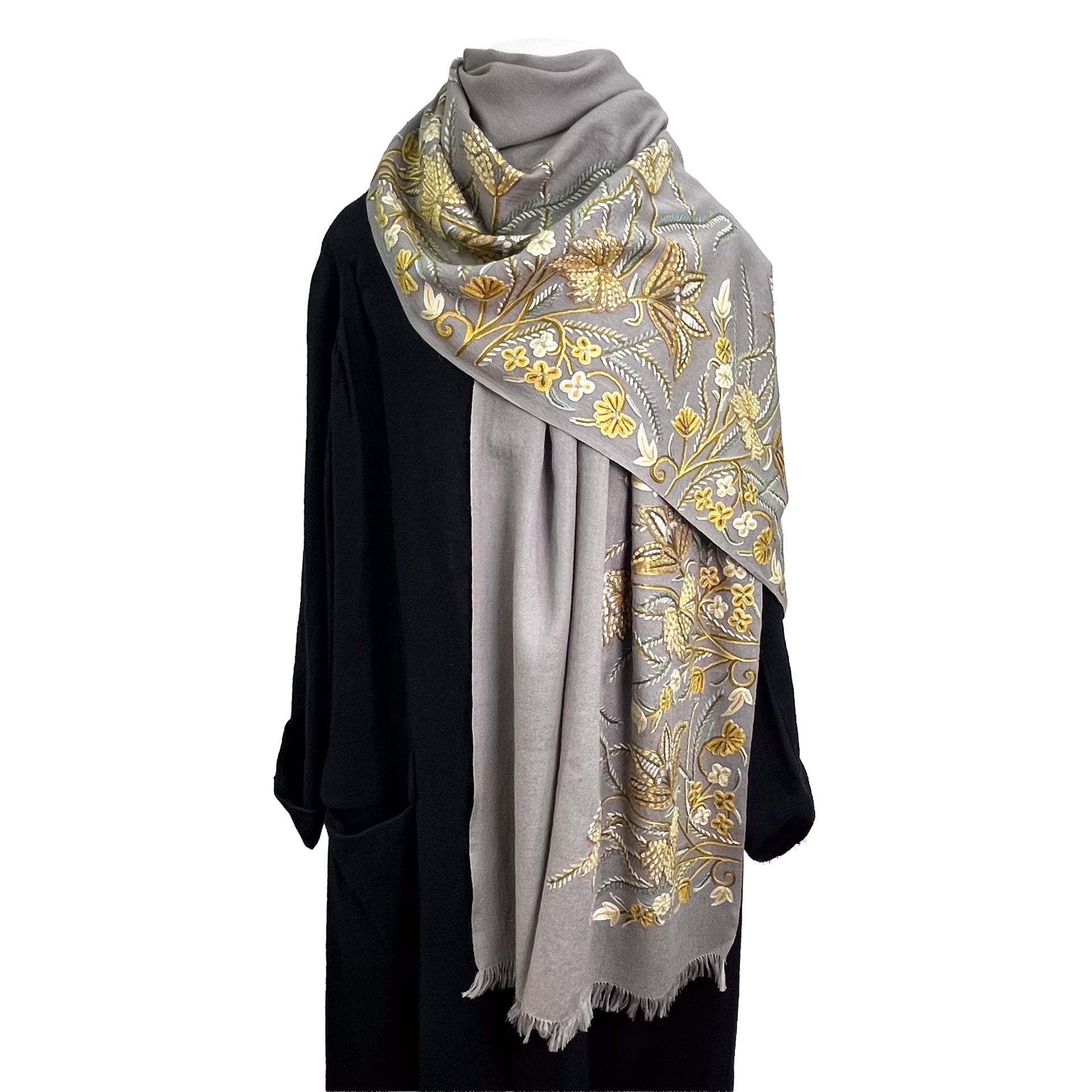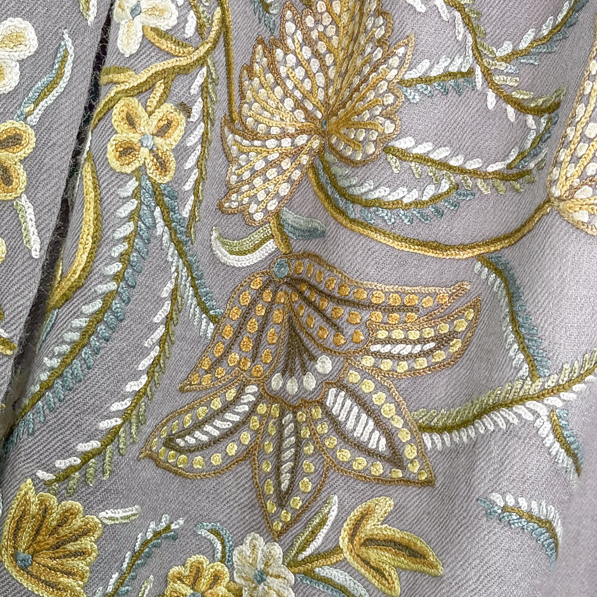 グレーの生地に水辺に咲く花々を思わせる洗練されたアリー手刺繍を施したストールです。