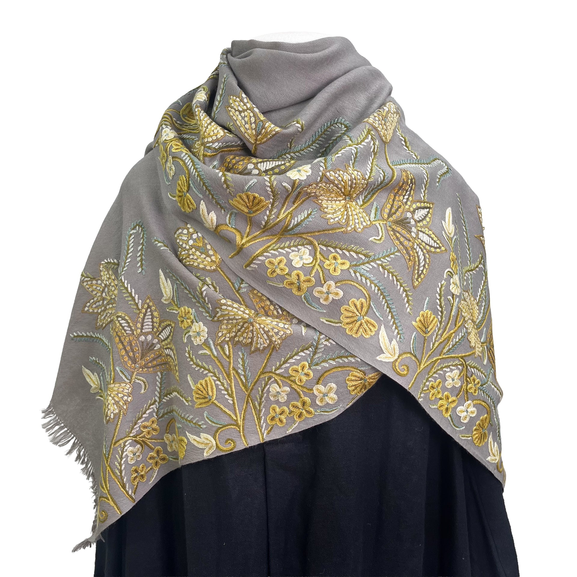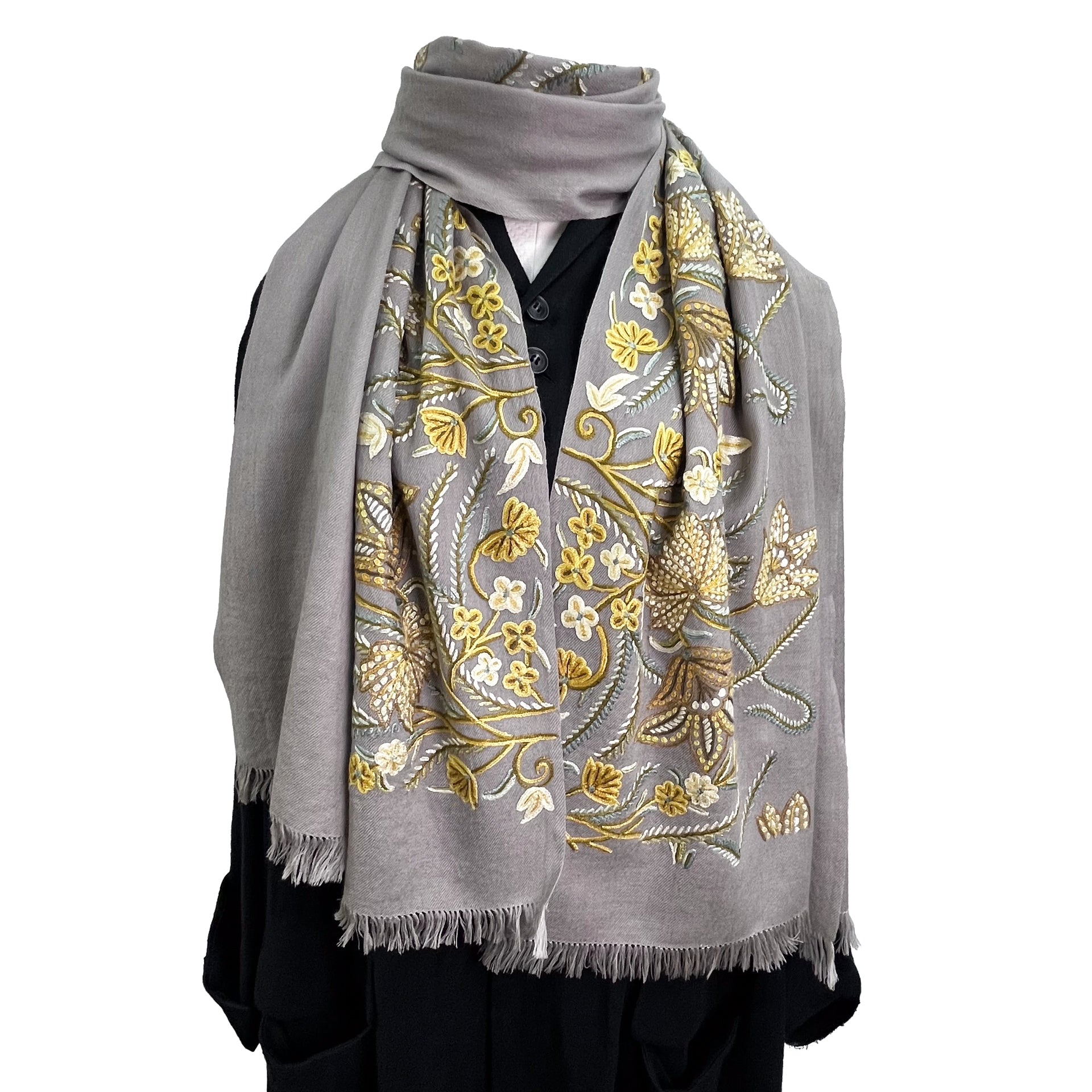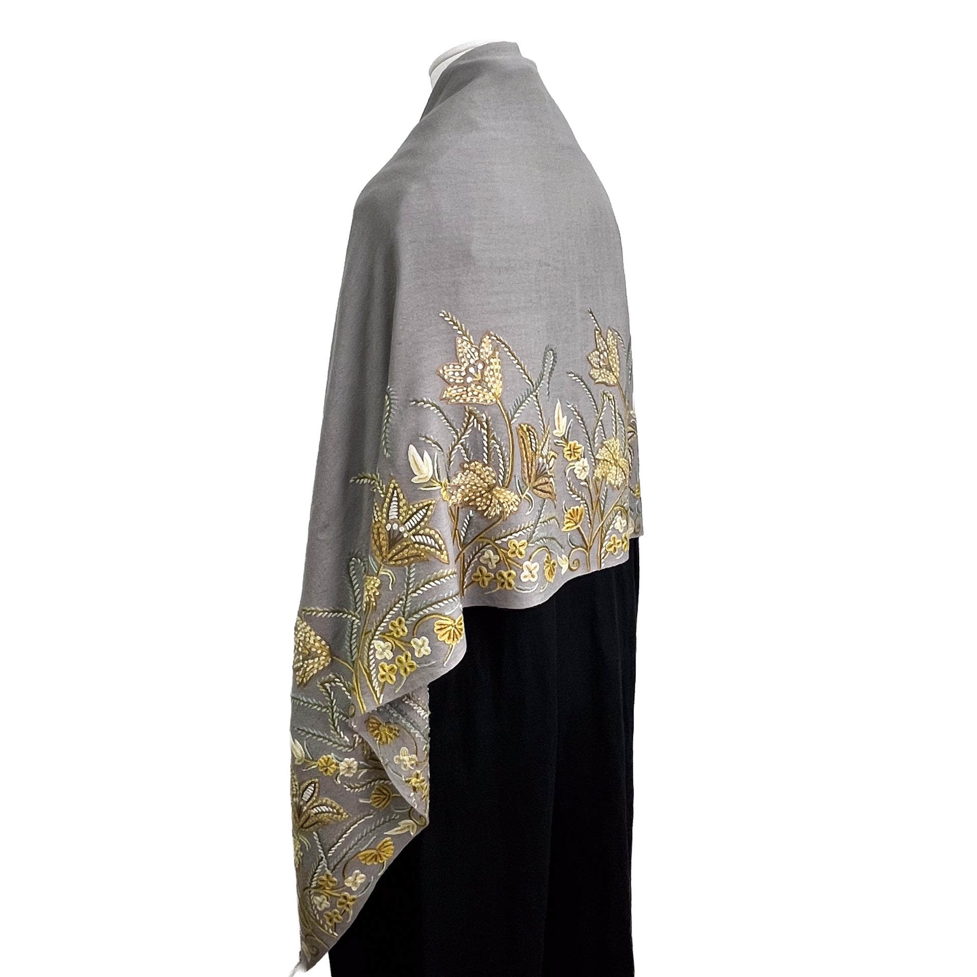 フラワーモチーフウール アリー手刺繍ストール(グレージュ/イエロー)