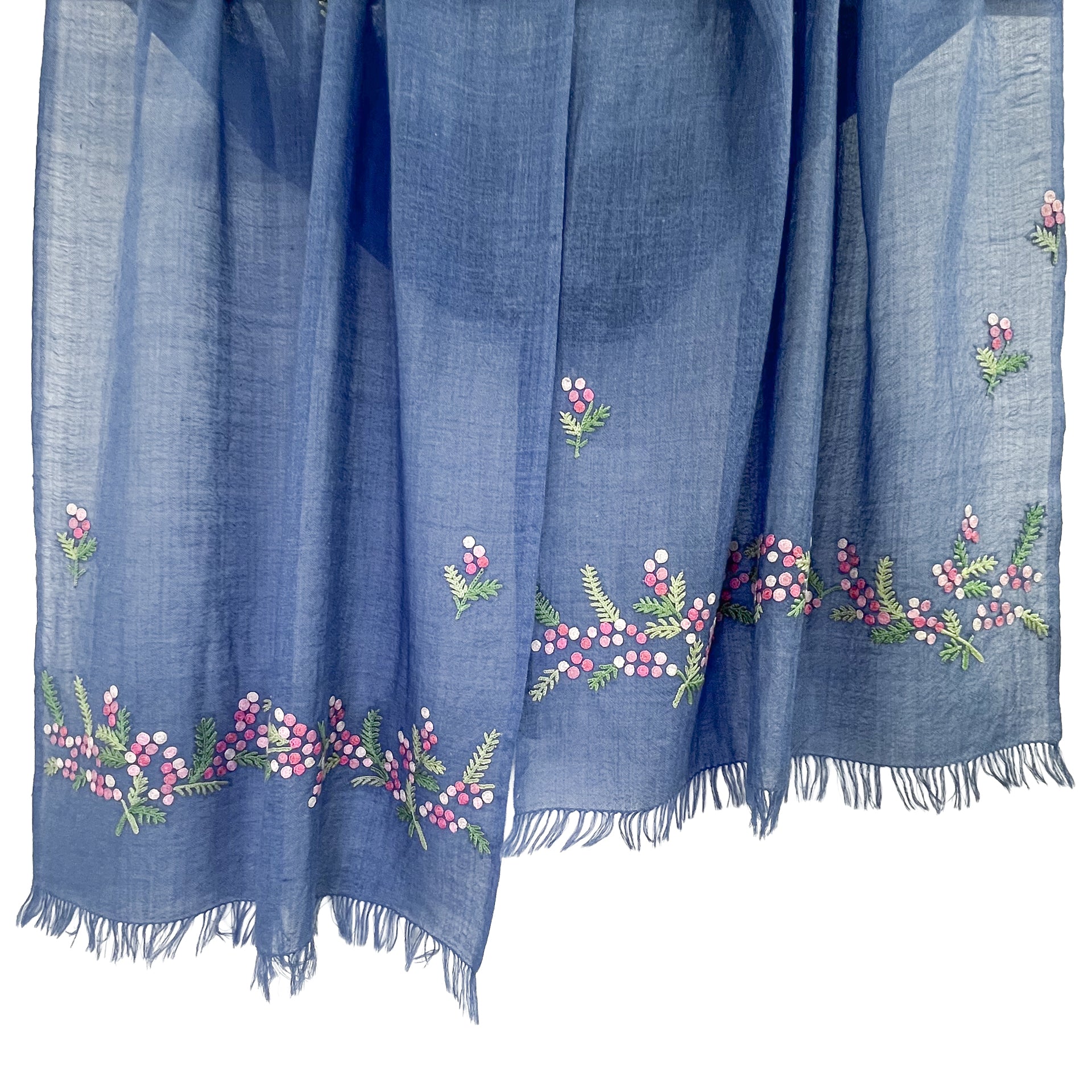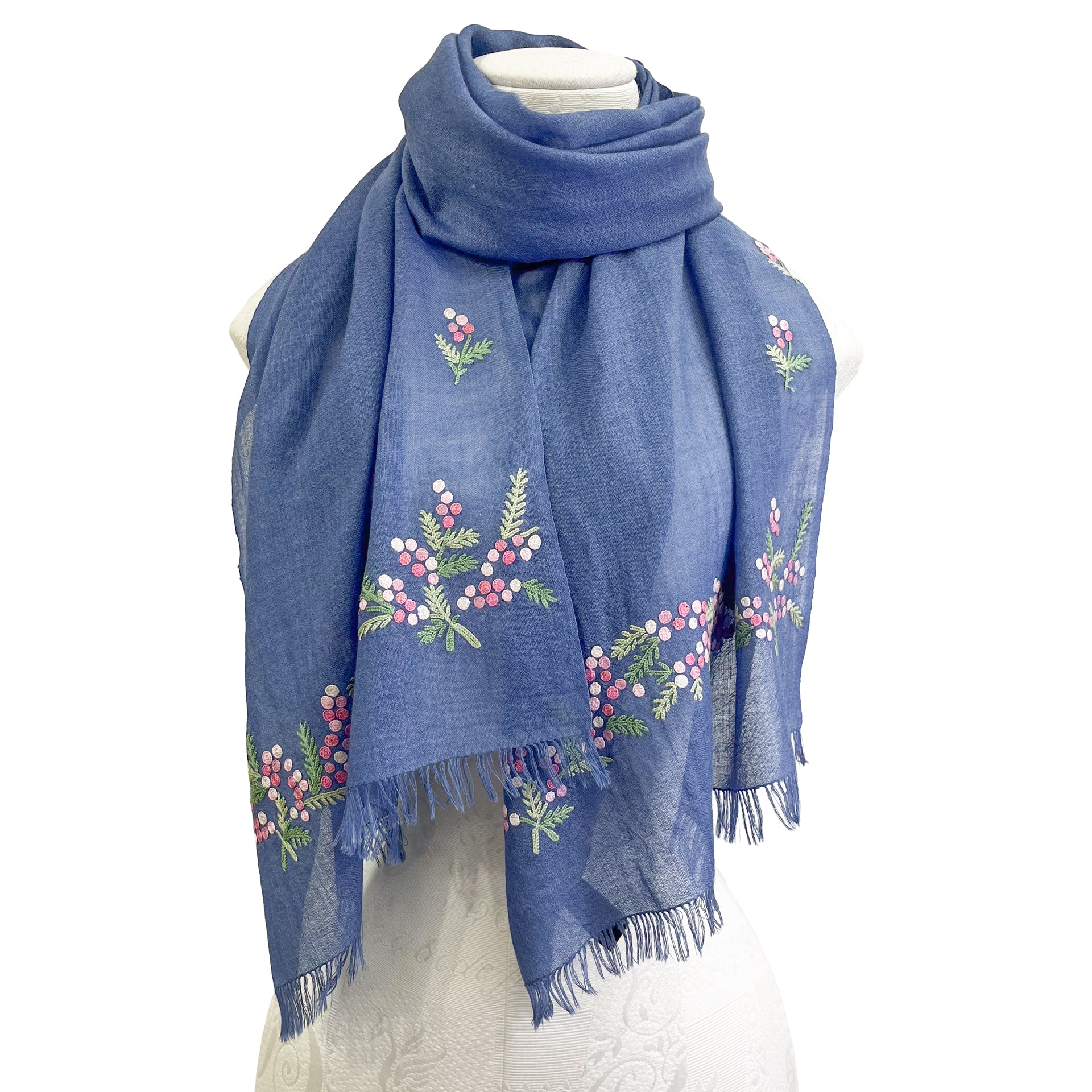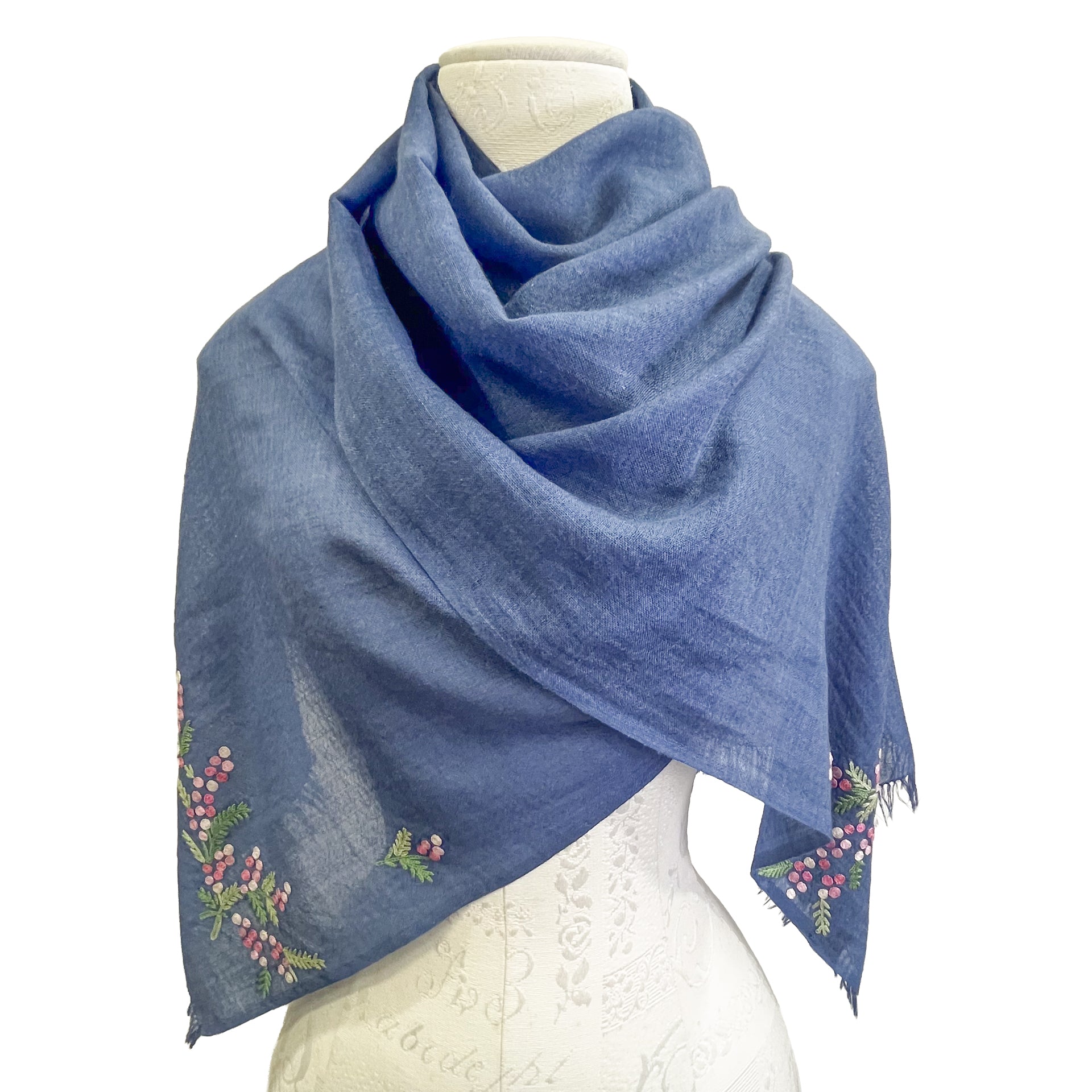 ミモザ 薄手ウール&シルク アリー手刺繍細幅ストール (ネイビー)