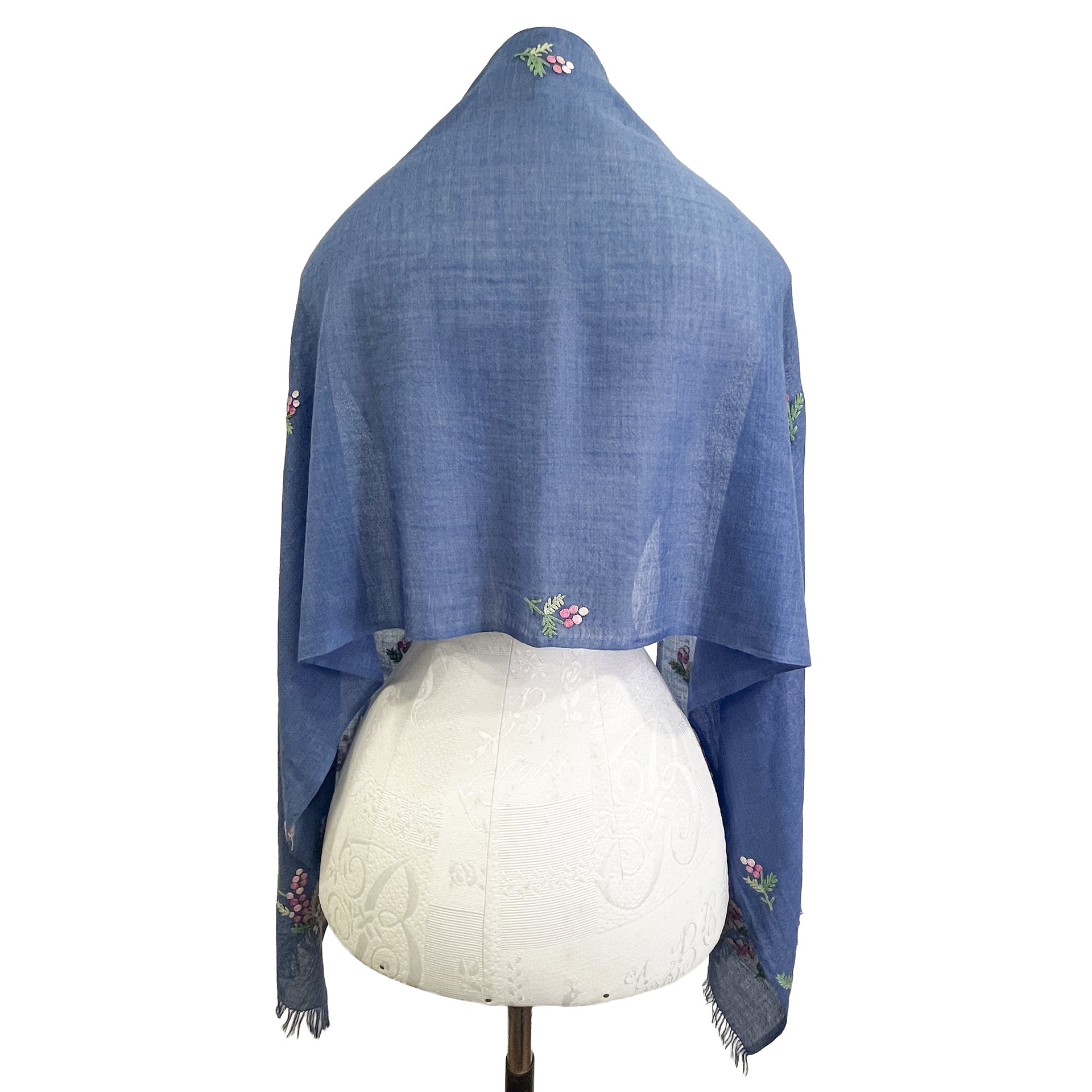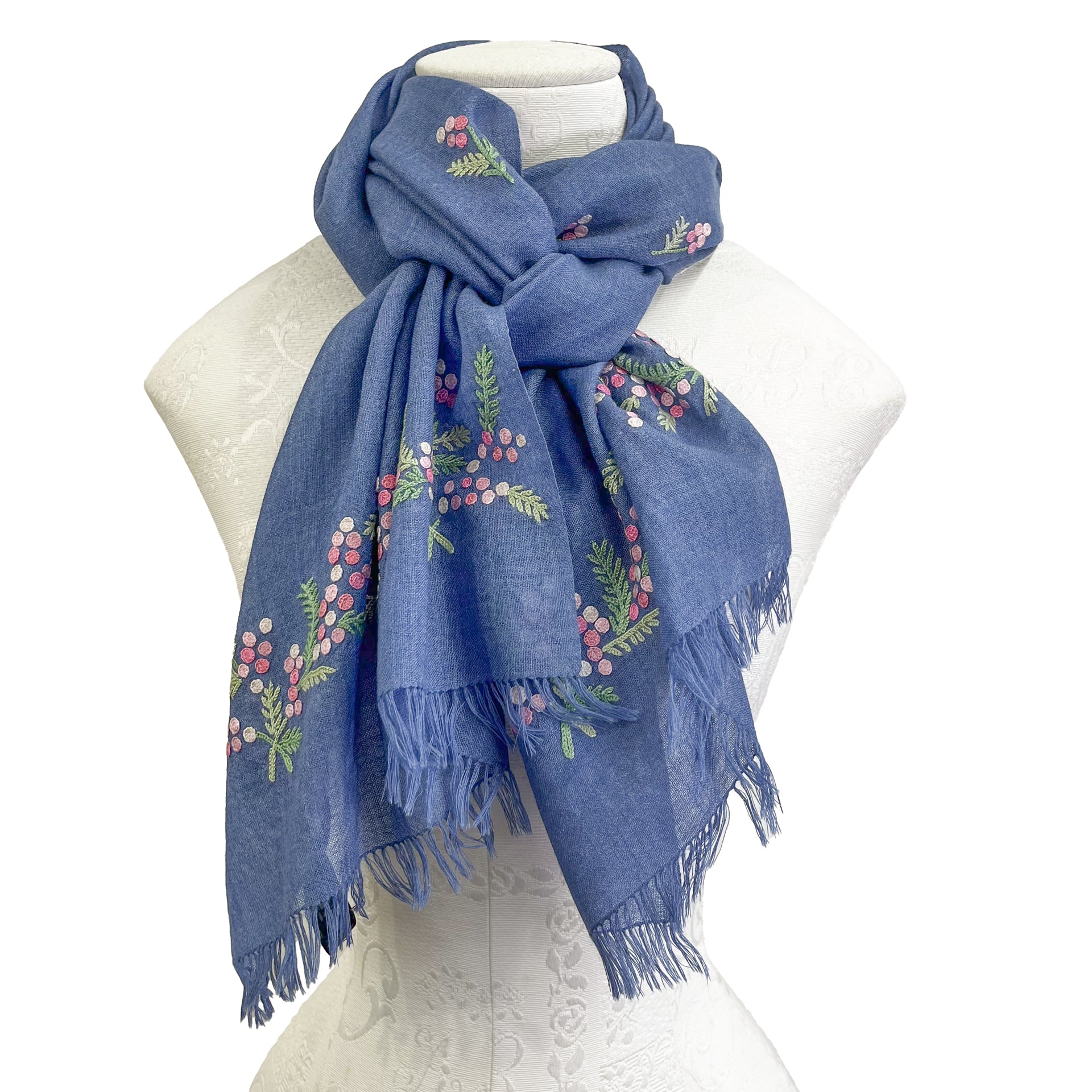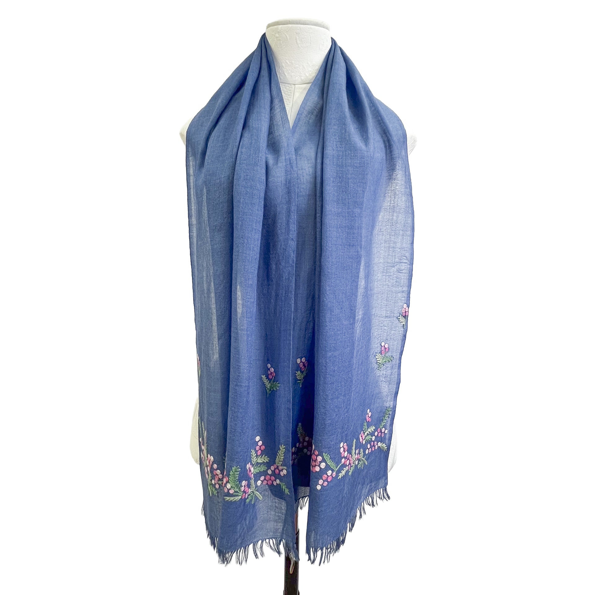 ミモザ 薄手ウール&シルク アリー手刺繍細幅ストール (ネイビー)