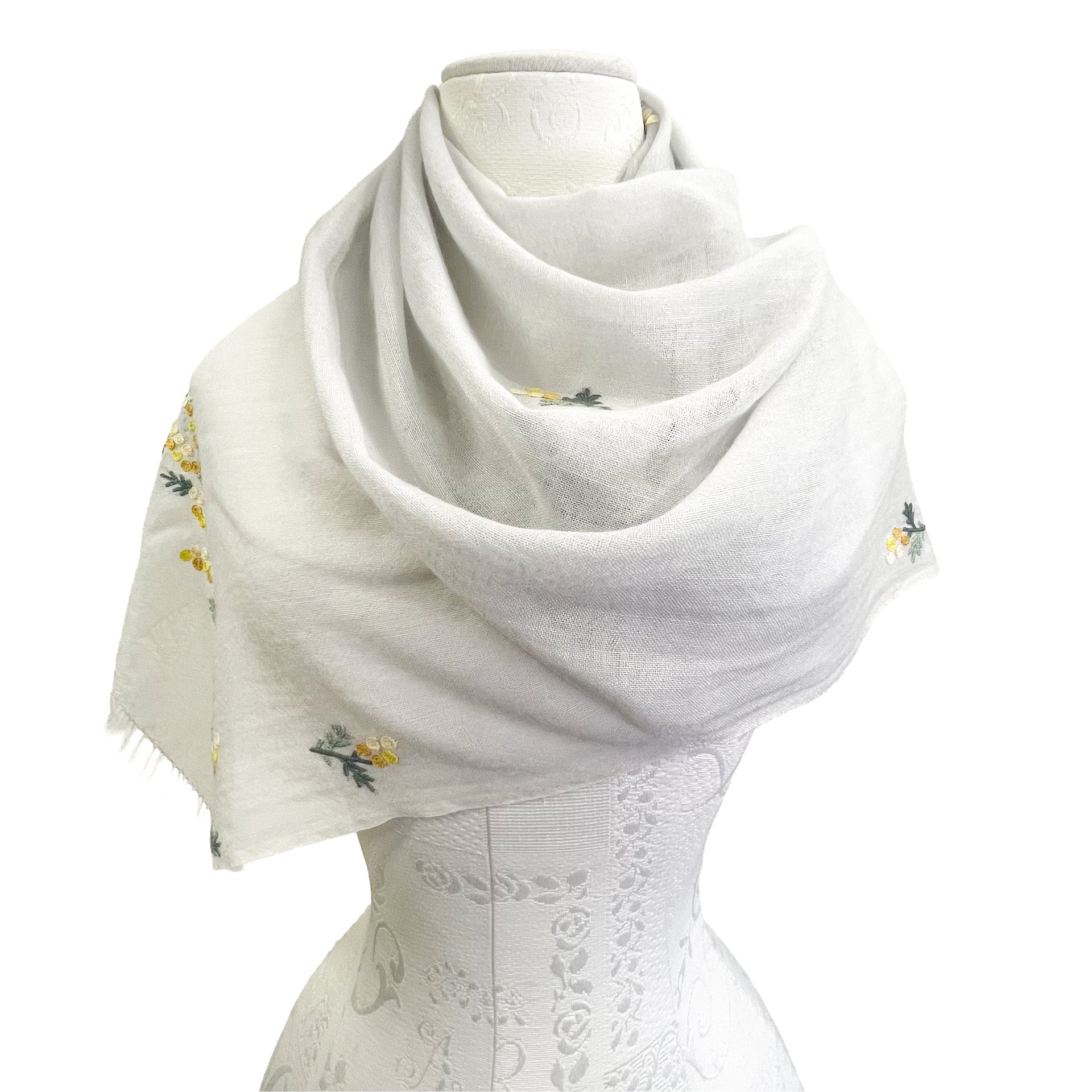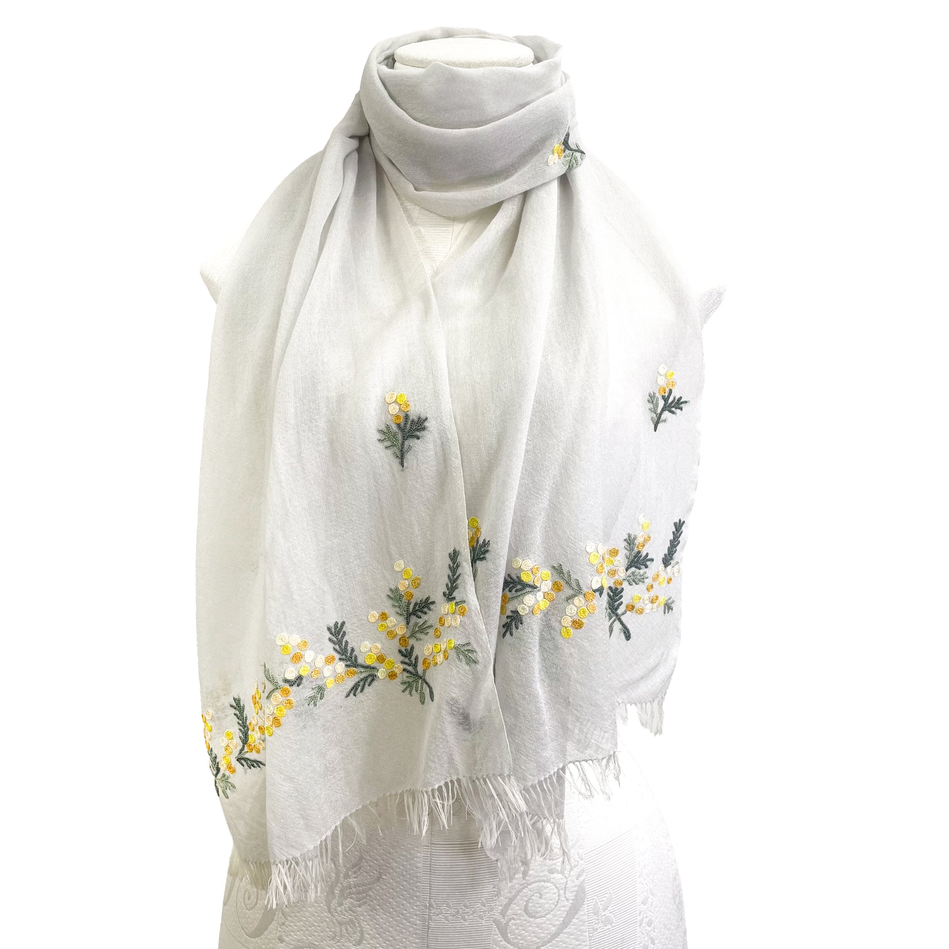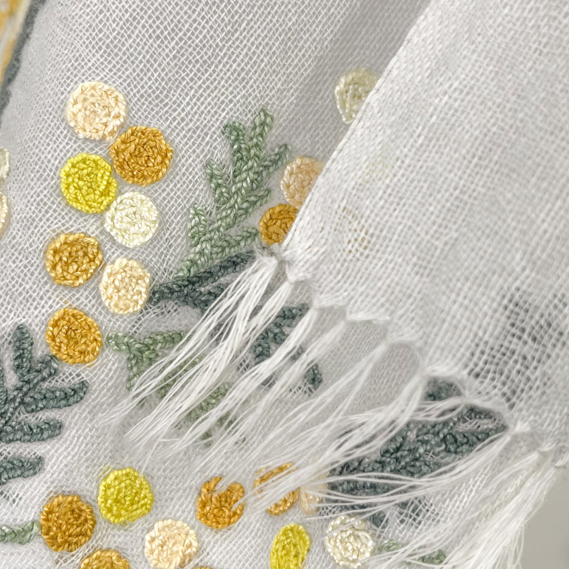 ミモザ 薄手ウール&シルク アリー手刺繍細幅ストール (ホワイト)