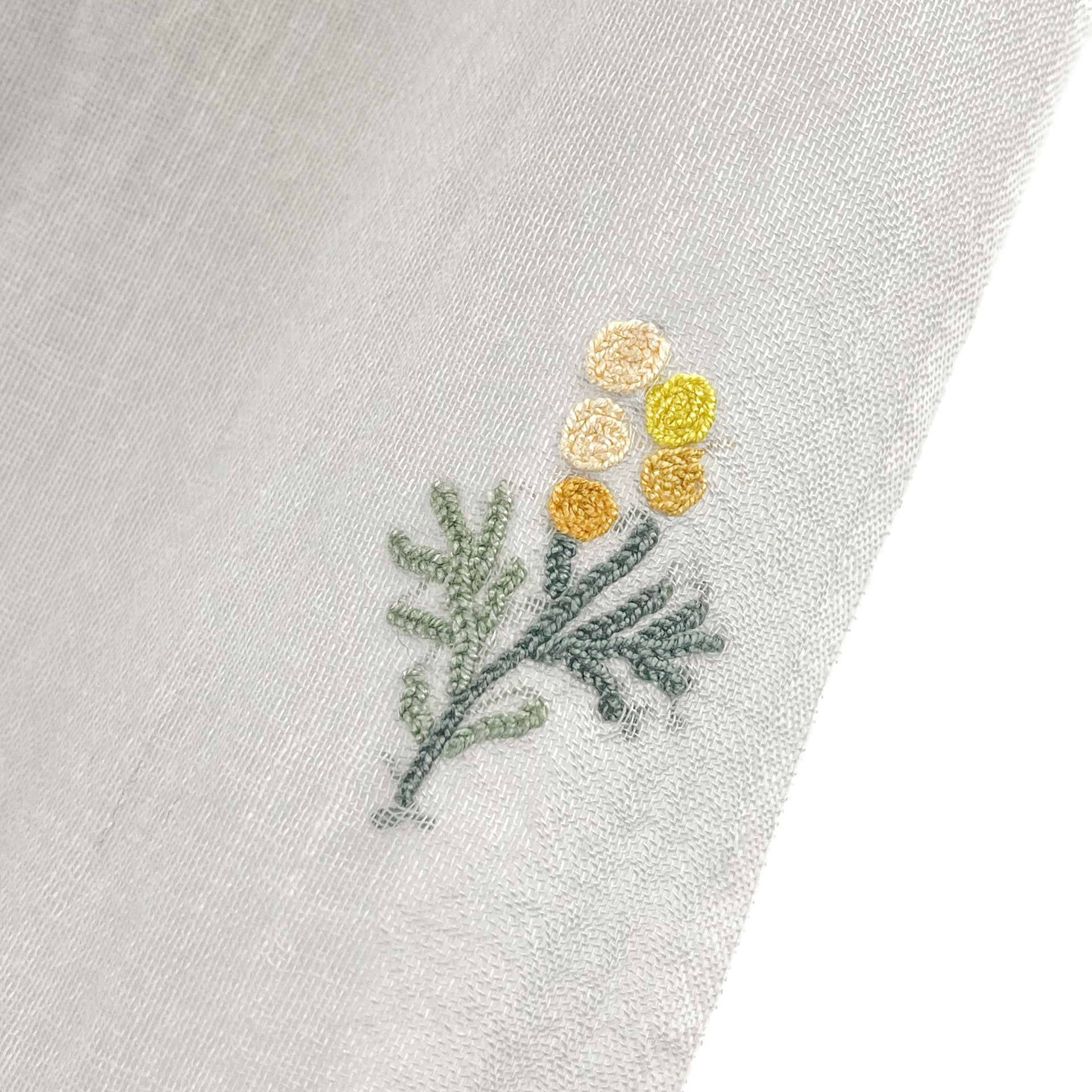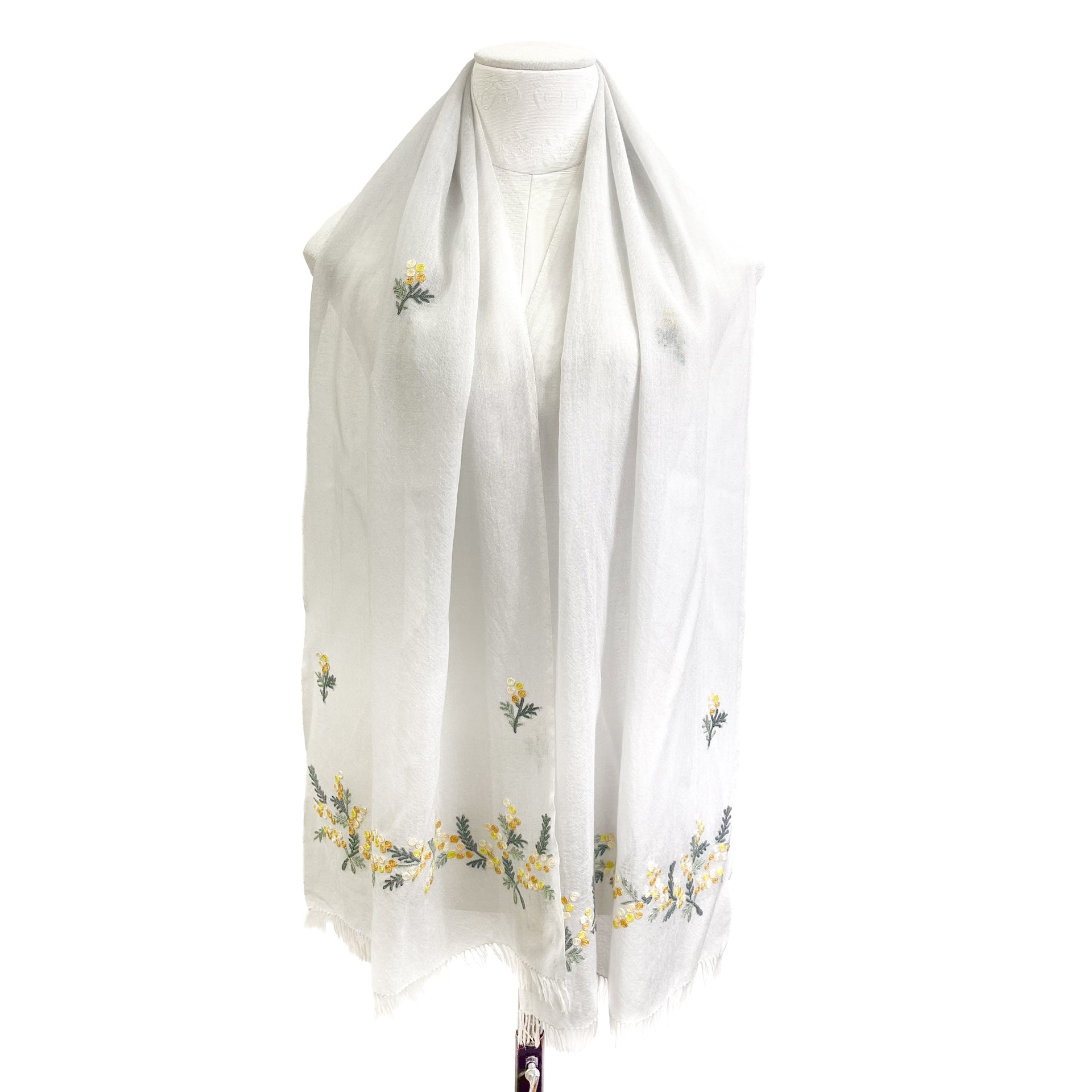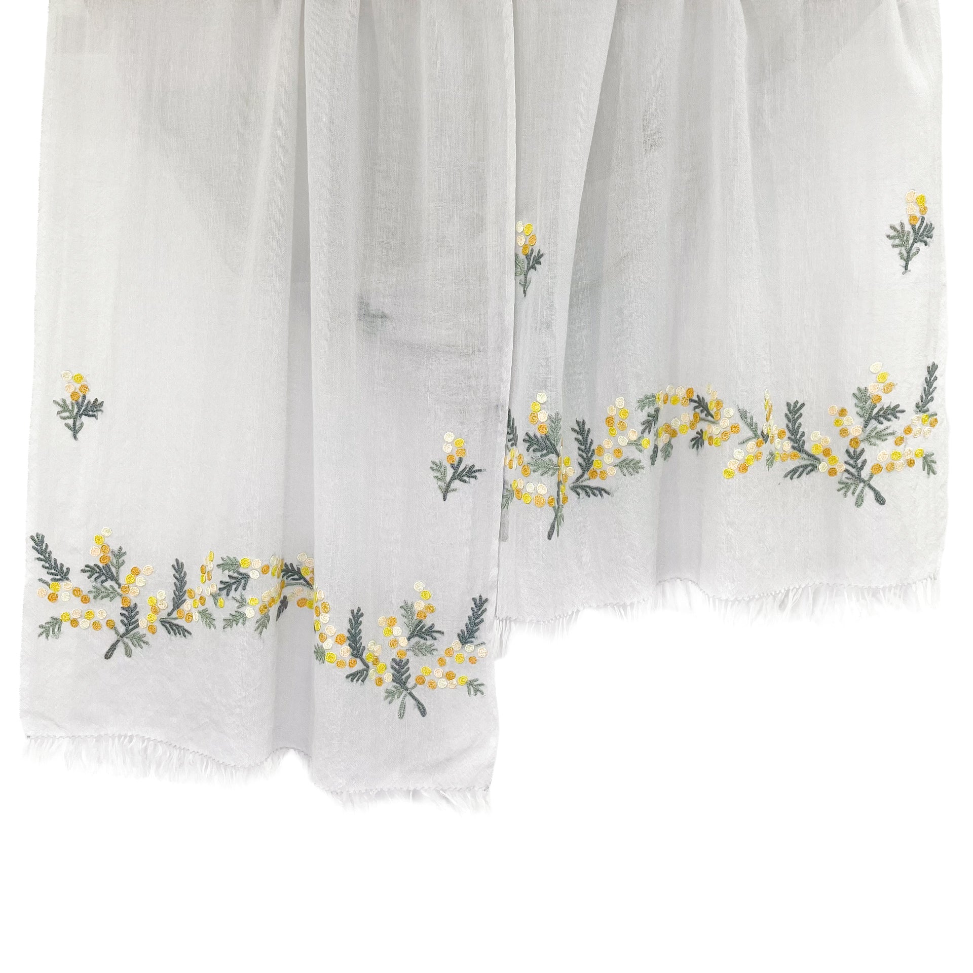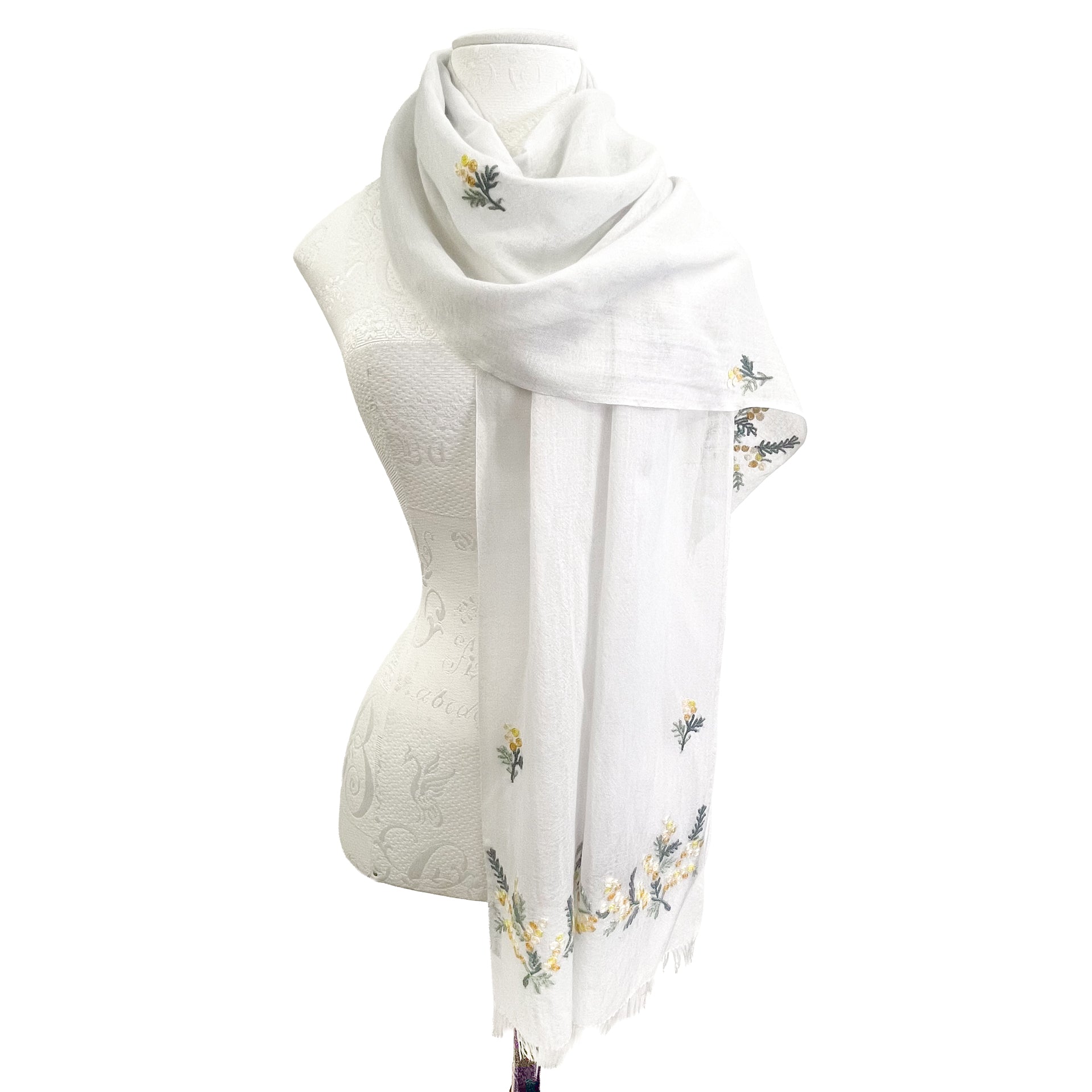 ミモザ 薄手ウール&シルク アリー手刺繍細幅ストール (ホワイト)
