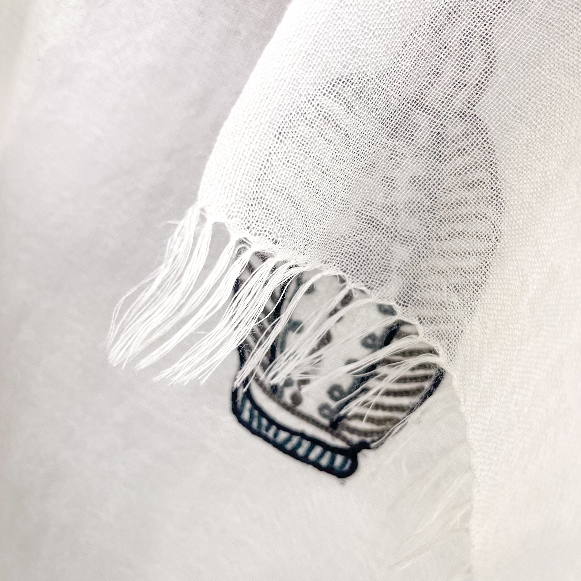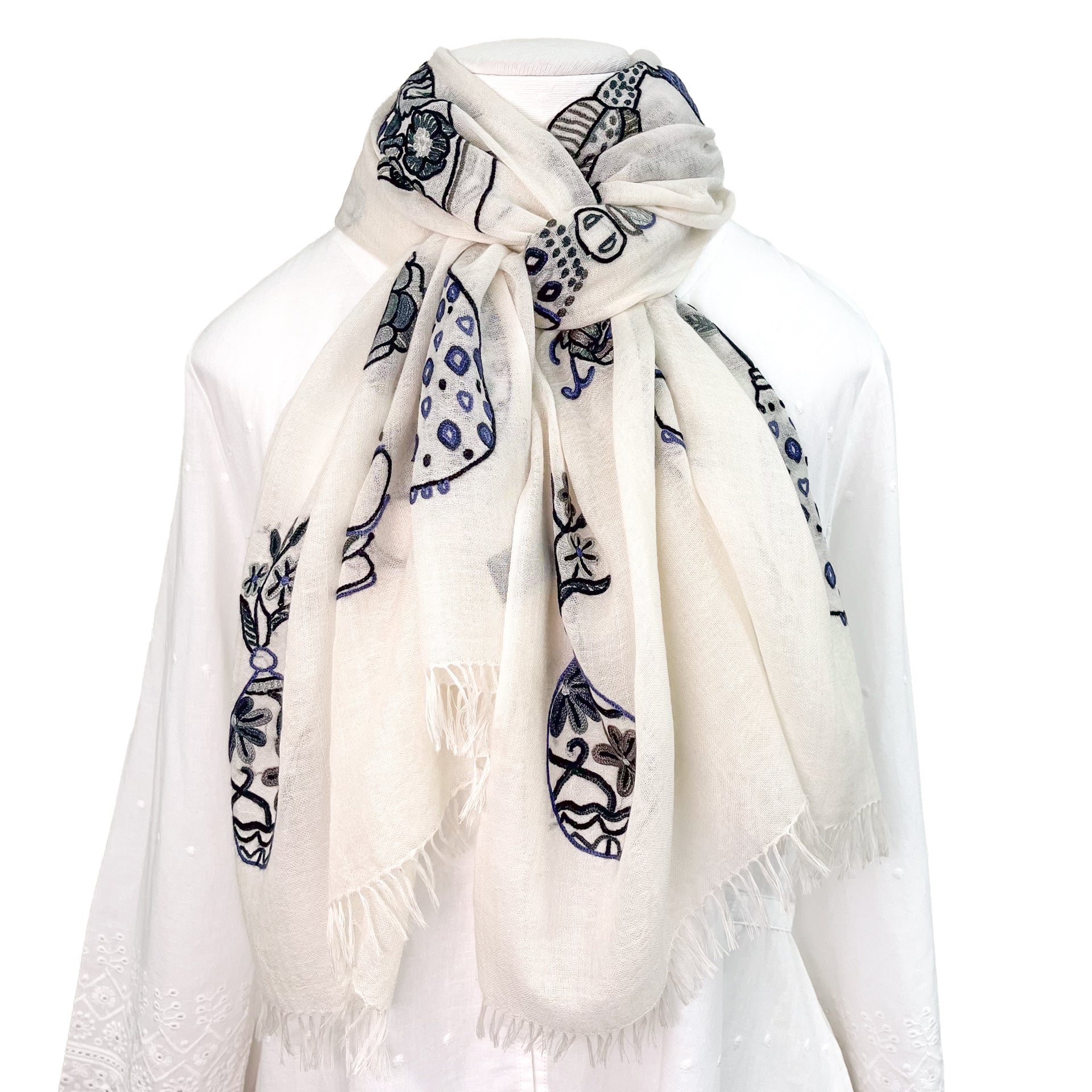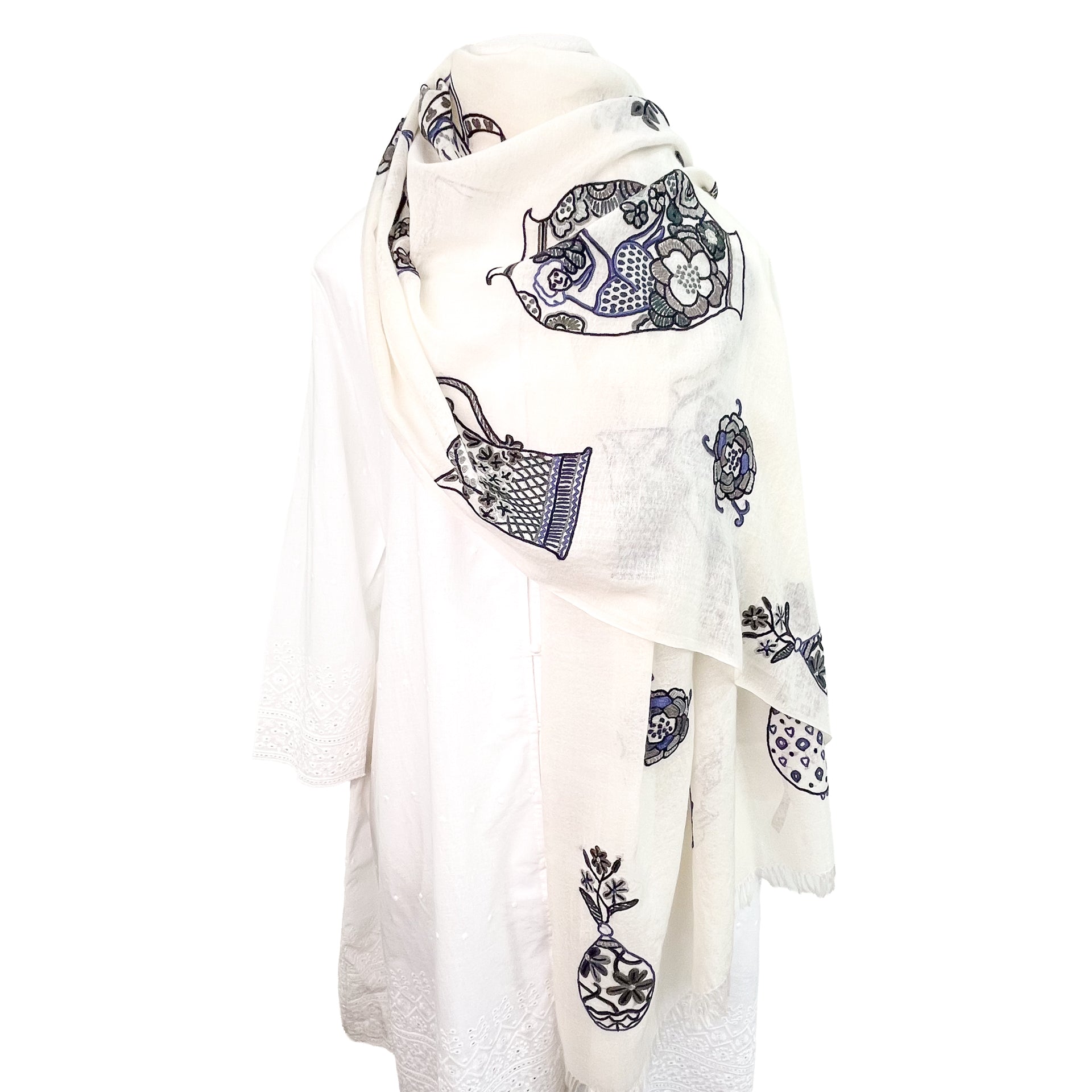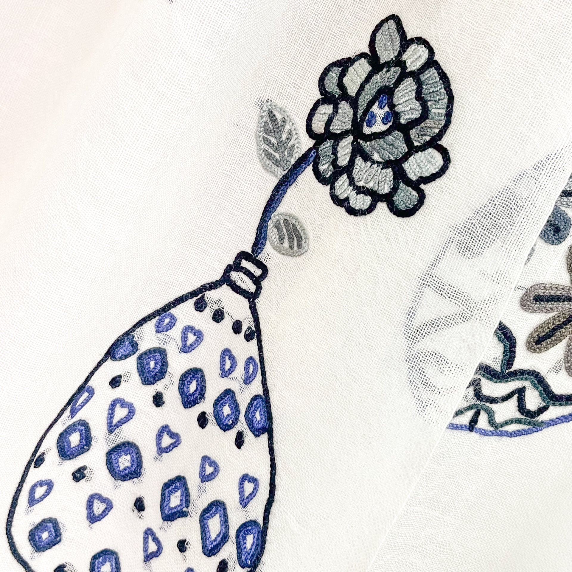 薄手ウールシルク アリー手刺繍ストール (ホワイト/ブラック)