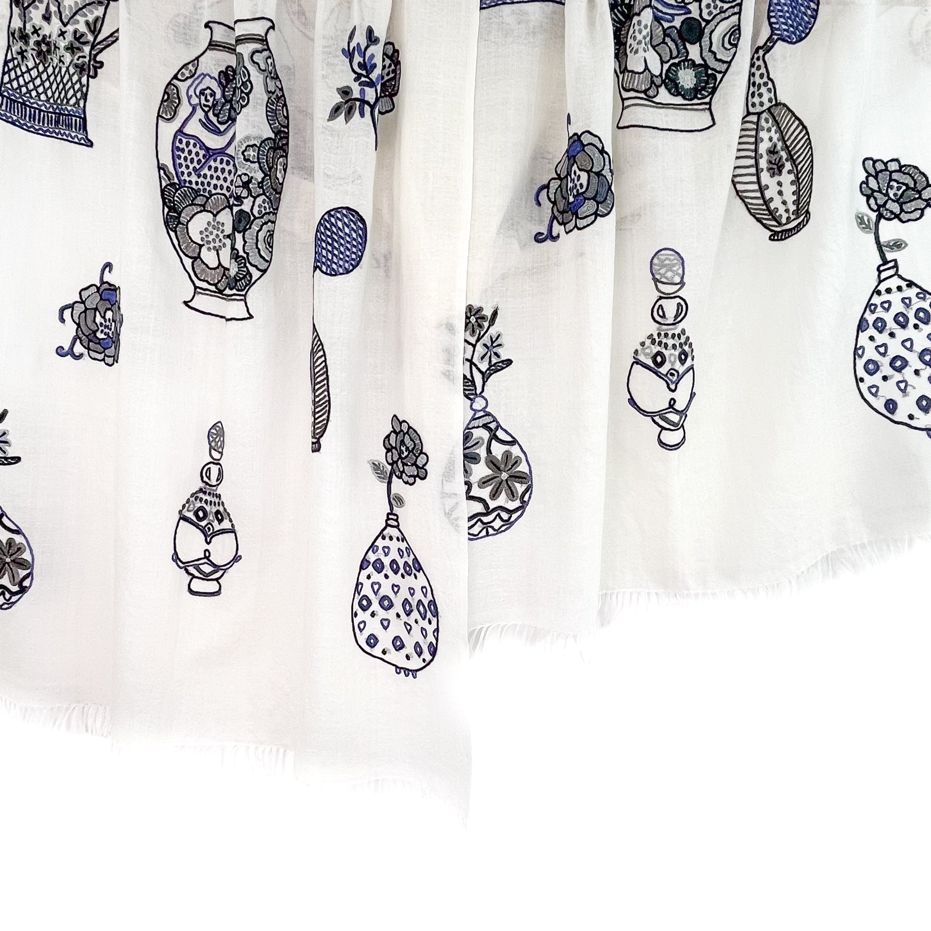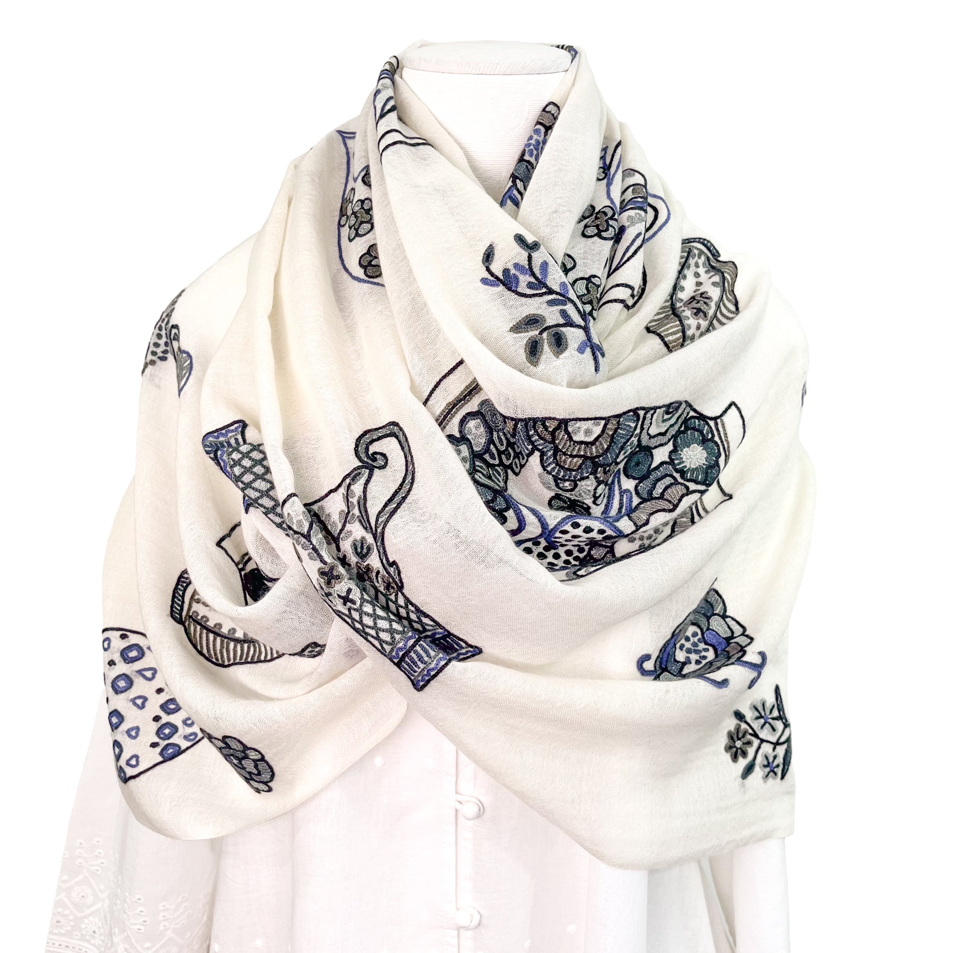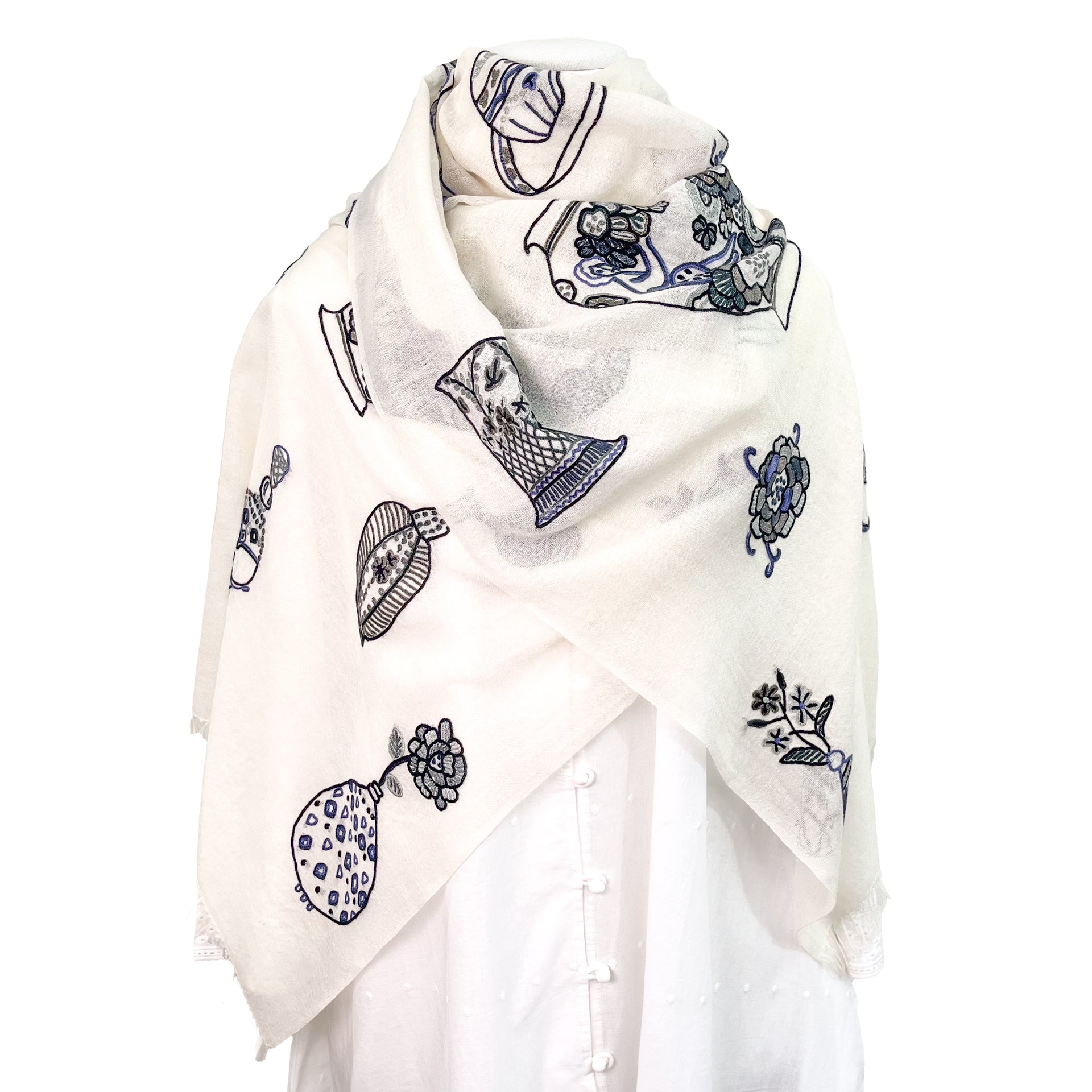 フランス人デザイナーによるPerfumeボトルやカップ、壺などをアリー手刺繍で描いたストール。装飾の美しいアンティークのボトルなどをキュートなモチーフにしました。手刺繍で描いた細かい柄が大人の遊び心をくすぐります。