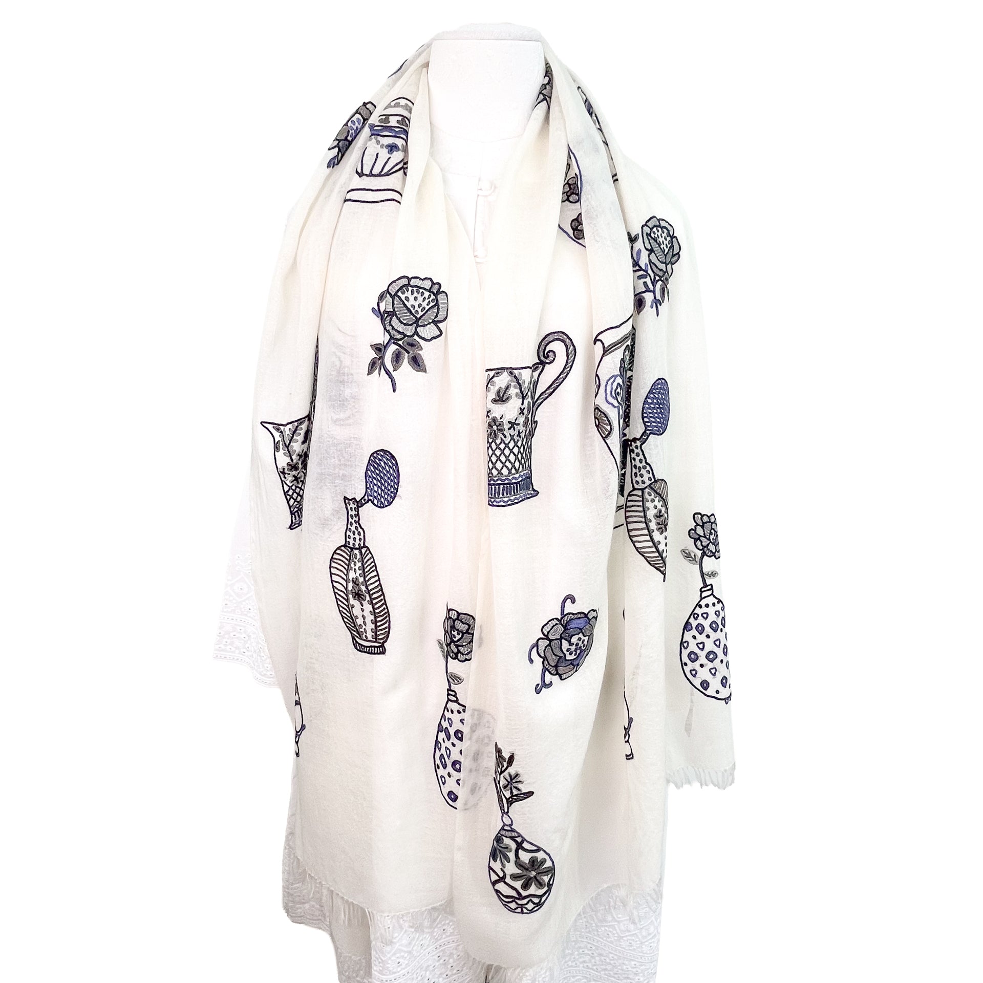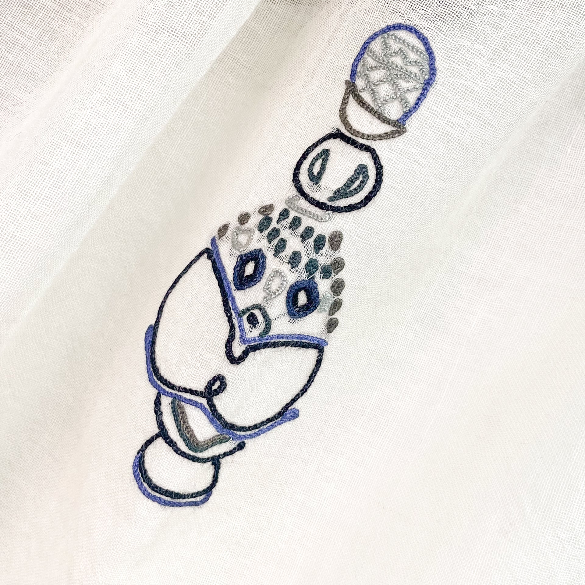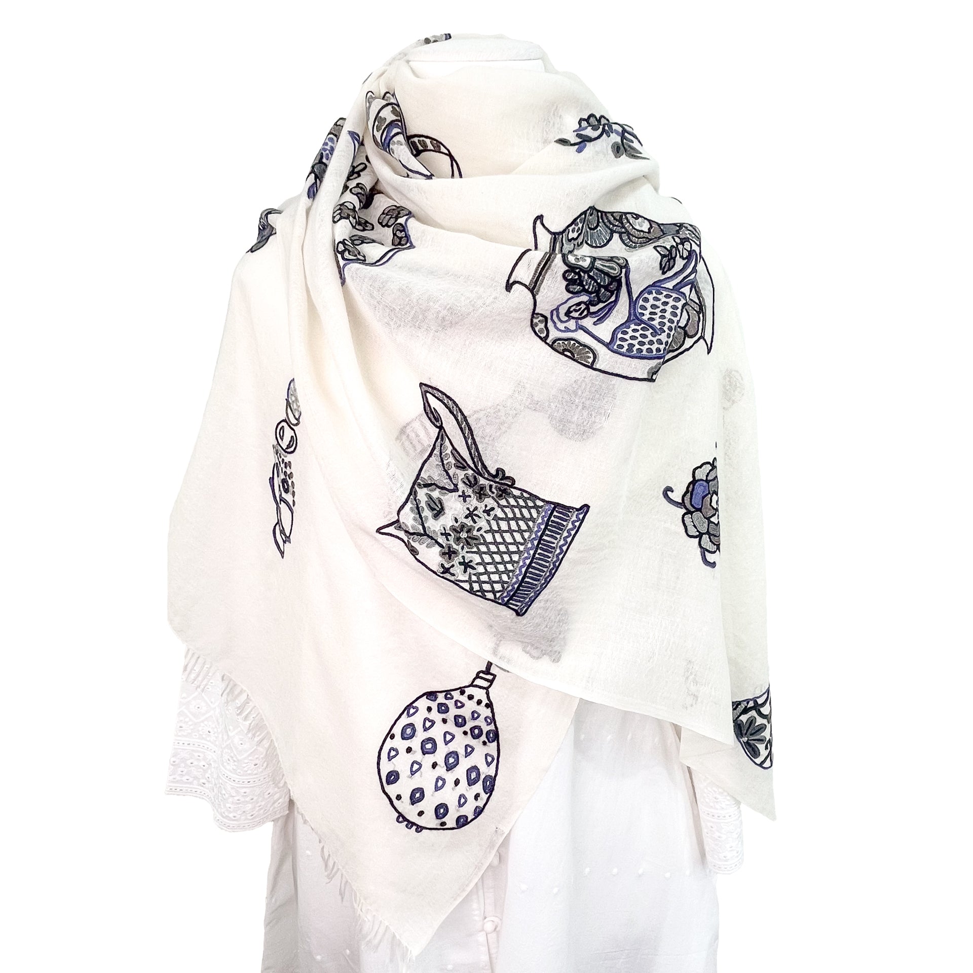 フランス人デザイナーによるPerfumeボトルやカップ、壺などをアリー手刺繍で描いたストール。装飾の美しいアンティークのボトルなどをキュートなモチーフにしました。手刺繍で描いた細かい柄が大人の遊び心をくすぐります。