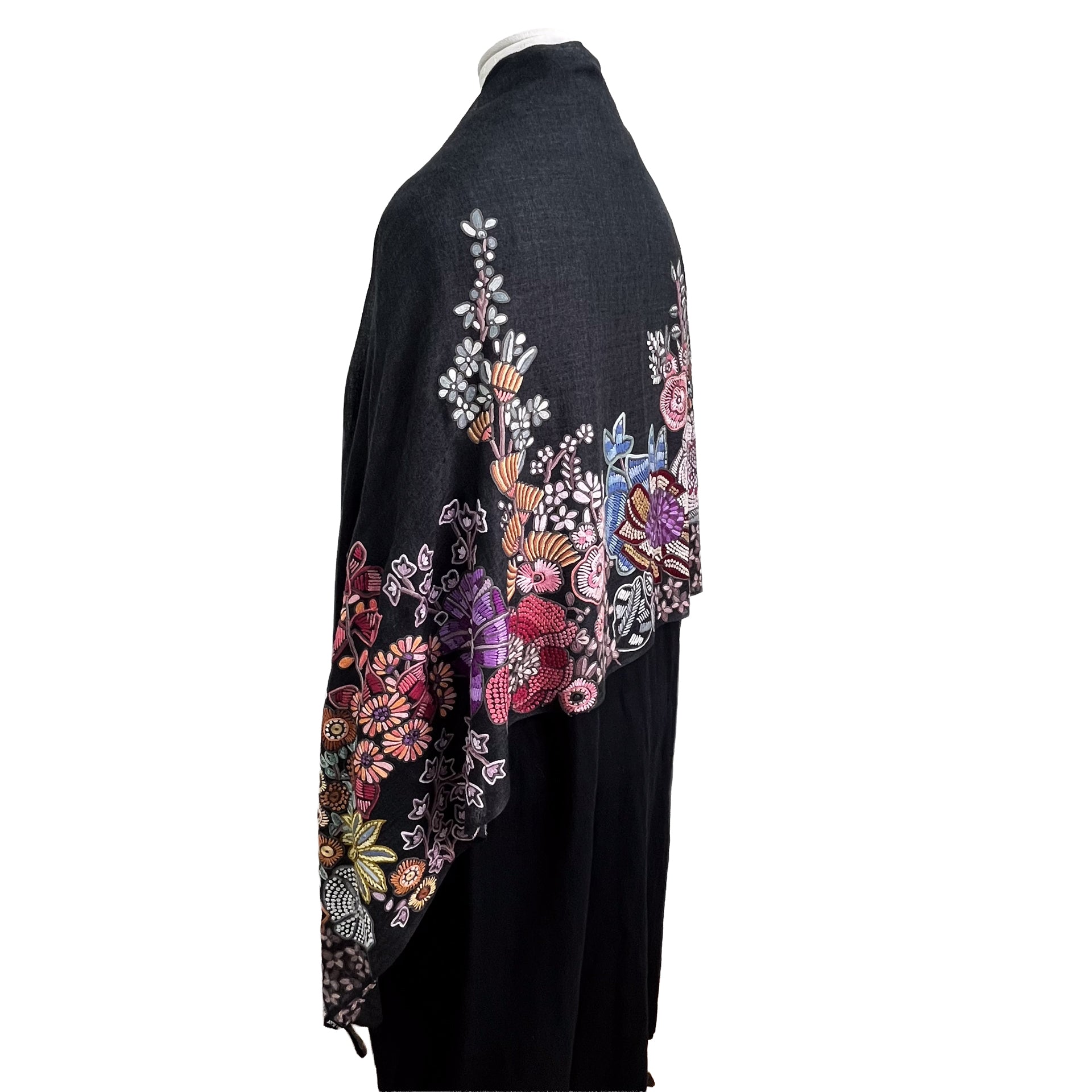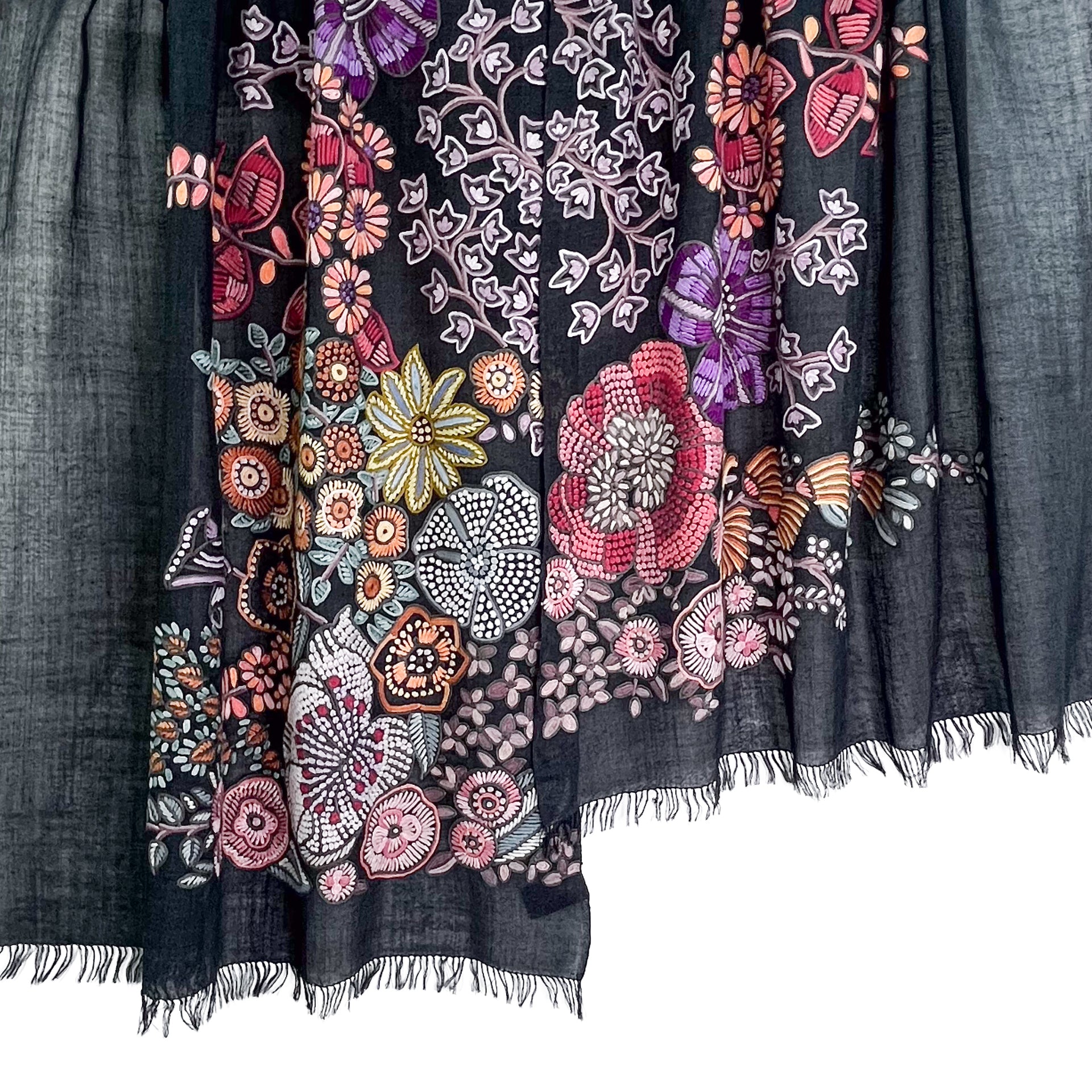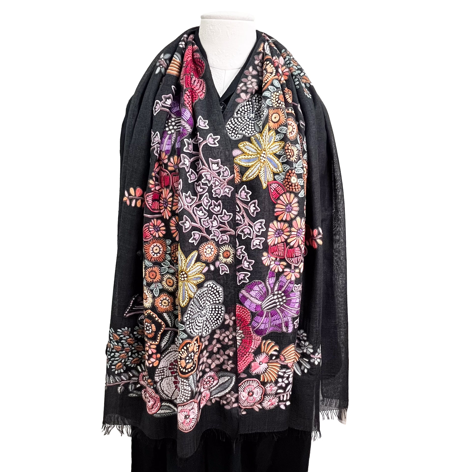 FLOWER TRAIN 薄手ウール&シルク アリー手刺繍ストール(オフブラック)