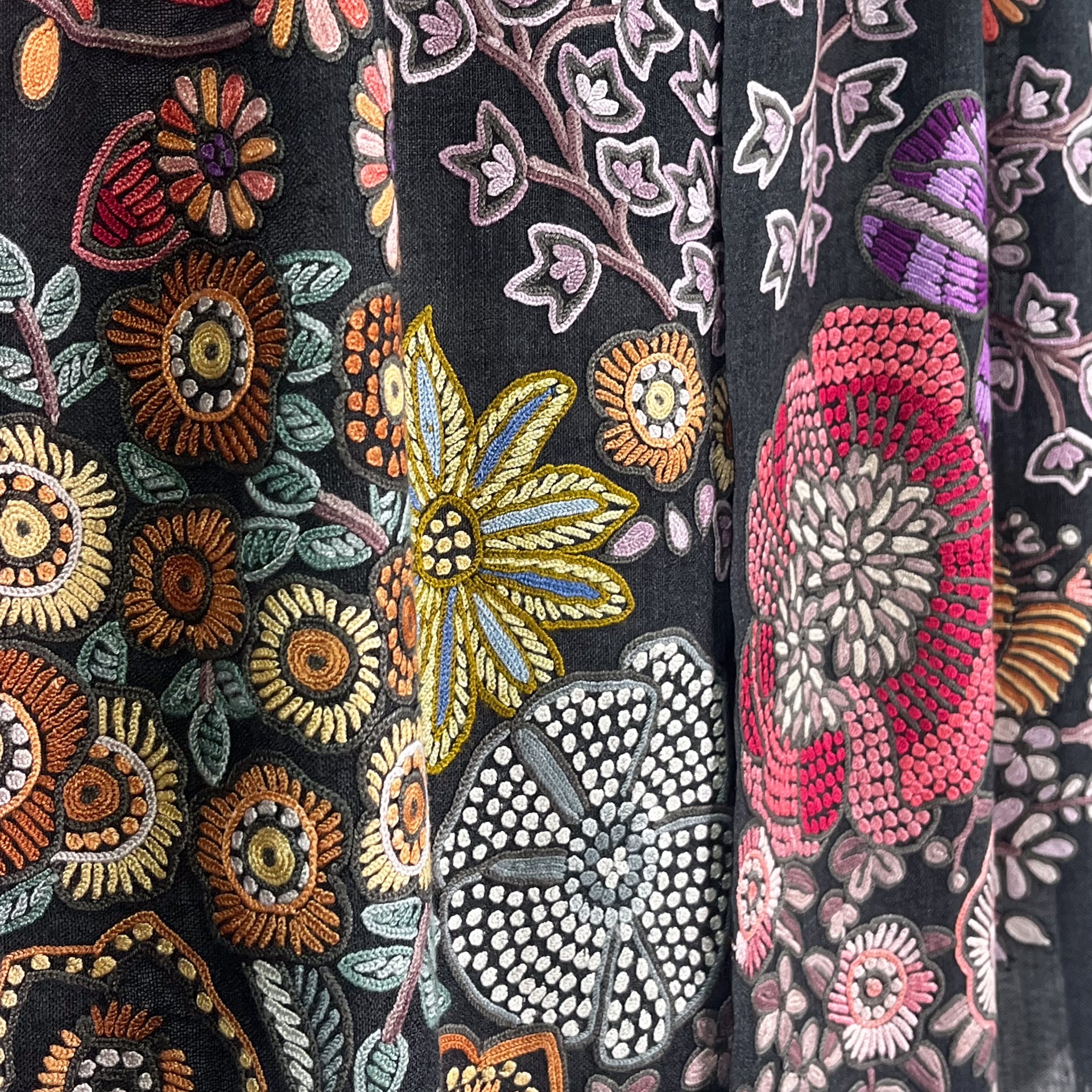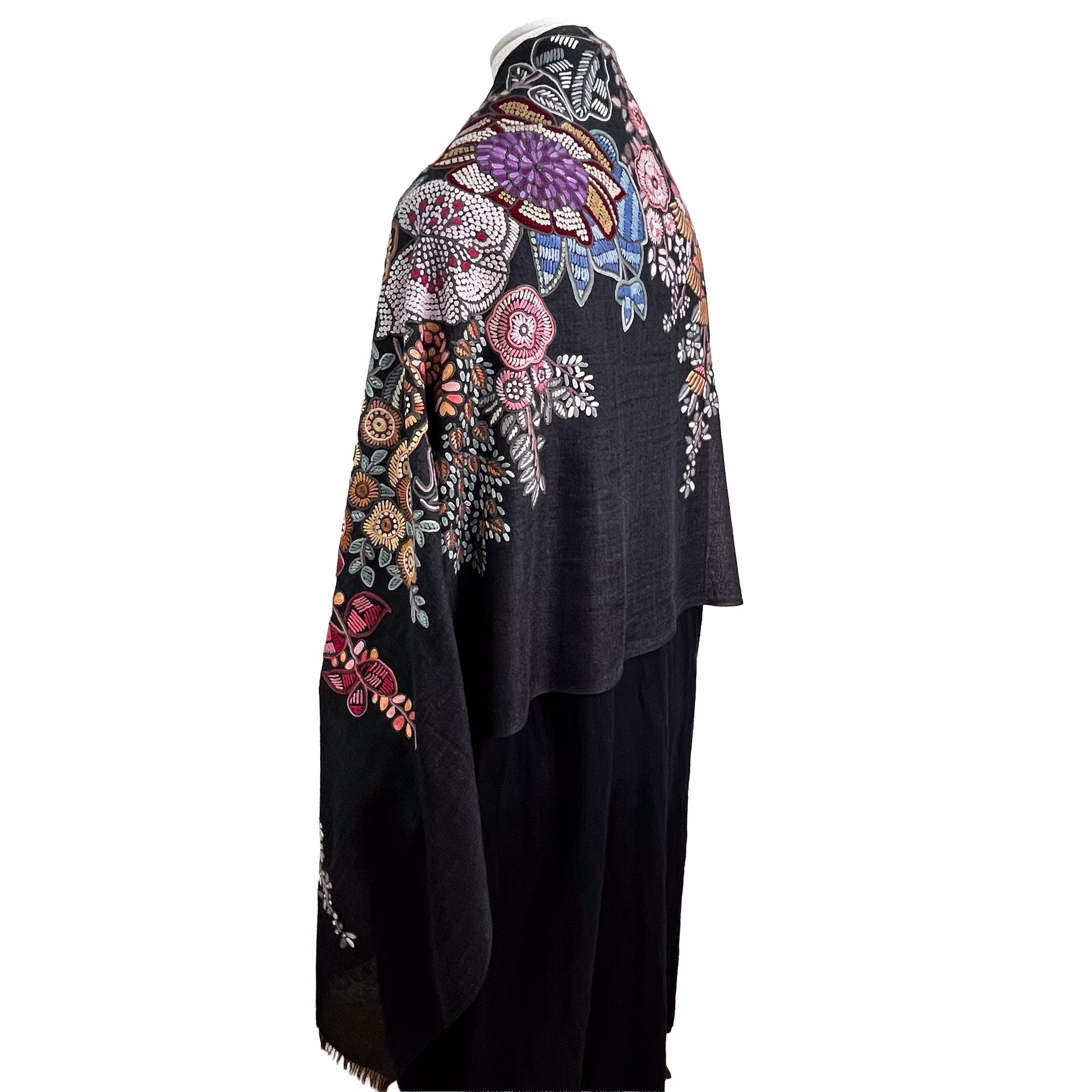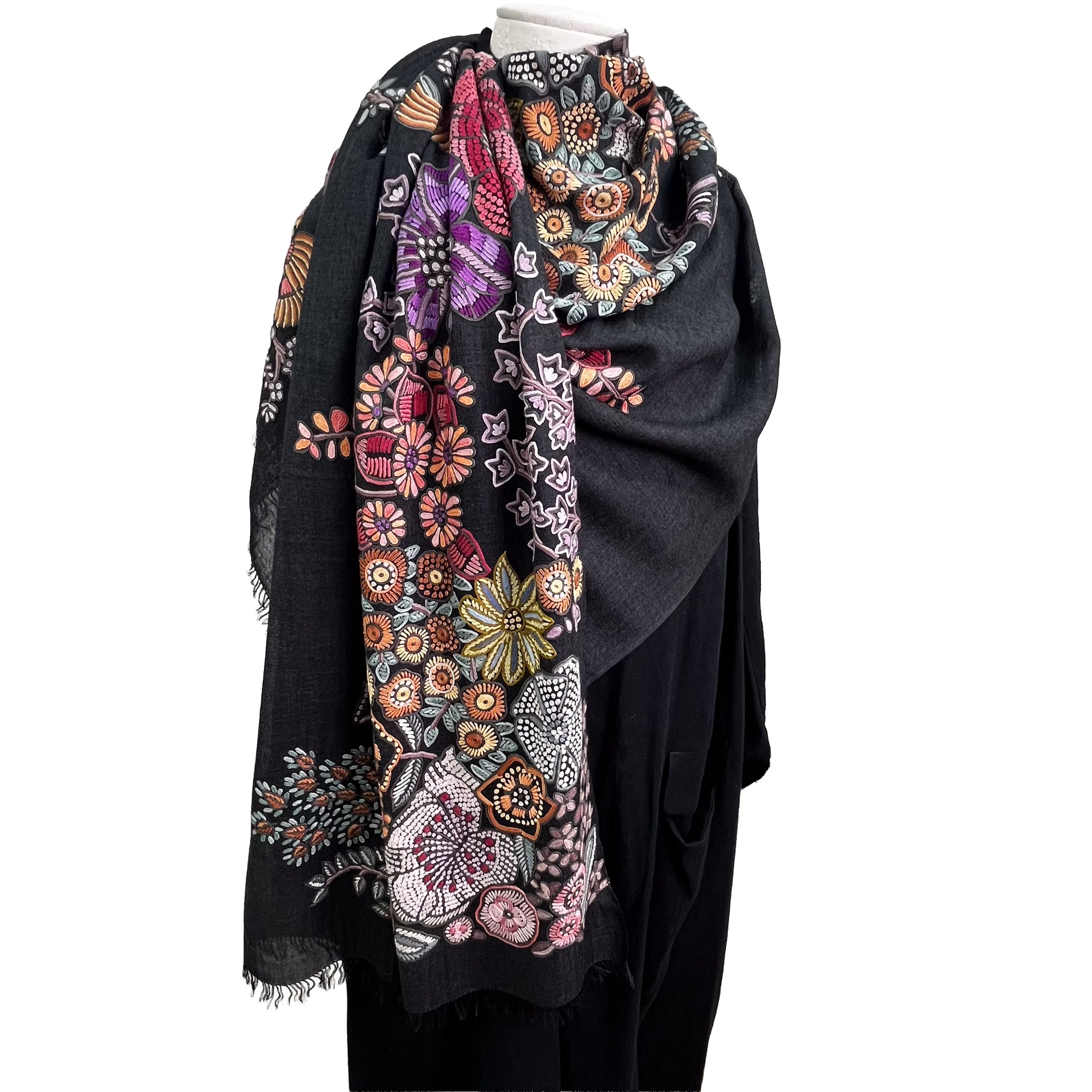 FLOWER TRAIN 薄手ウール&シルク アリー手刺繍ストール(オフブラック)