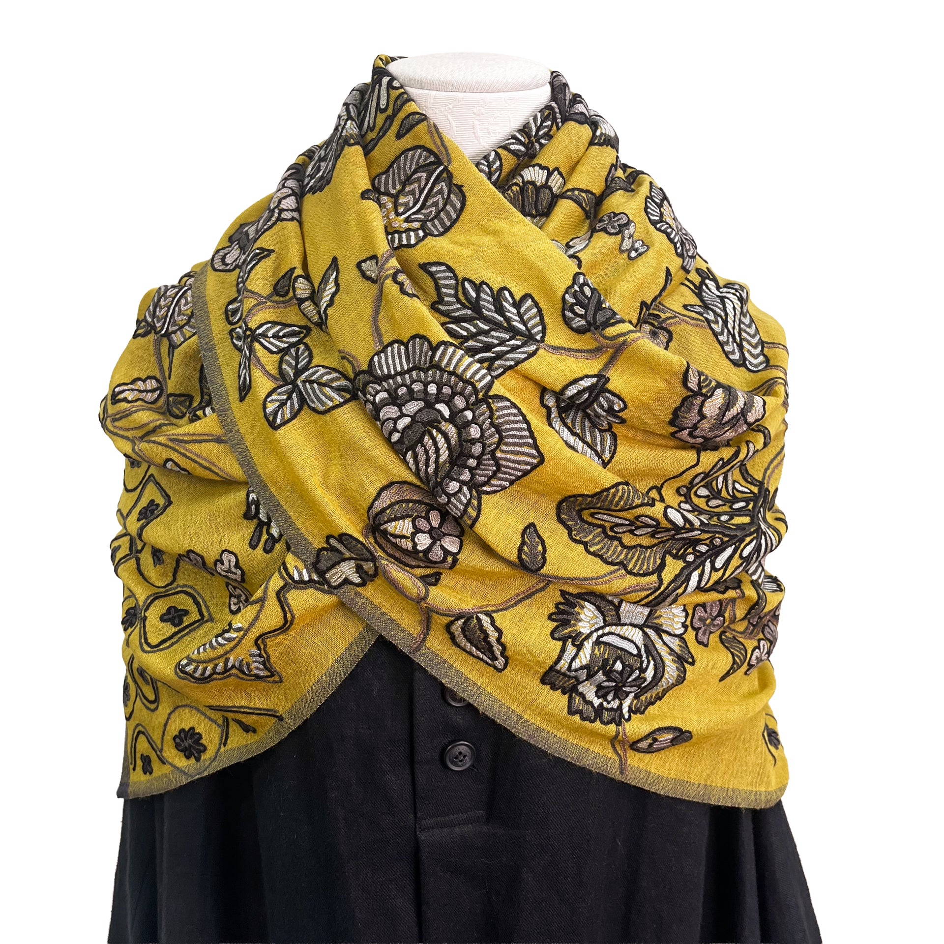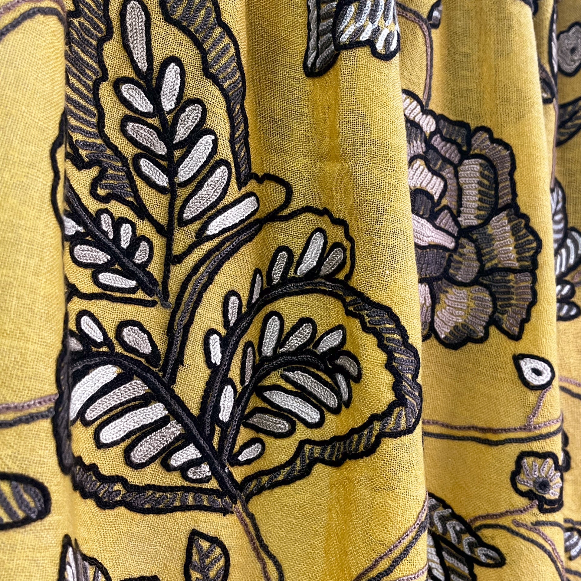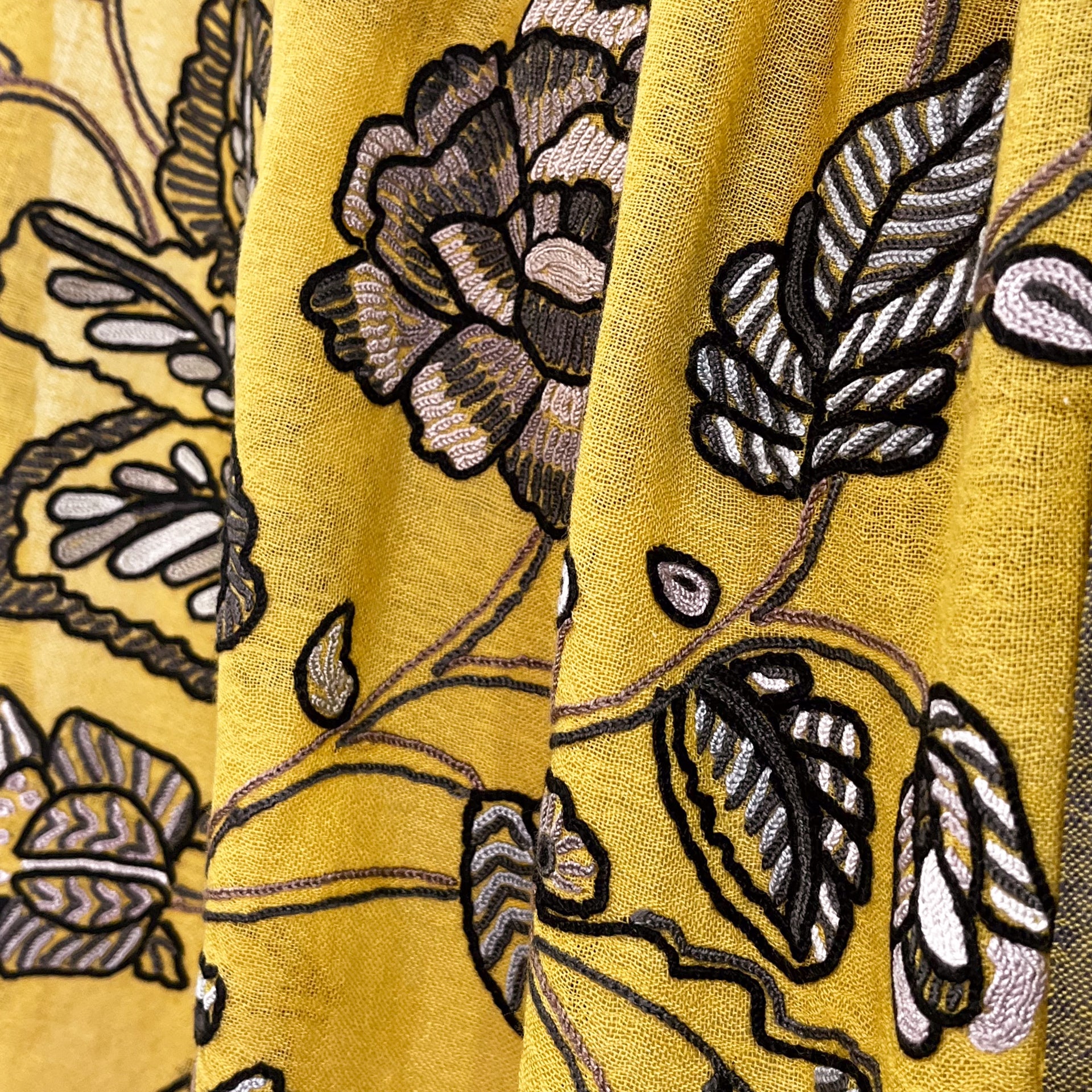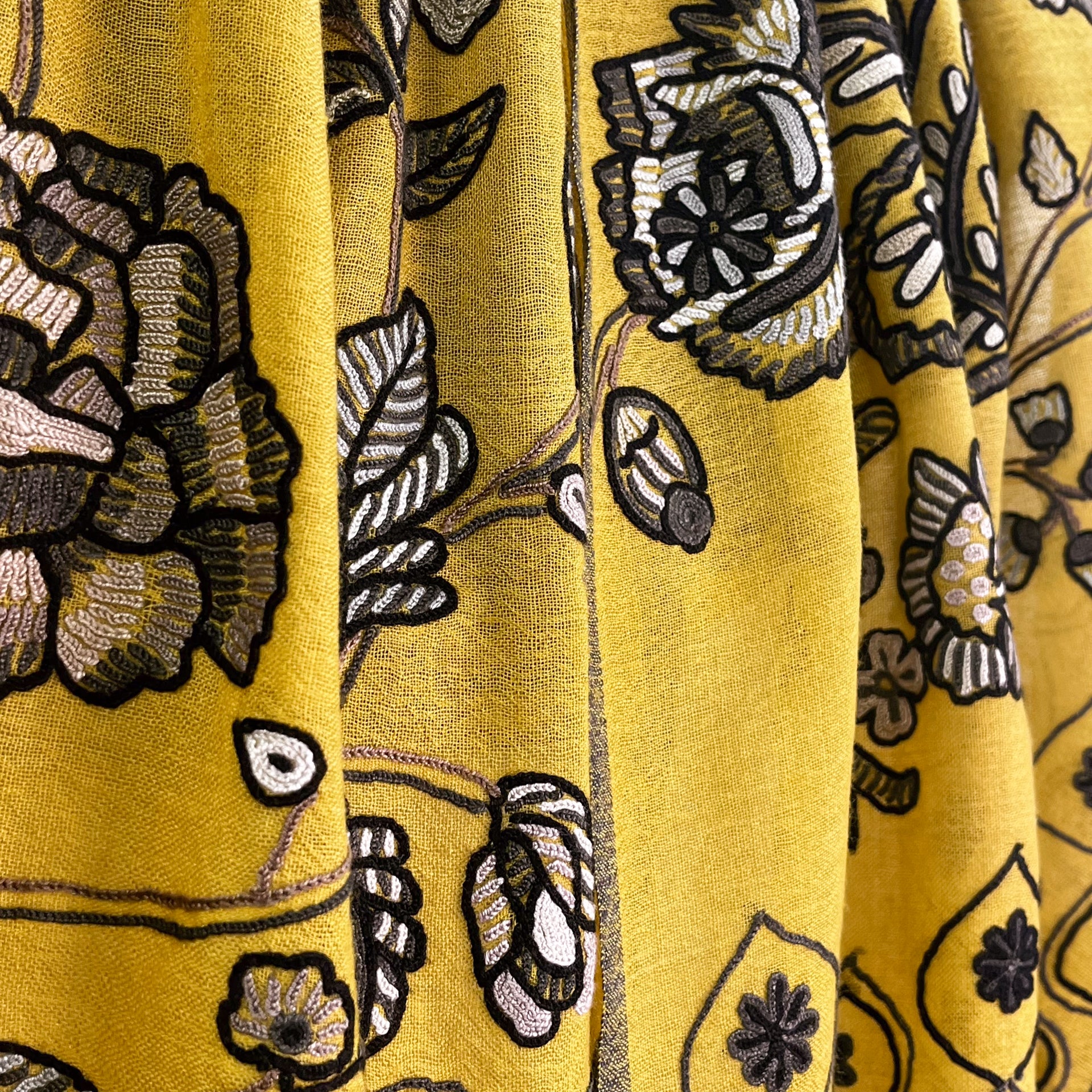 薄手ウール&シルク アリー手刺繍ストール(マスタード)