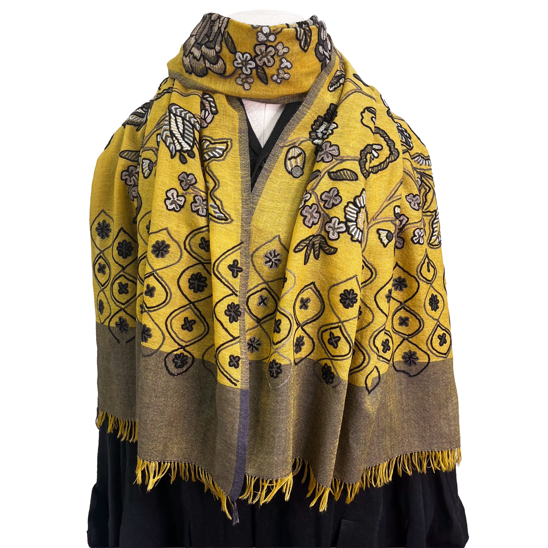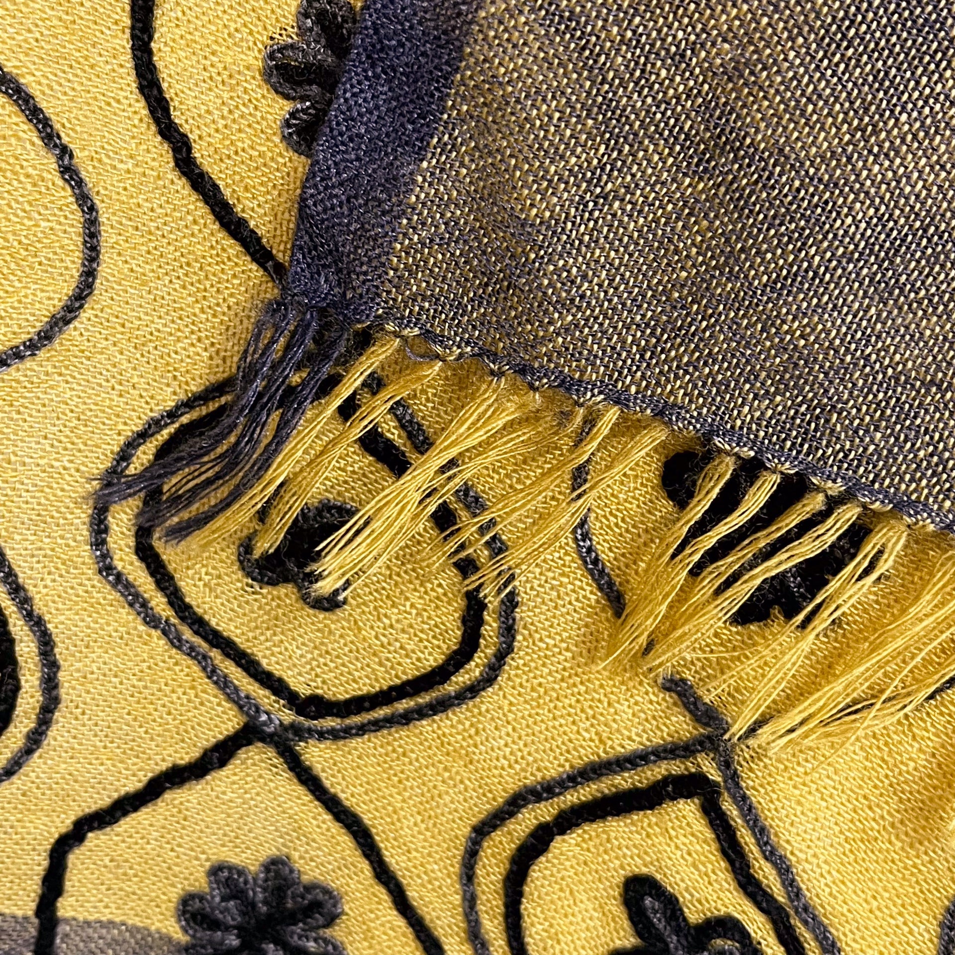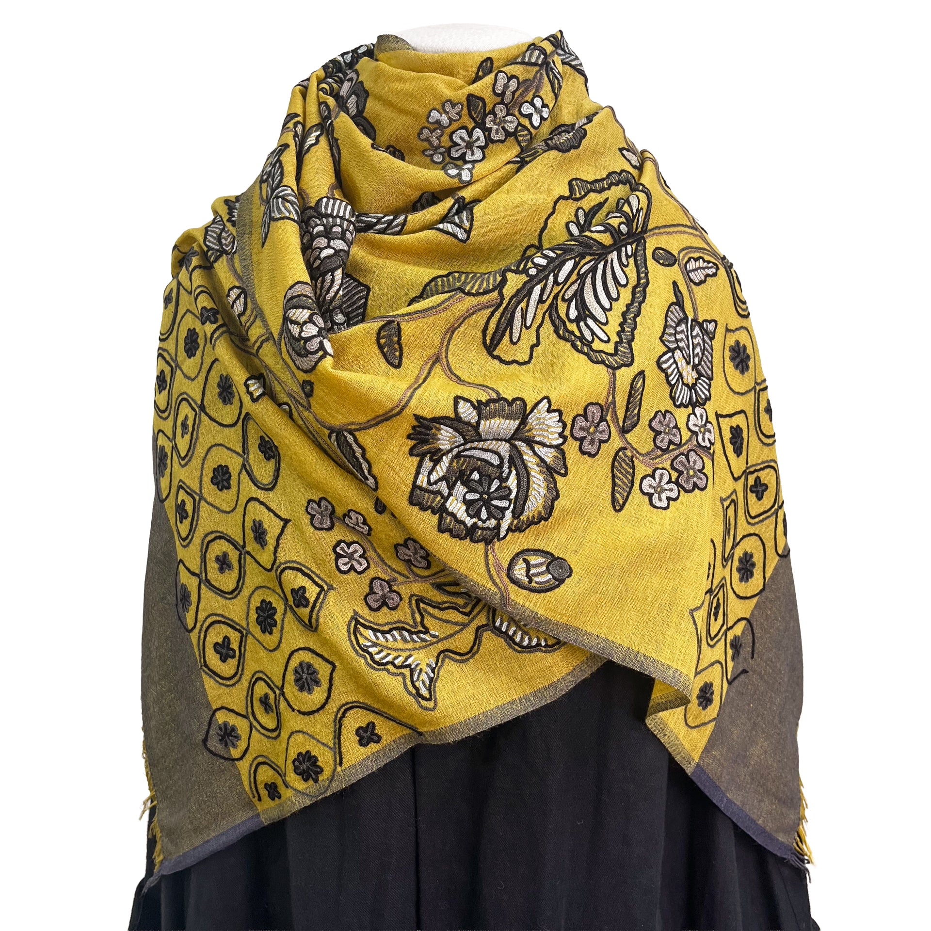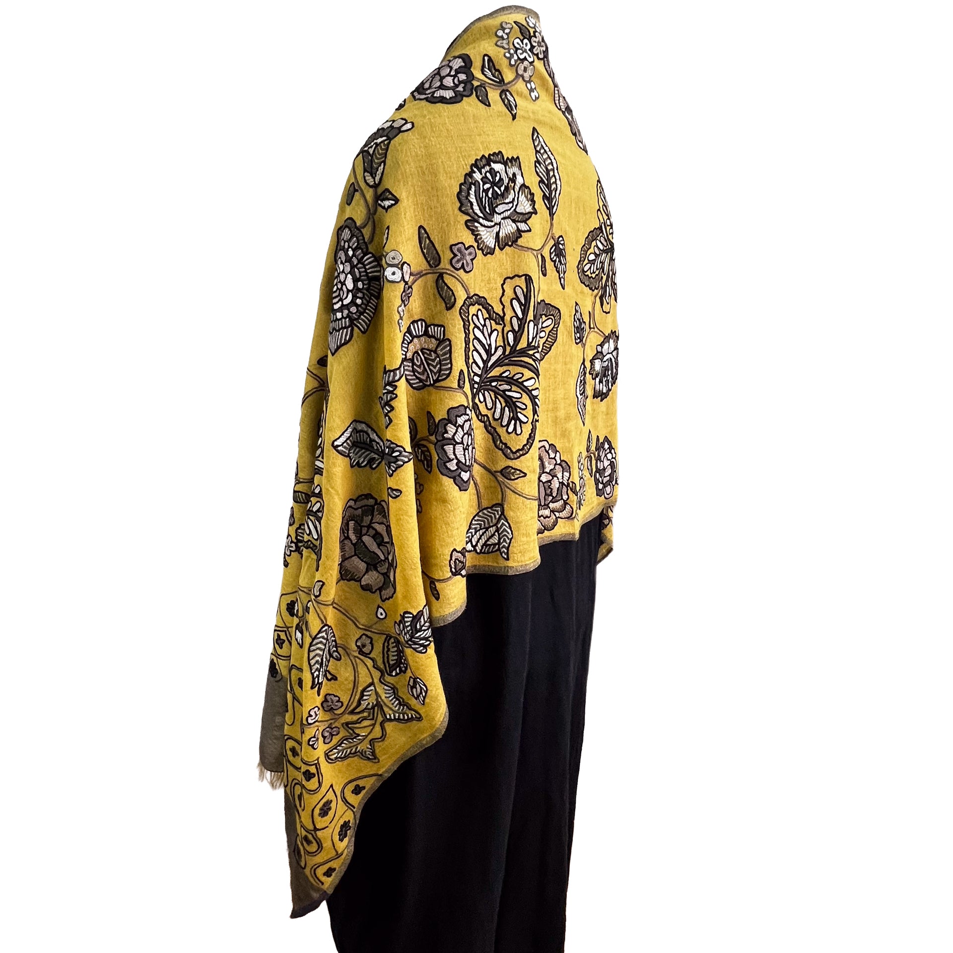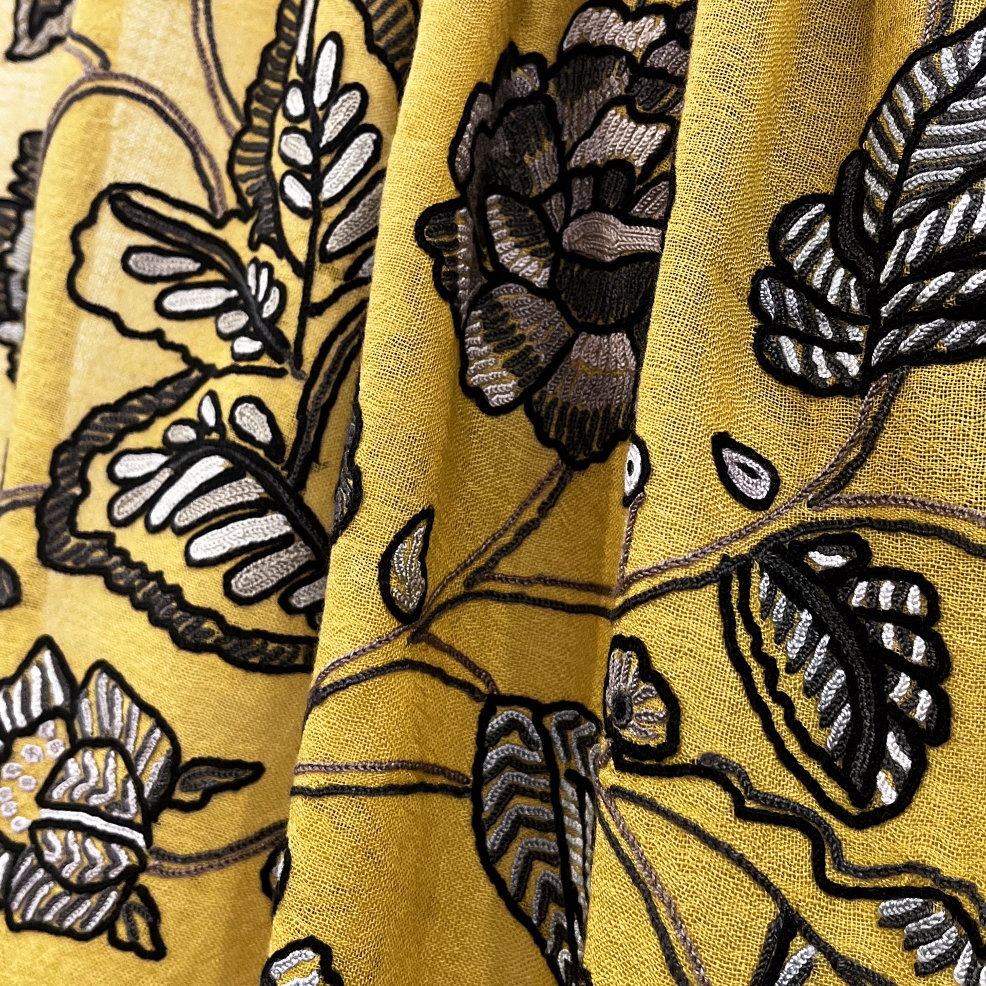 薄手ウール&シルク アリー手刺繍ストール(マスタード)