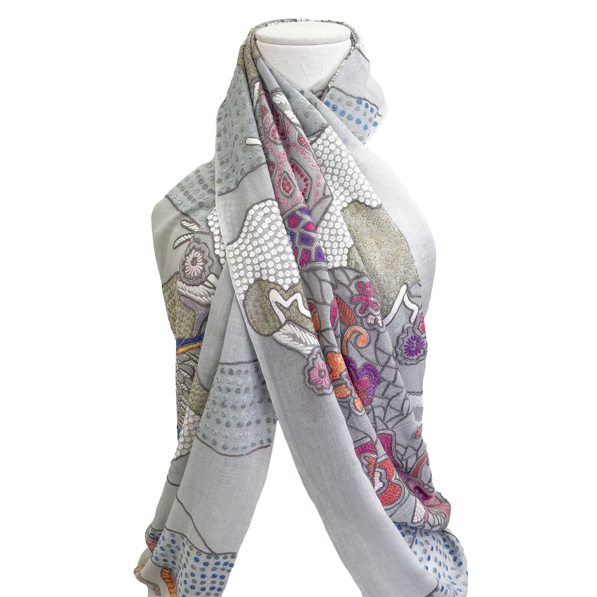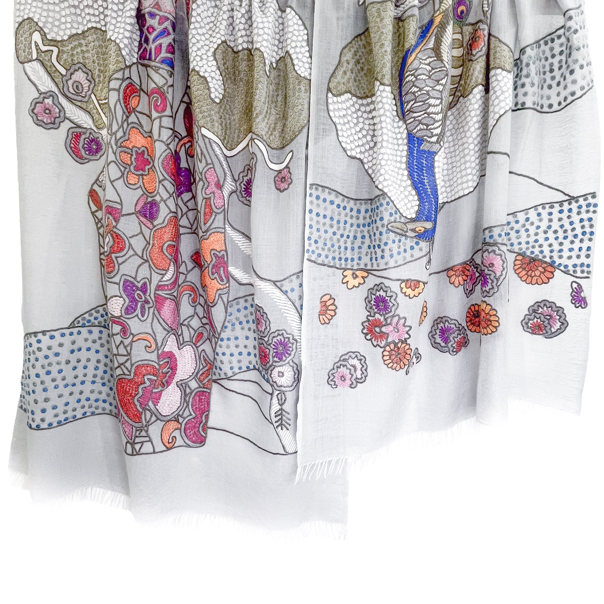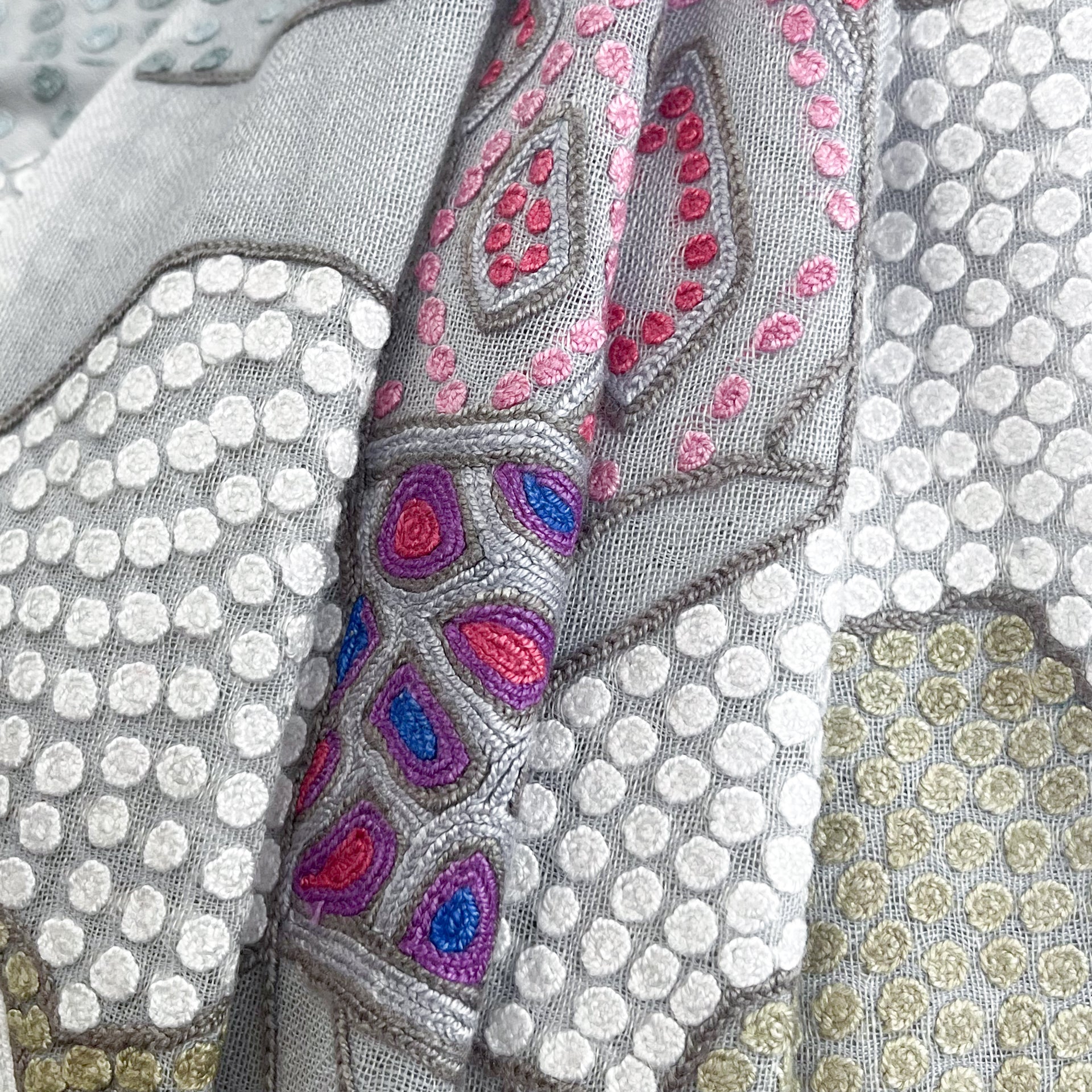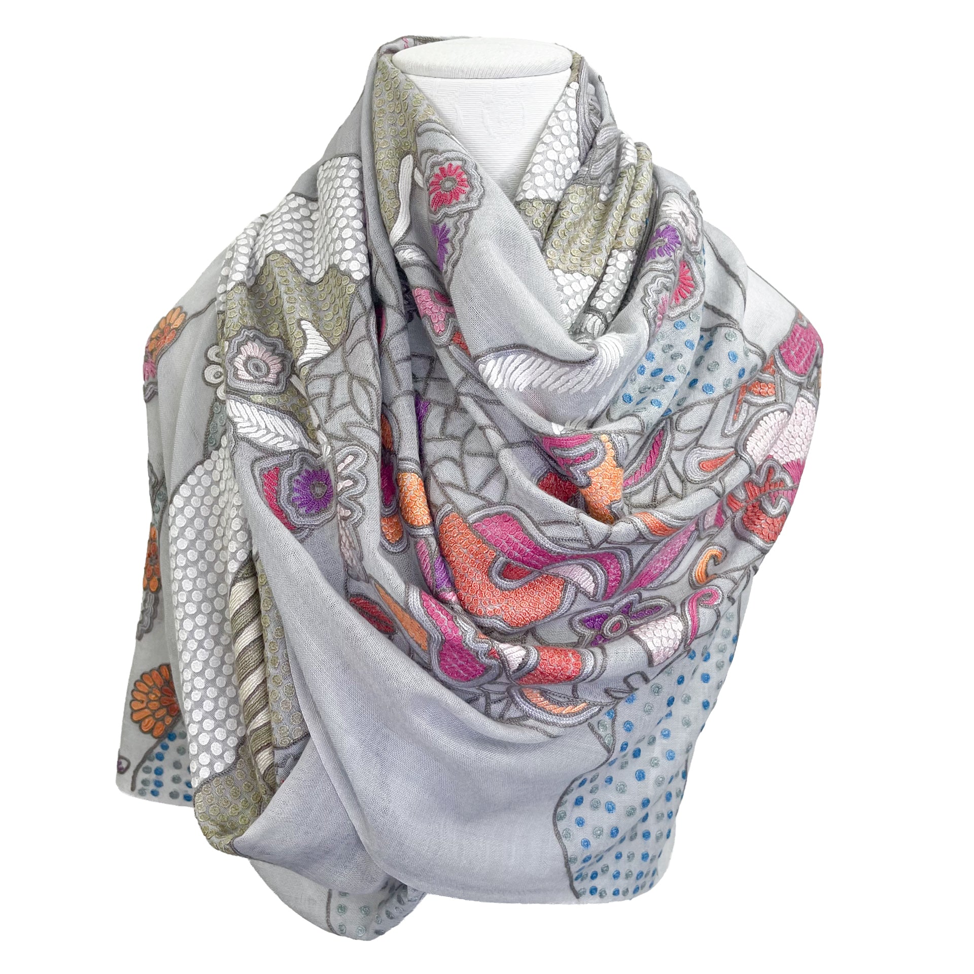 薄手ウール&シルク アリー手刺繍ストール (グレー)