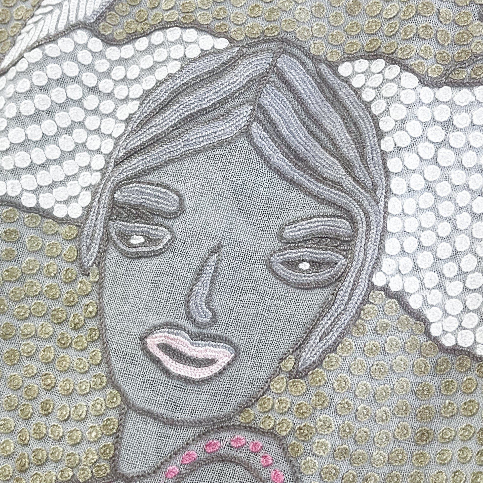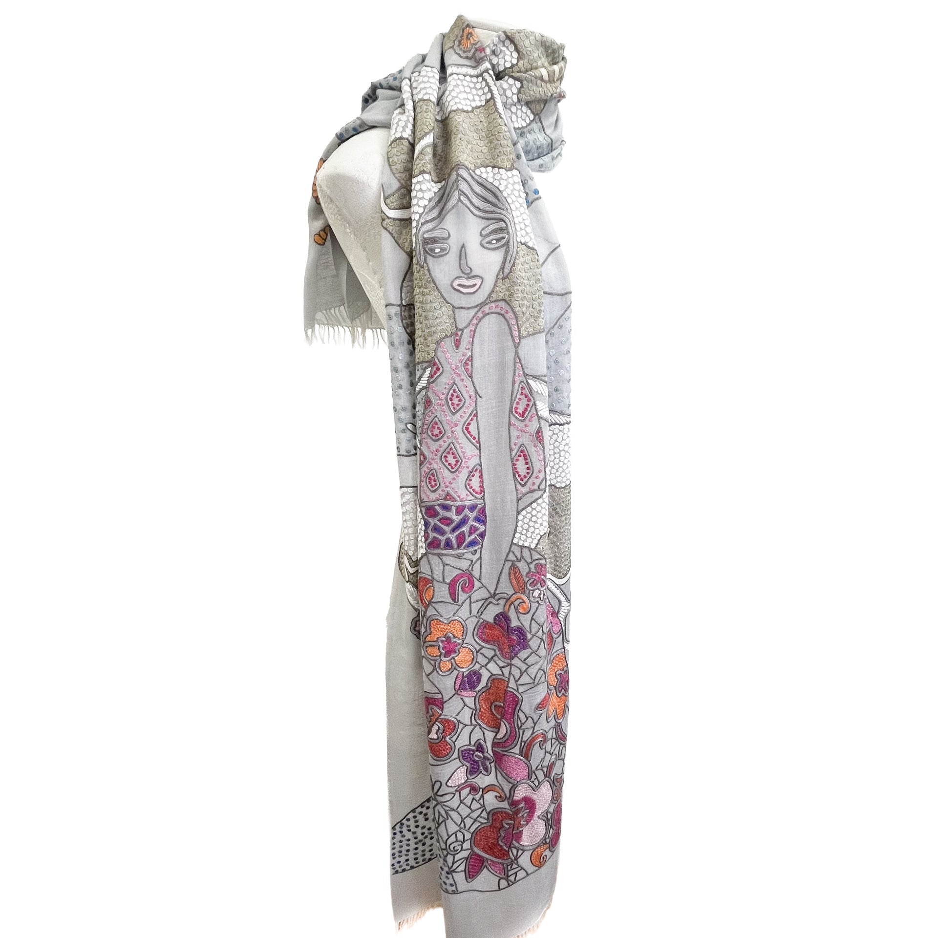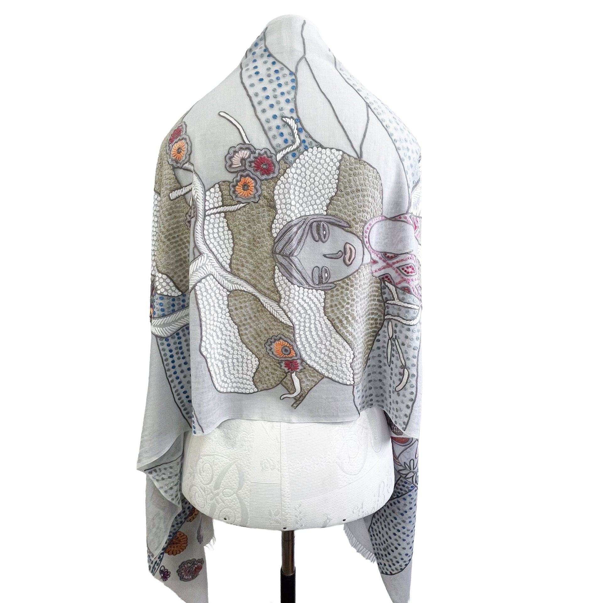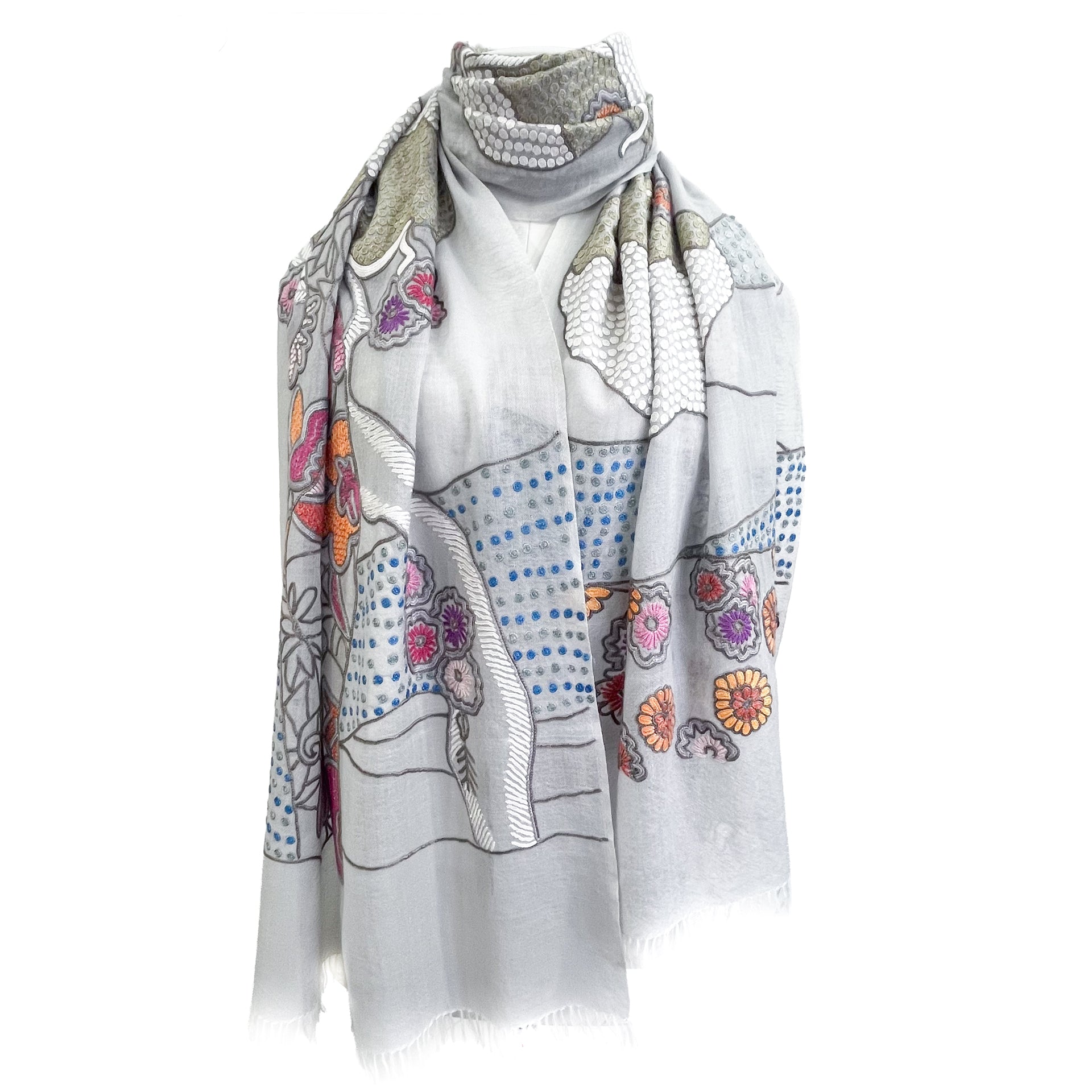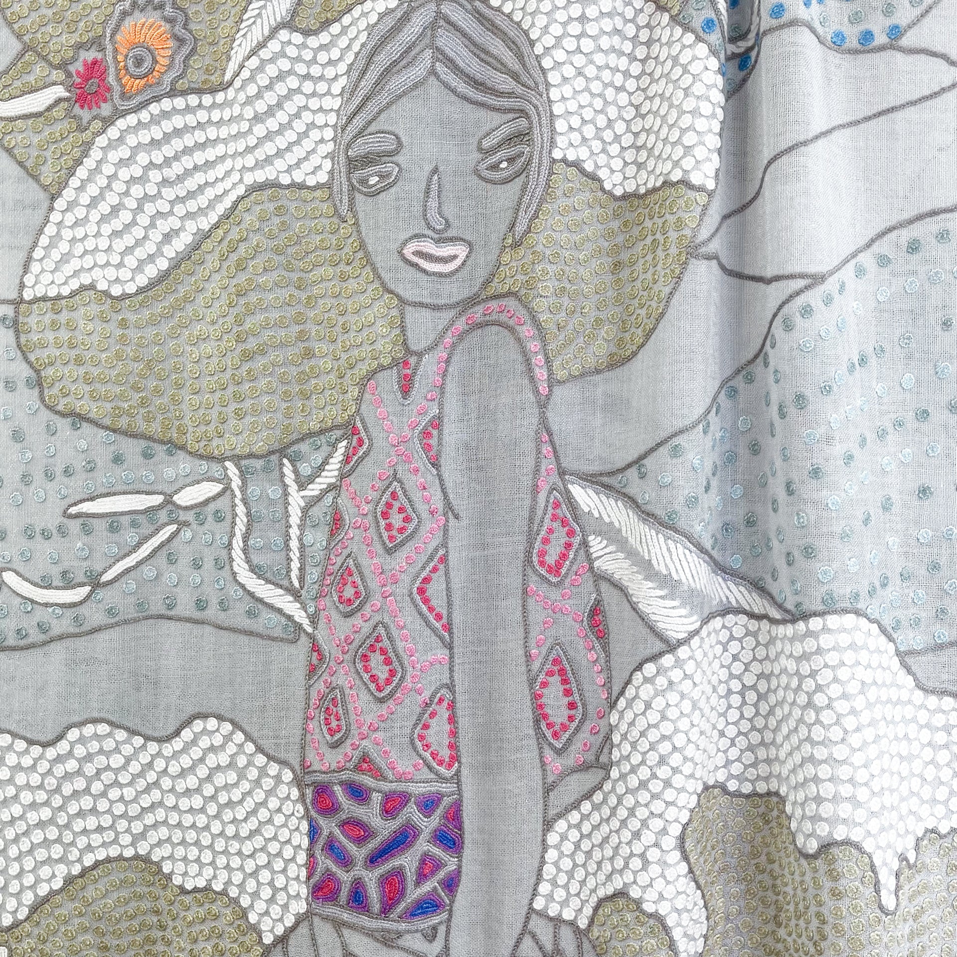 薄手ウール&シルク アリー手刺繍ストール (グレー)