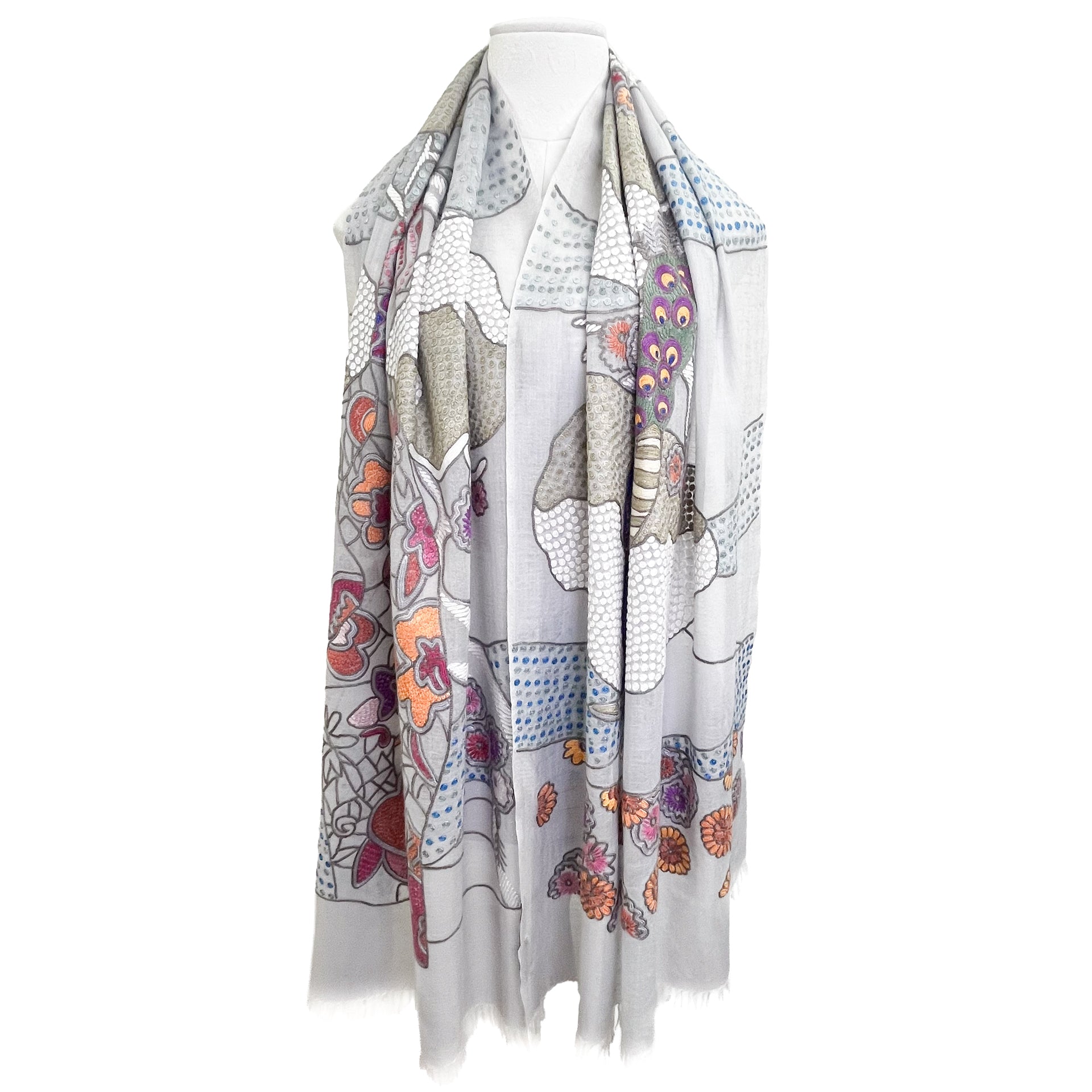 少女と孔雀の美しい佇まいと、ポップなカラーで彩られた花々が調和し、まるで一枚のアートのようなストールです。