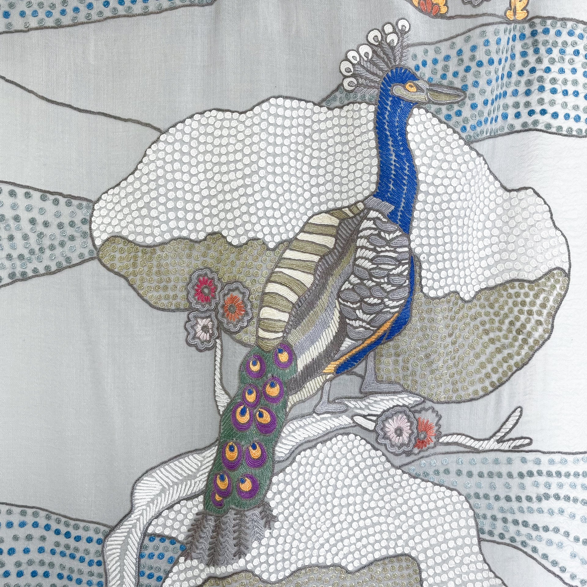 アリー手刺繍で一羽の孔雀と可憐な少女を描いた、華やかで存在感のある一枚。