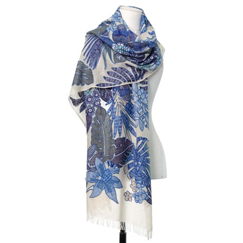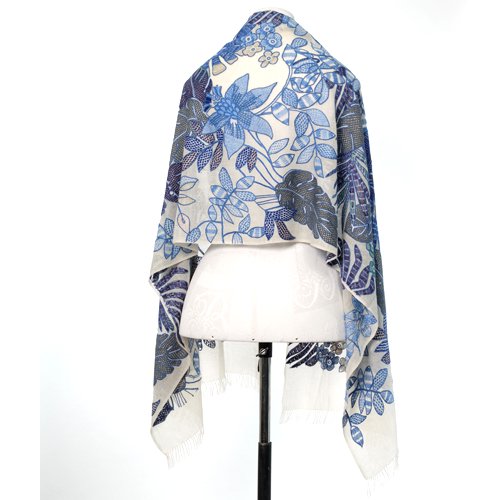 NEW VIVID FLOWERS薄手ウール&シルク アリー手刺繍ストール (ホワイト/ブルー)
