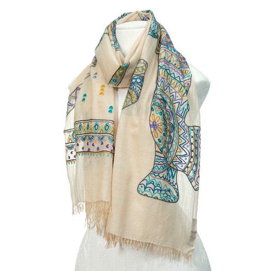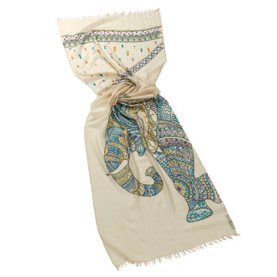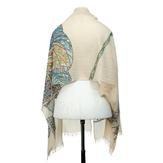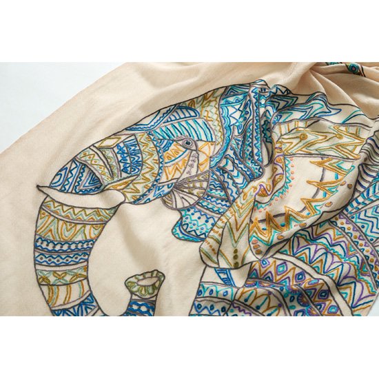 エレファント ウール&シルク アリー手刺繍ストール (ライトベージュ)